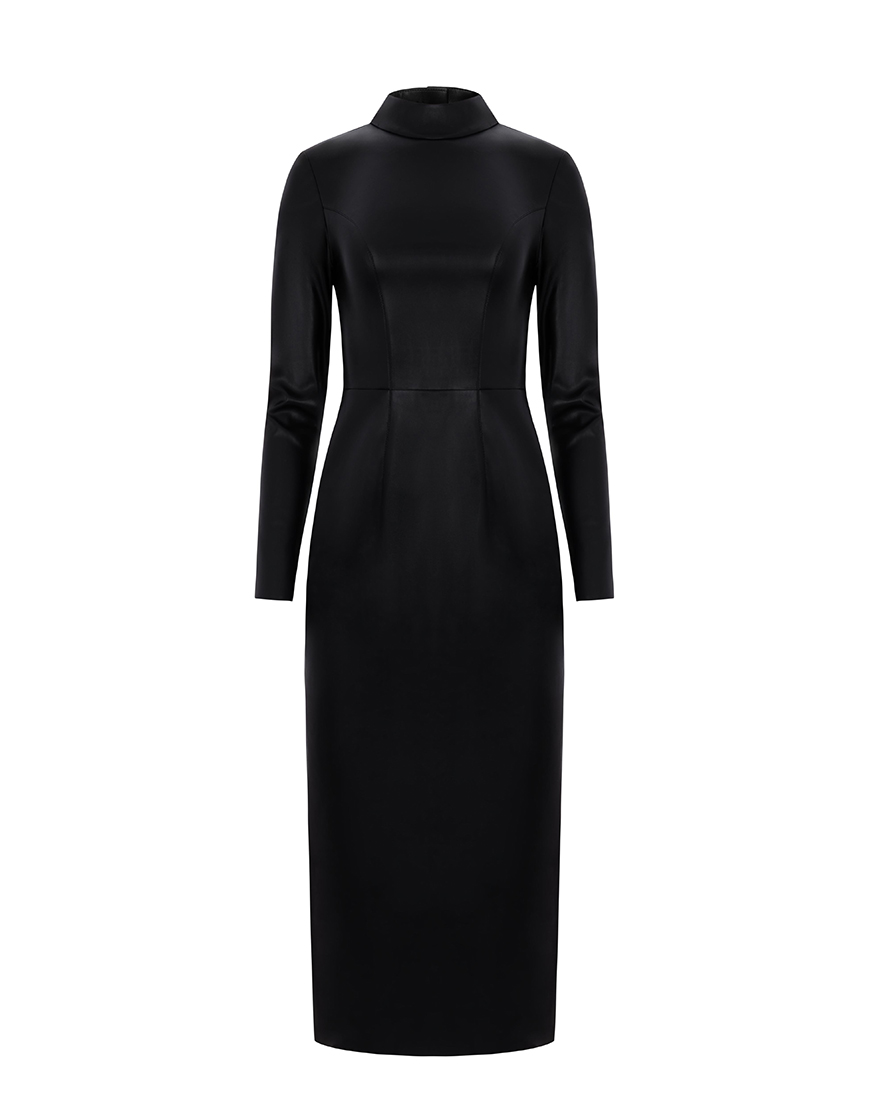 Сукня з еко-шкіри в цьому образі — це стильне, сучасне та елегантне рішення. Сукня має довгі рукави й високий закритий комір, що додає образу строгості та витонченості. Облягаючий крій підкреслює силует. Сукню легко стилізувати з різноманітними аксесуарами. Застібається ззаду на потаємну блискавку.