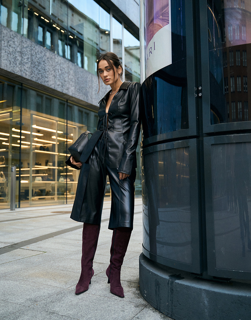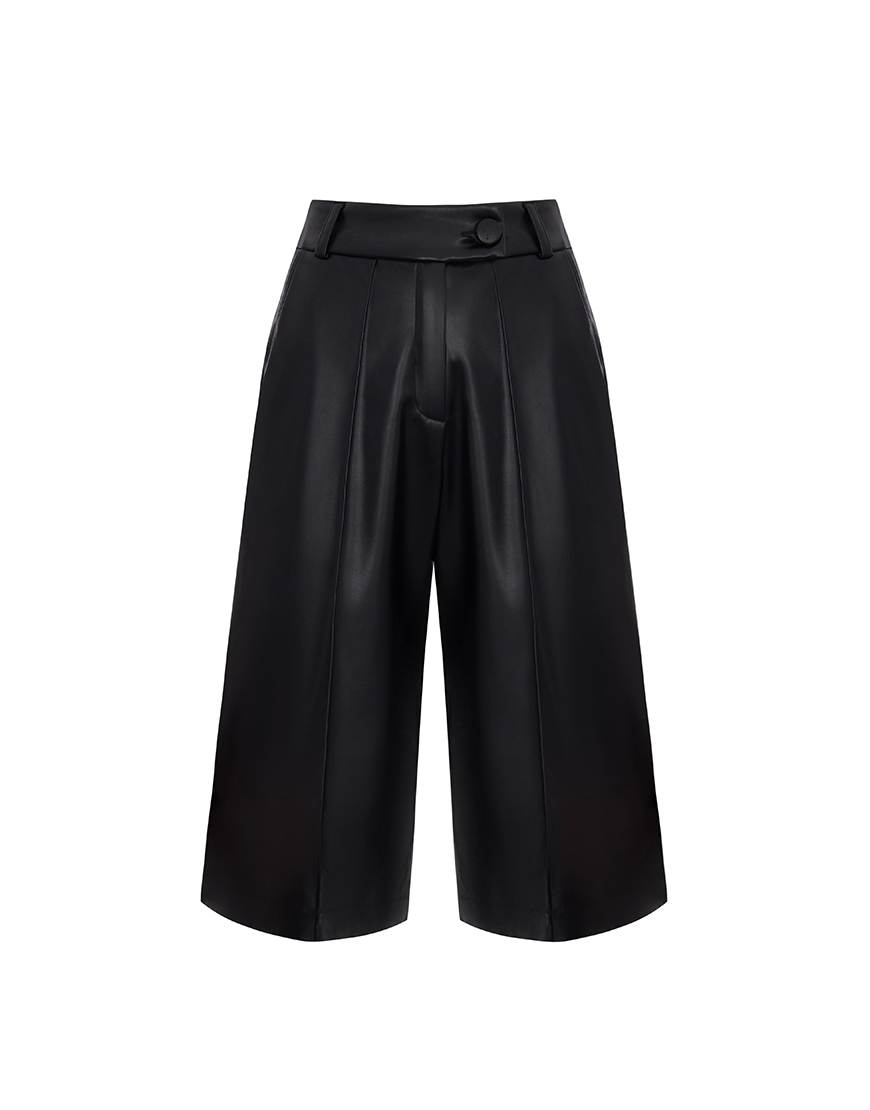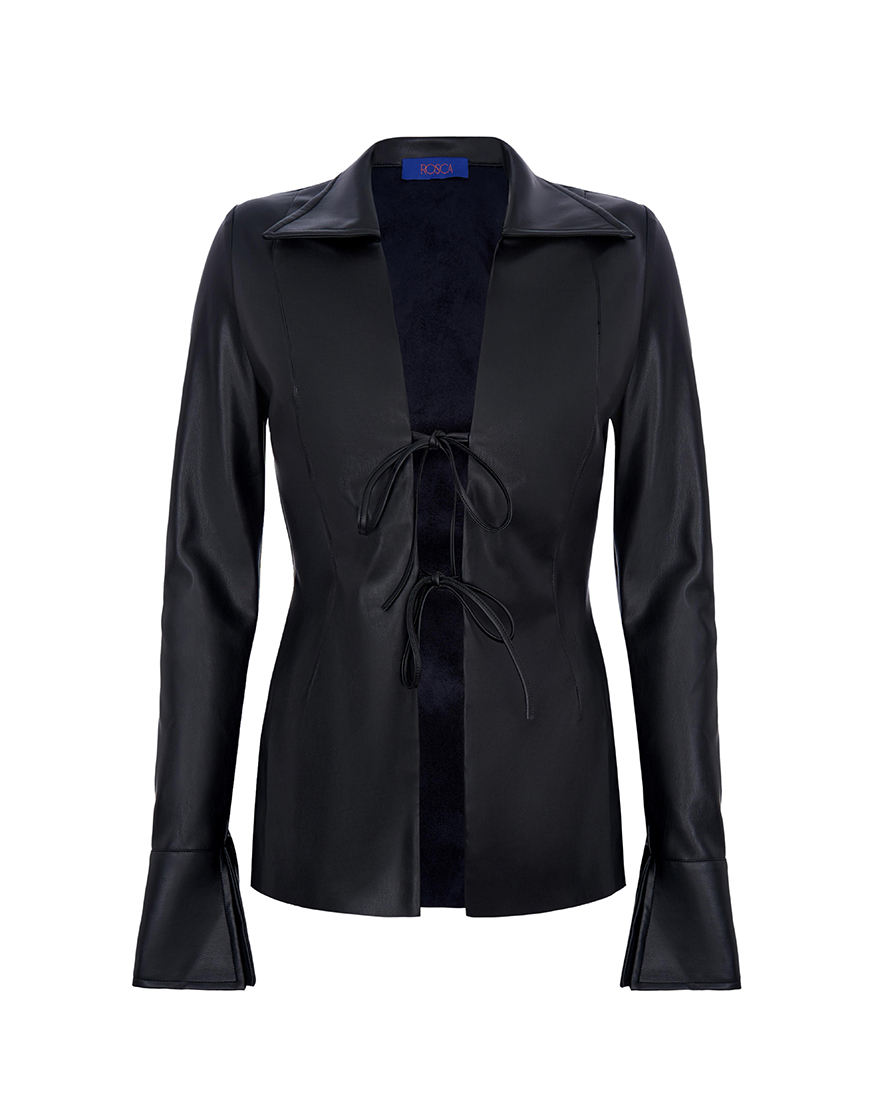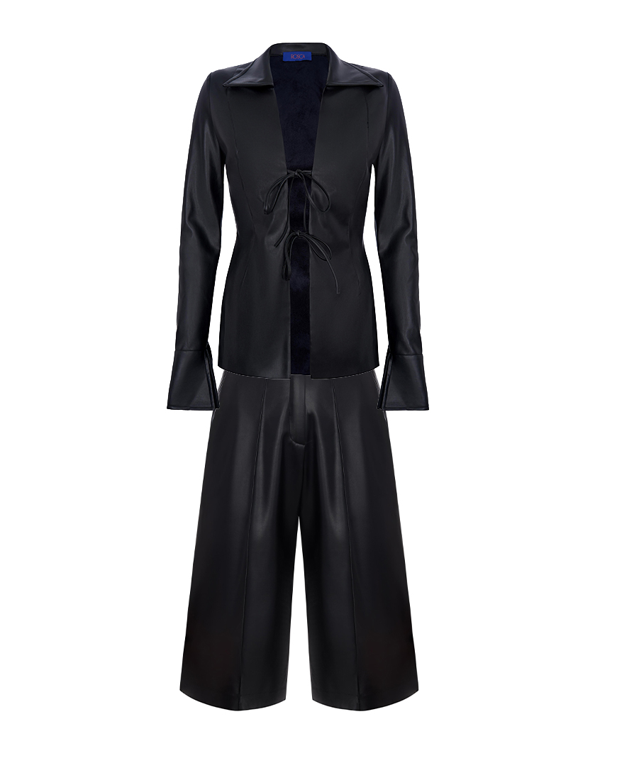 Втілення сучасного мінімалізму та впевненого стилю — костюм з еко-шкіри, що підкорює з першого погляду. Комплект складається з приталеної сорочки з глибоким вирізом і трендовими зав’язками спереду, які підкреслюють фігуру, додаючи образу нотку звабливості. Довгі рукави з широкими манжетами додають елегантності та балансують відкриту верхню частину.