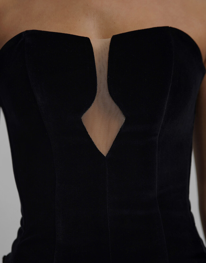Корсет чорного кольору виготовлений з оксамиту високої якості на підкладці, з шнуруванням на спині. Всередині вставлені кісточки для ідеальної фіксації.