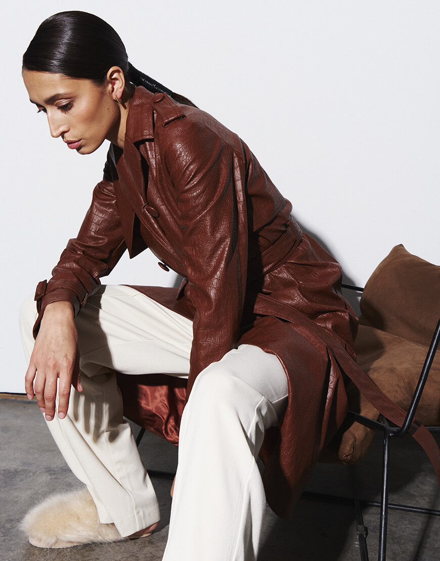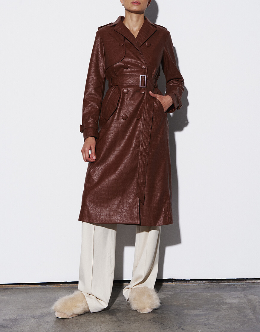Двобортний тренч з еко-шкіри коричневого кольору. Гармонійно буде виглядати як з джинсами, так і з більш класичними образами. Модель доповнена оригінальними елементами на рукавах і плечах, а пояс дозволяє зробити акцент на талії, щоб силует став ще більш жіночним. Довжина виробу 113 см.