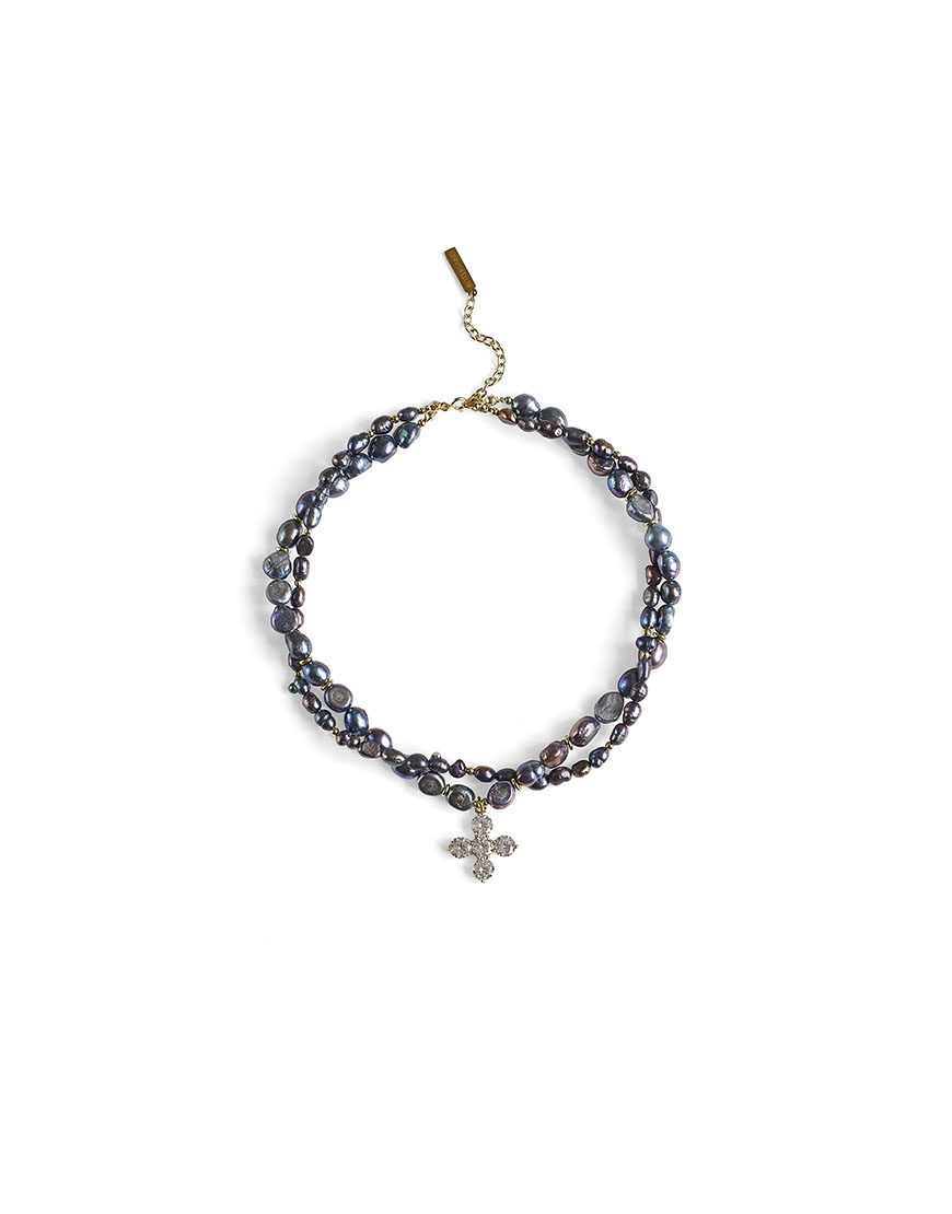 Доставка впродовж 3-5 робочих днівКольє – чокер з натуральних річкових перлин темного кольору з дуже красивим переливом відтінків. Хрестик інструктований фіанітами.