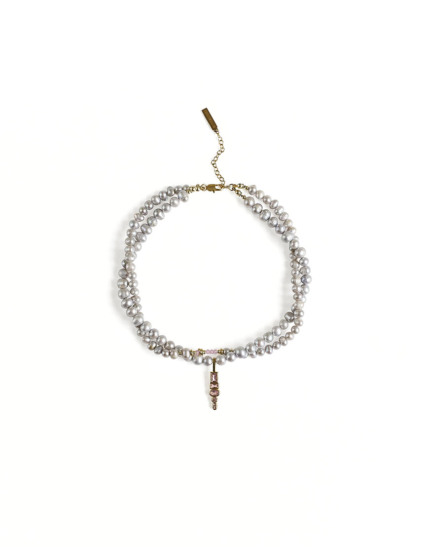Доставка впродовж 3-5 робочих днівКольє з натуральних річкових перлин сірого кольору, переплетених між собою. Вставка з цирконів рожевого кольору