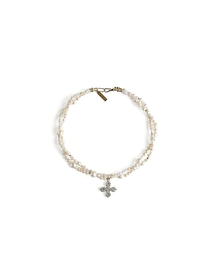 Доставка впродовж 3-5 робочих днівКольє з натуральних річкових перлин білого кольору, переплетених між собою. Більше чотирьох різновидів форми та розміру в одному кольє. Вставка хрестик – інструктована фіанітами білого кольору