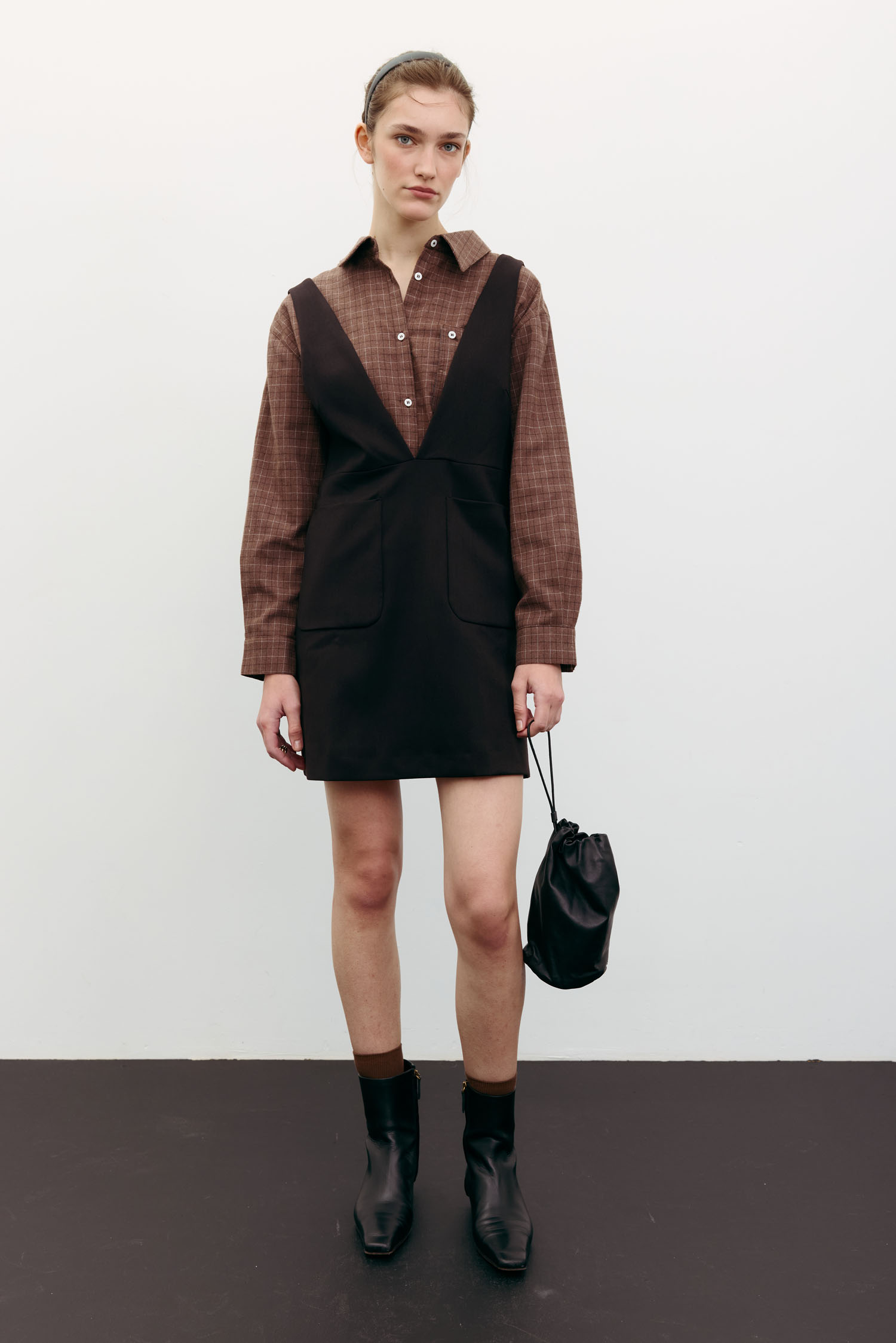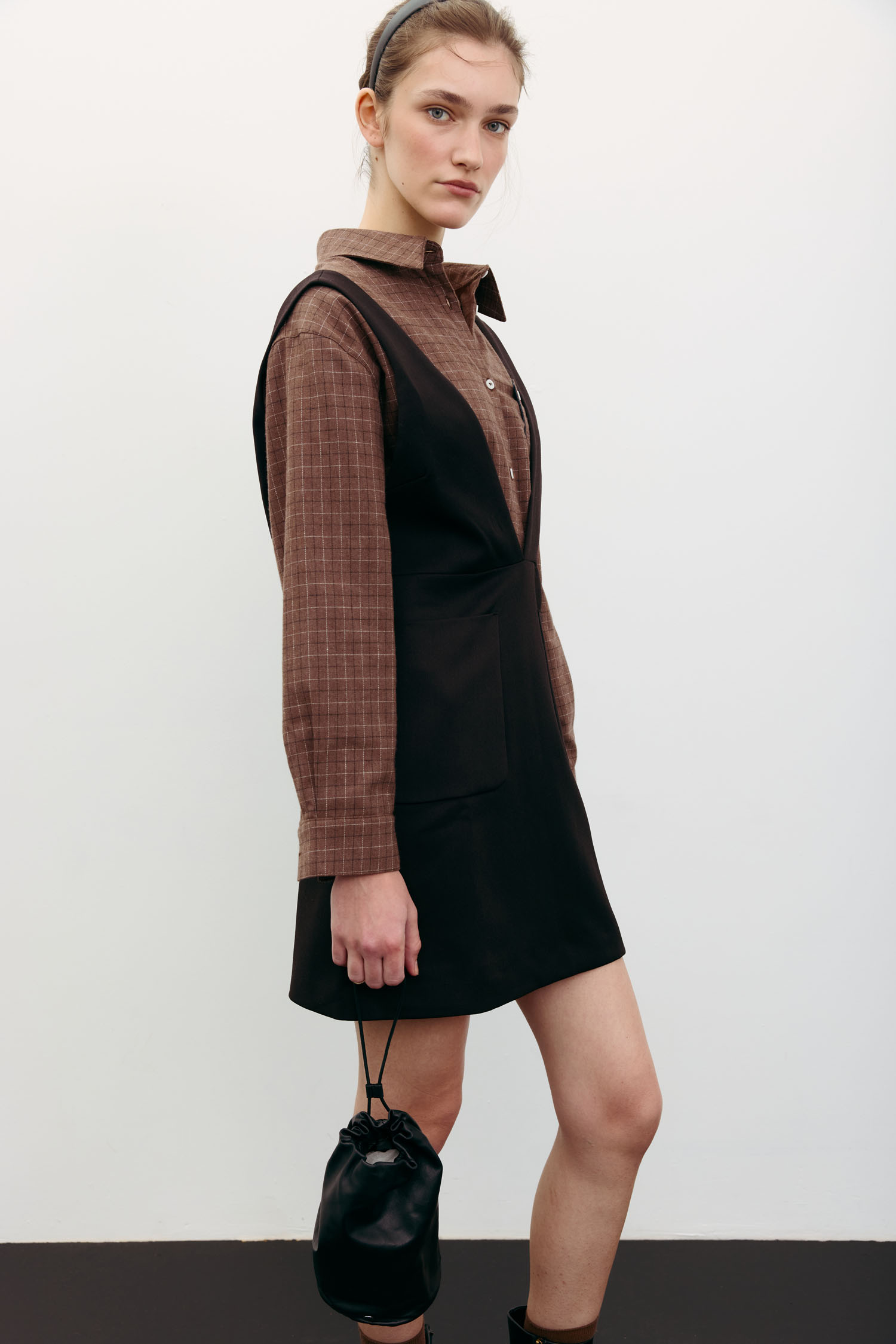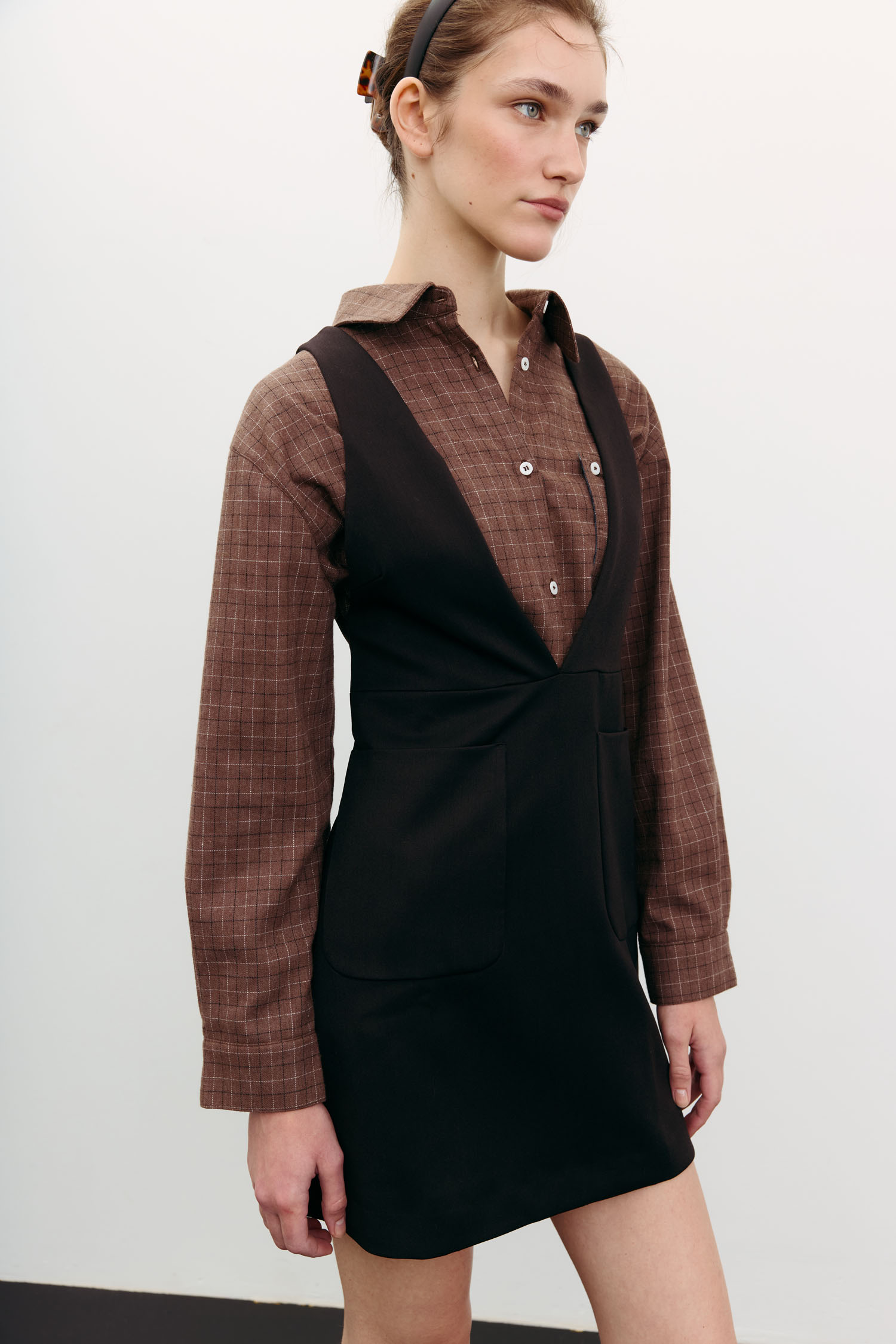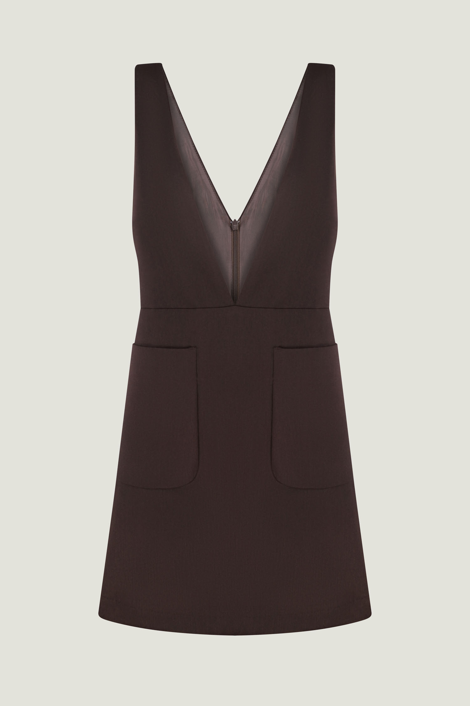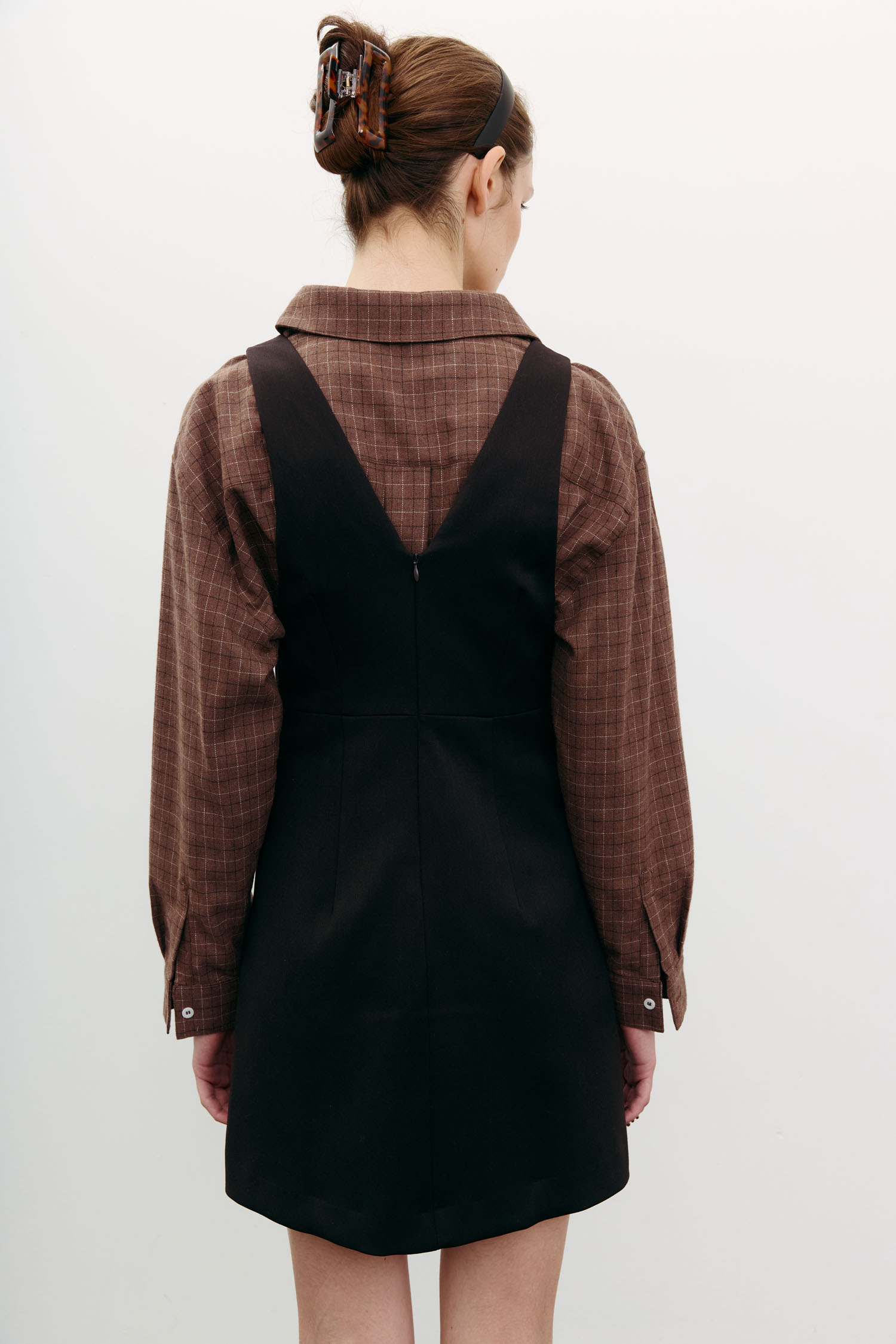 Сарафан міні в насиченому шоколадному відтінку. Виконаний із щільної костюмної тканини, яка надійно тримає форму. Стає нестандартною заміною класичній спідниці міні. Стилісти The Lace радять комбінувати його з трикотажними светрами, сорочками та лонгслівами.