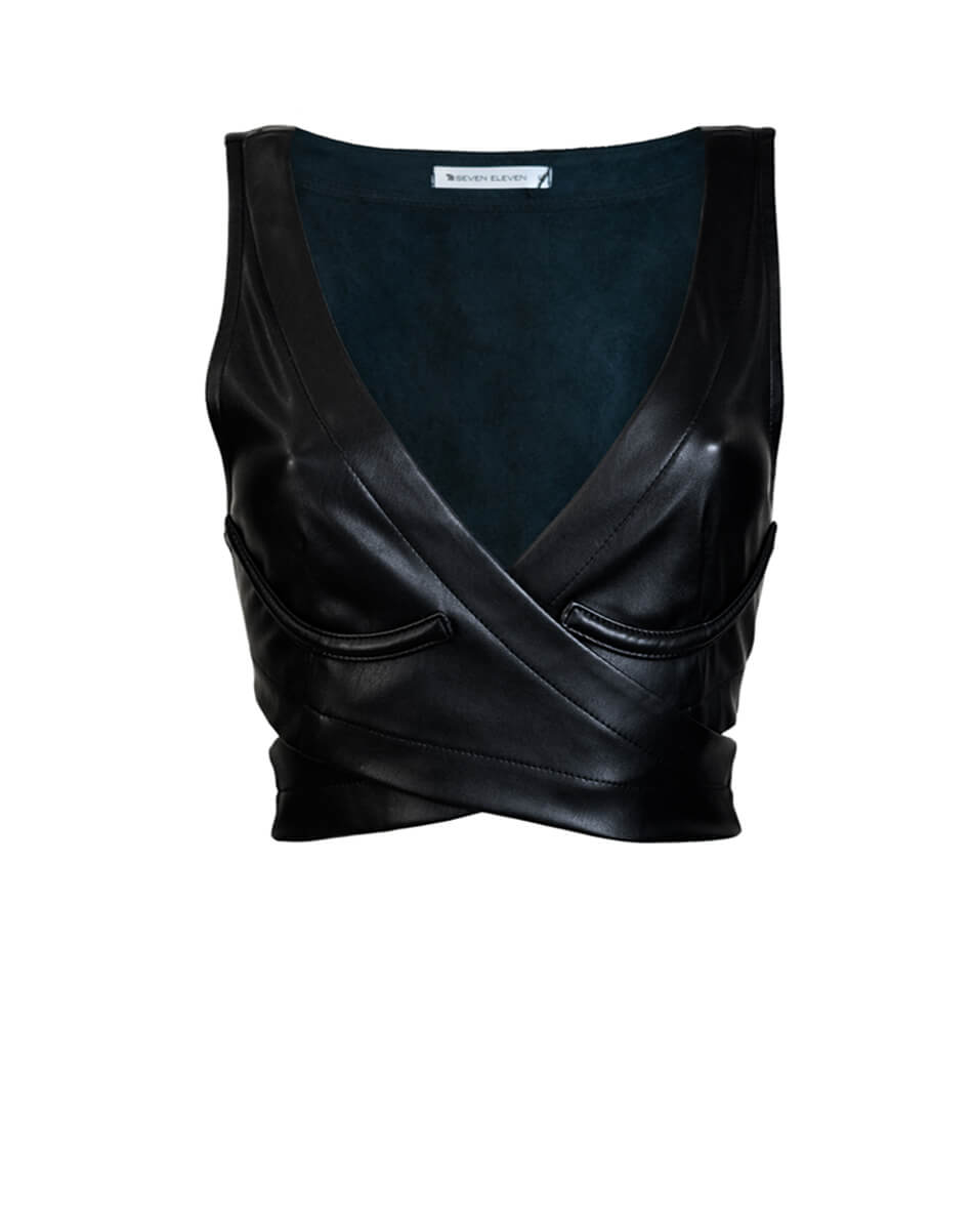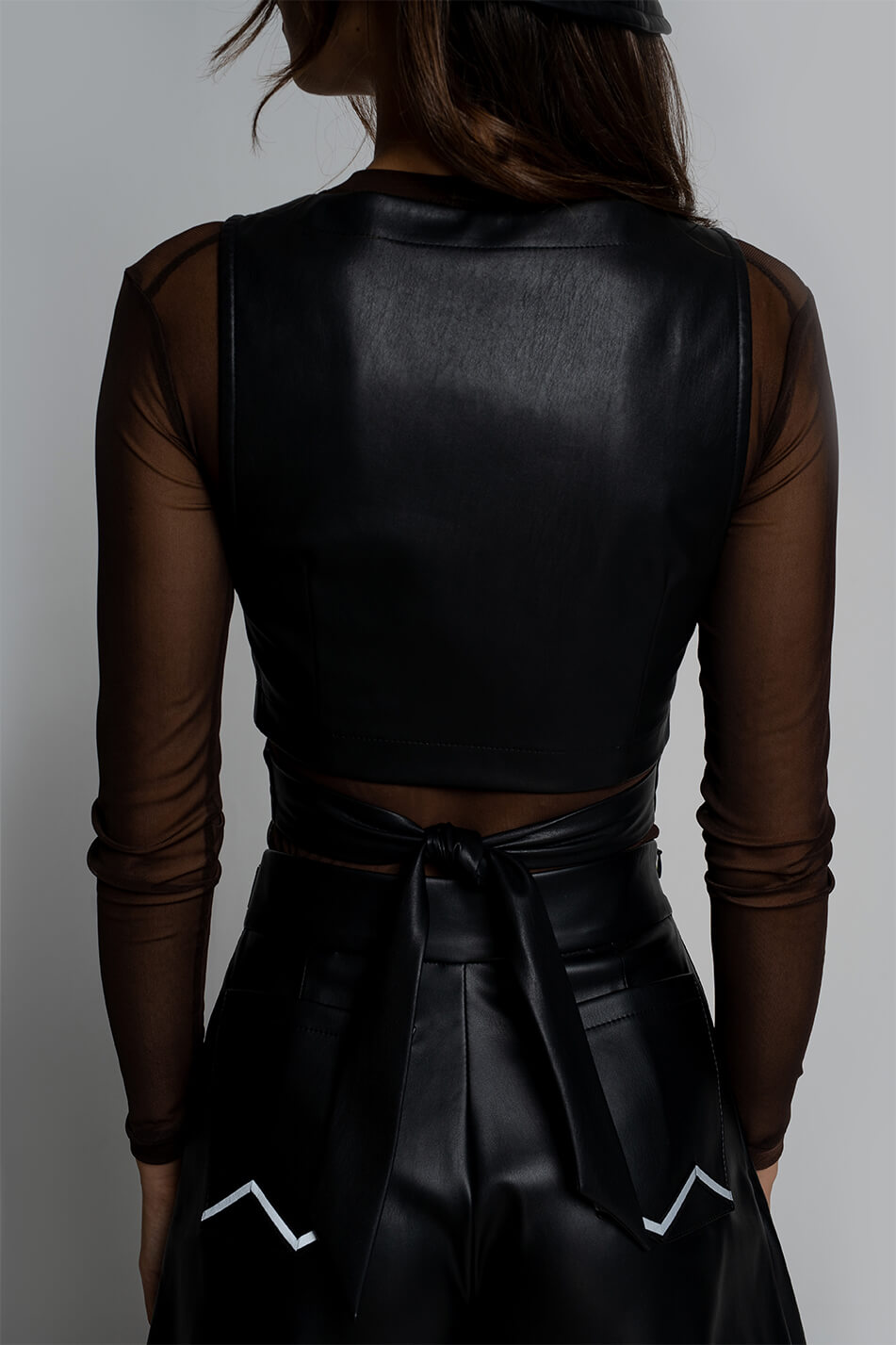 Доставка впродовж 2-5 робочих днівТоп на запах з Y-подібним вирізом, виконаний з еко-шкіри, на зав’язках. У вигляді декору настрочені тунелі, що імітують кісточки бюста. Носити можна окремо, як топ, а можна надягати поверх світшота, піджака, сорочки.