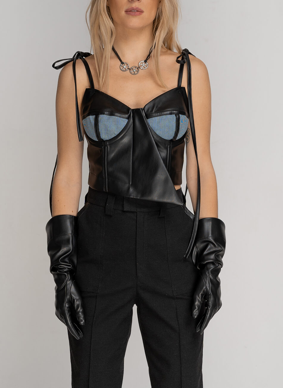 Доставка впродовж 2-5 робочих днівКорсет-бюстьє з чашками на кісточках, виконаний з веганської шкіри. Нижня частина чашки виконана з обробної тканини в клітку і декорована смужками з веганської шкіри. Застібка збоку на замку. Бретелі на зав’язках. На поличці є приховані кісточки. Можна носити як бюстьє та як корсет на сорочку, гольф, сукню.