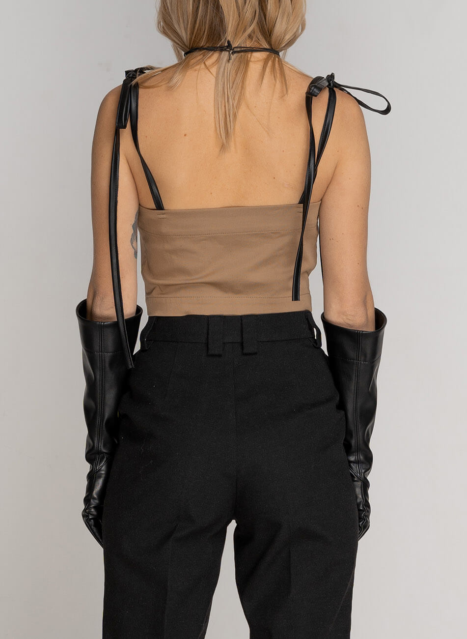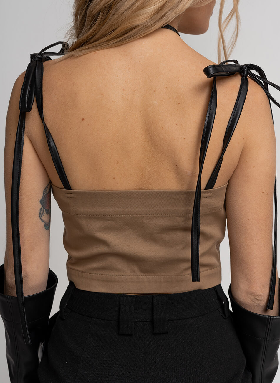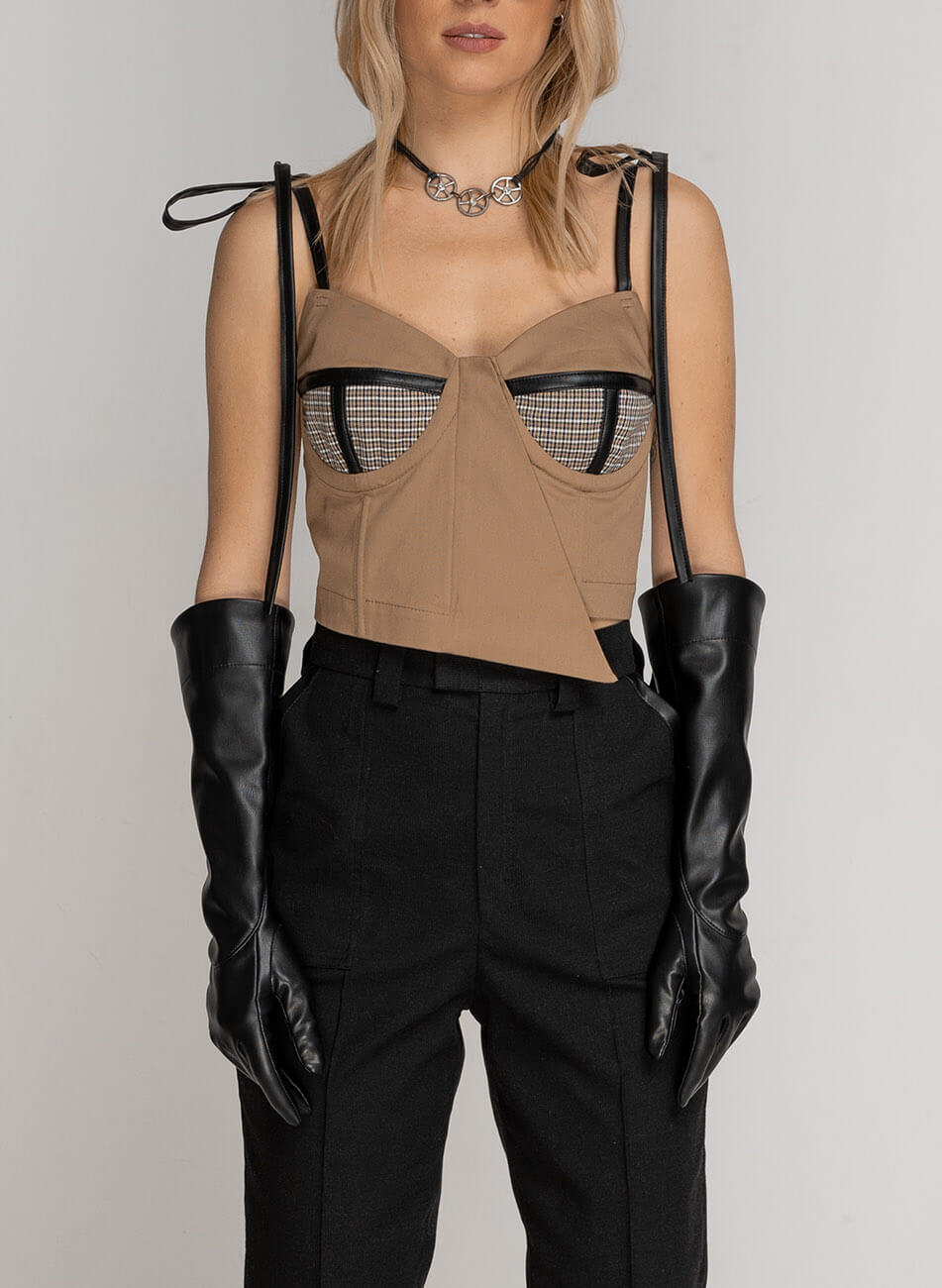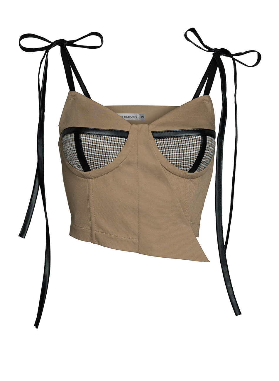 Доставка впродовж 2-5 робочих днівКорсет-бюстьє з чашками на кісточках, виконаний з бавовняної тканини. Нижня частина чашки виконана з обробної тканини в клітку і декорована смужками з веганської шкіри. Застібка збоку на замку. Бретелі на зав’язках, на поличці є приховані кісточки. Можна носити окремо або як корсет на сорочку, гольф, сукню.