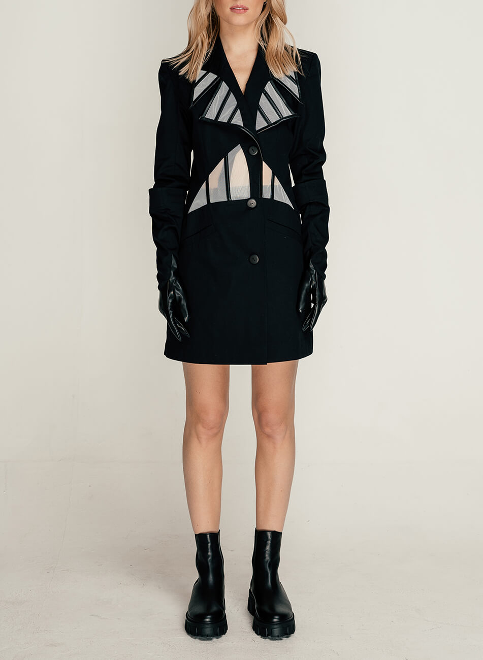 Доставка впродовж 2-5 робочих днівПіджак приталеного силуету з вшивною спідницею всередині виконаний з костюмної тканини на підкладці. Застібка на 3 ґудзики, спідниця всередині на замку. Втачний рукав 3/4 з відстібними рукавичками. Відкладний комір та частина полички декорована прозорою сіткою з шкіряними смужками.