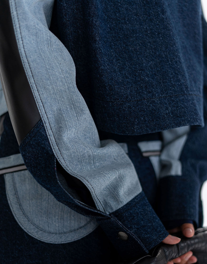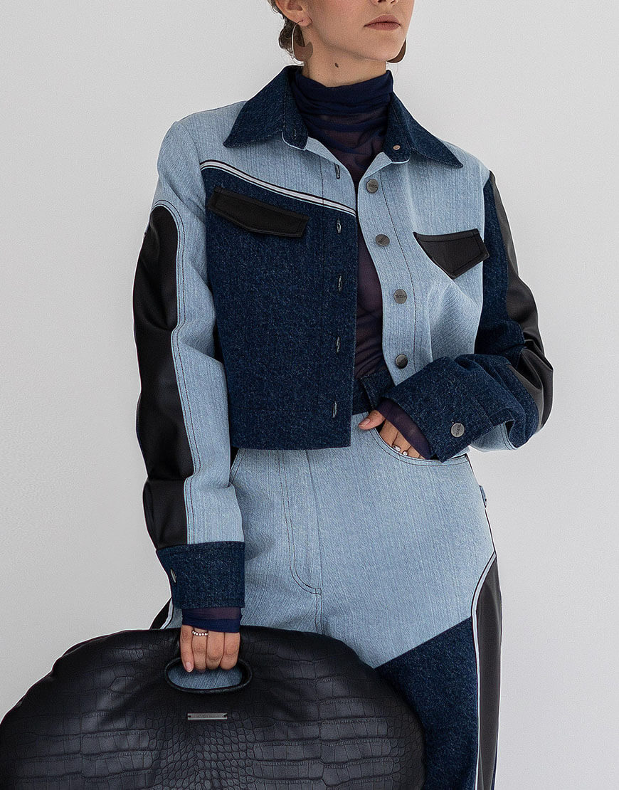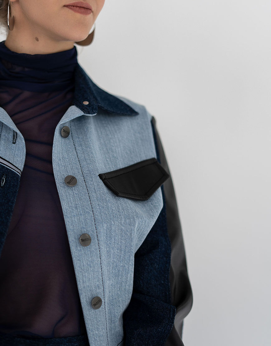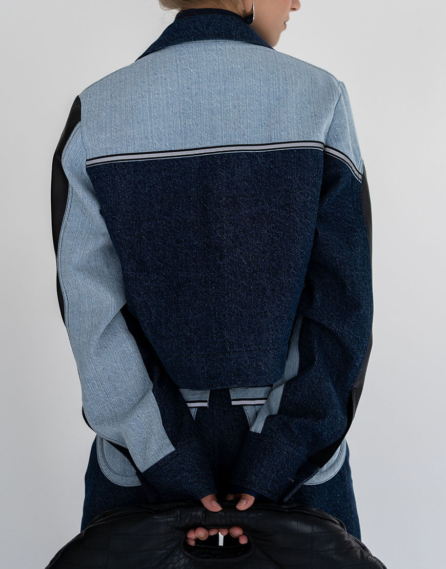 Доставка впродовж 2-5 робочих днівКуртка рівного силуету, виготовлена з деніму світлих і темних кольорів та чорної веганської шкіри, довжиною до талії. Має комір сорочки, застібається на кнопки, довгий рукав. Куртка додатково декорована світловідбиваючою стрічкою, яка надає їй стильного і сучасного вигляду і робить вас видимими в темний час доби.