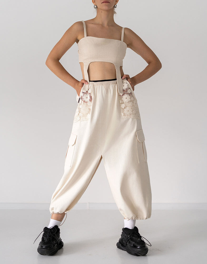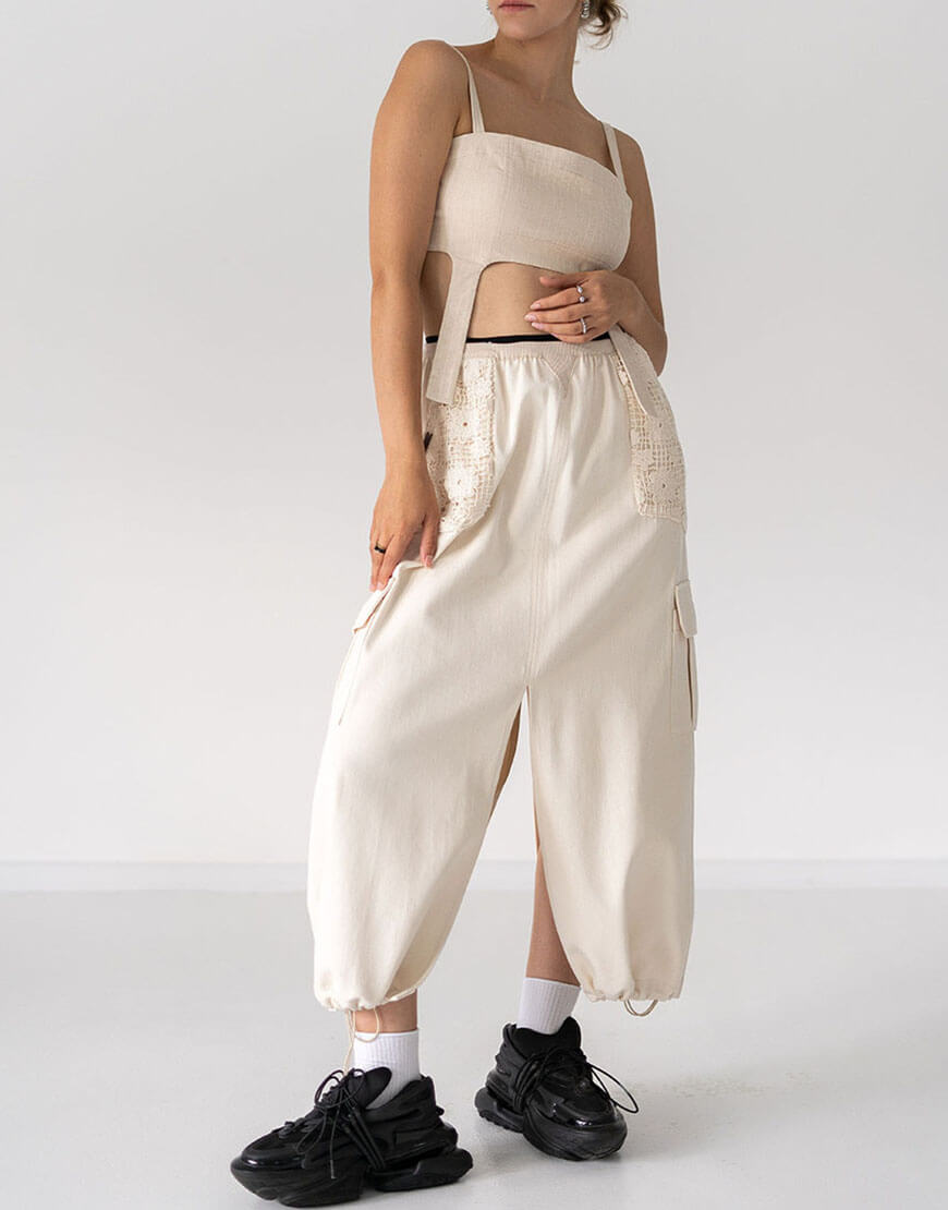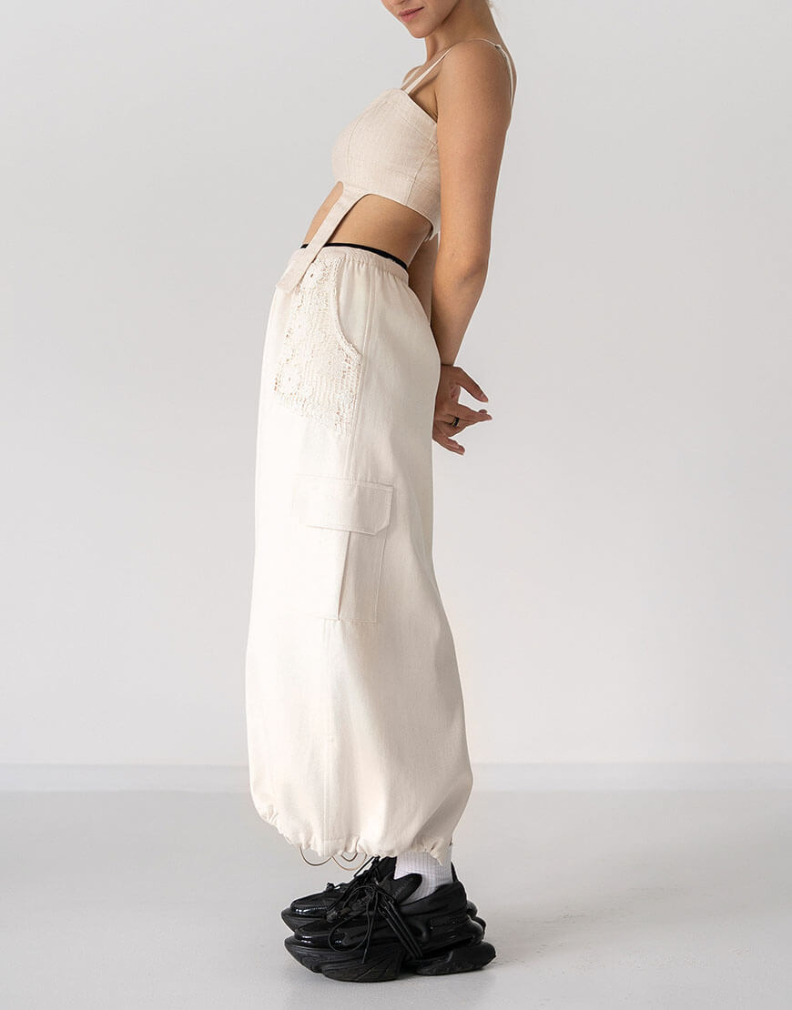 Доставка впродовж 2-5 робочих днівСпідниця міді А-силуету зроблена зі 100% бавовни. Зручний пасок під резинку дозволяє експериментувати з посадкою на талії, надаючи вибір між класичною посадкою чи трошки нижче для більшого комфорту. Накладні кишені з мережива, створюють цікавий контраст з додатковими бічними кишенями, асоційованими із стилем карго-штанів. По переду і сзаду розрізи, по низу є додатковий шнур, який регулює об’єм.