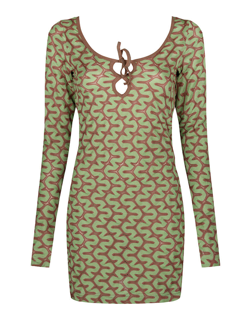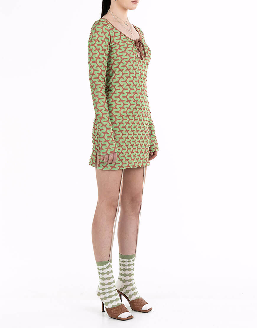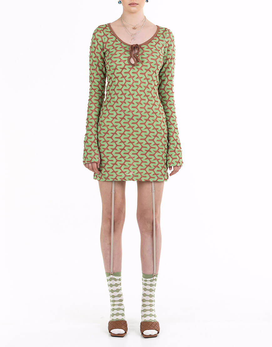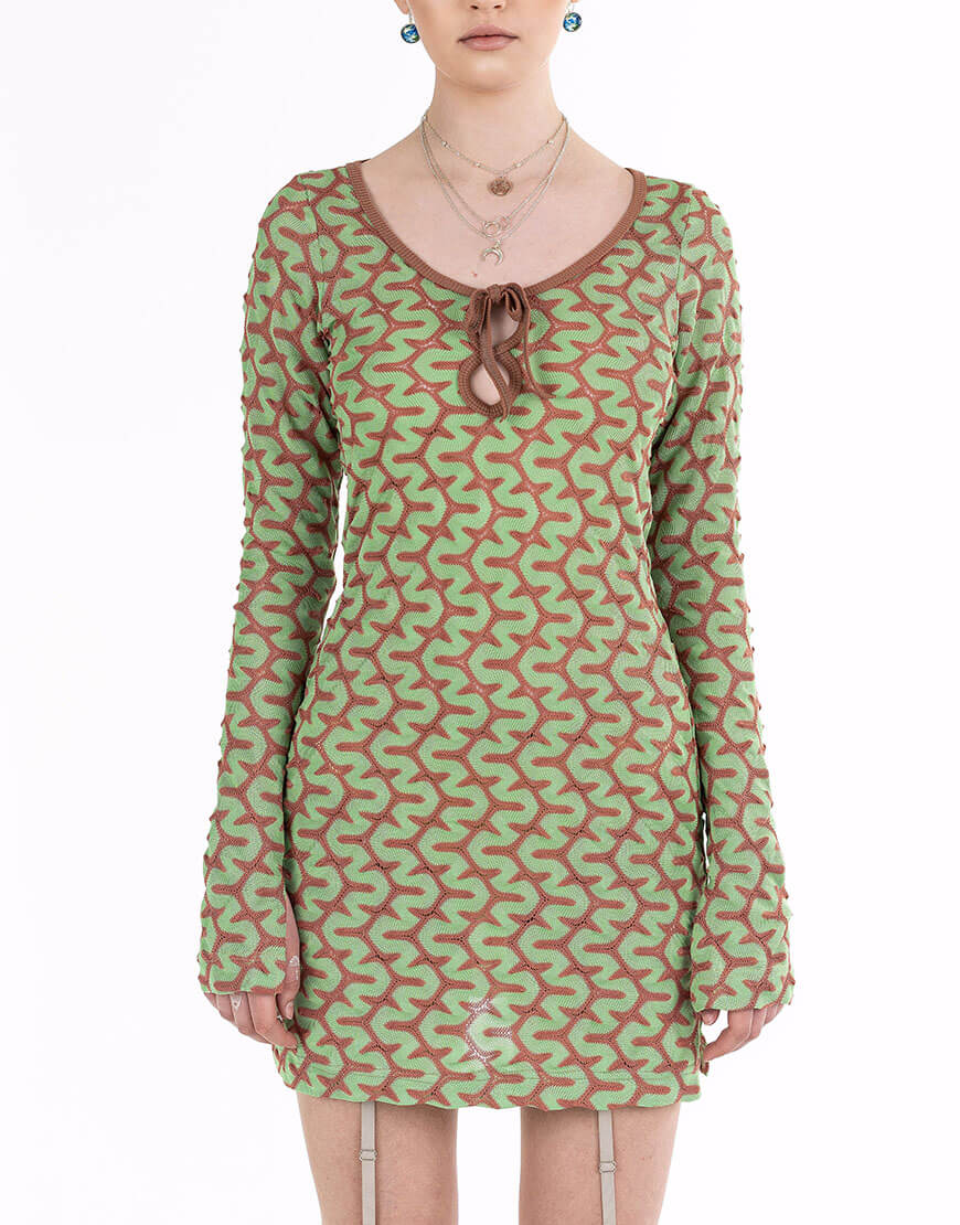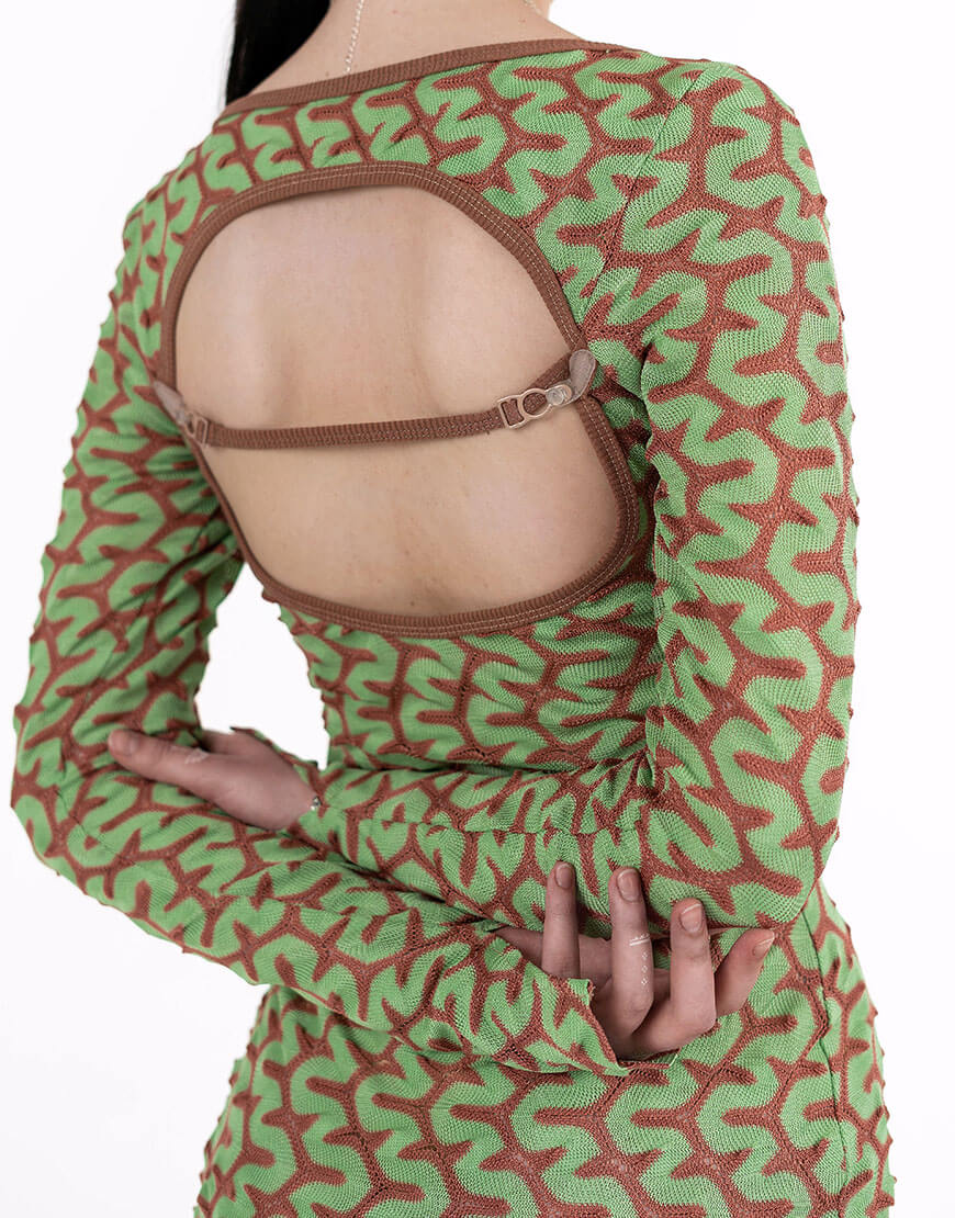 Доставка впродовж 2-5 робочих днівМіні-сукня приталеного силуету з м’якого трикотажу. Вона має довгі рукави з розрізами, які додають грайливий акцент, і бічні розрізи, які забезпечують свободу рухів. Великий виріз ззаду привертає особливу увагу, створюючи привабливий і спокусливий вигляд.