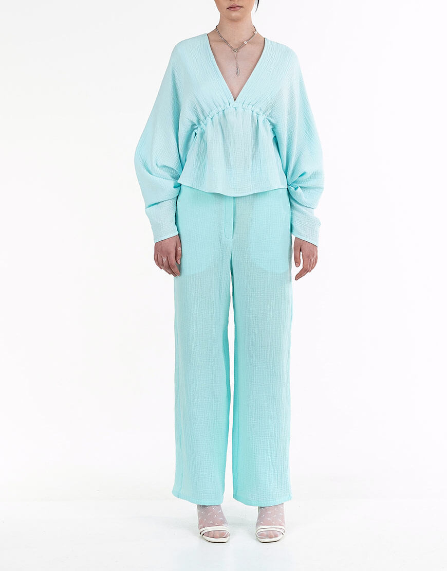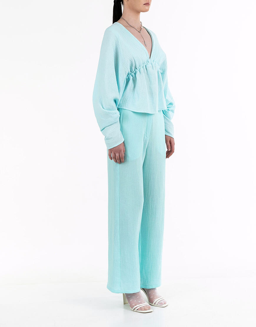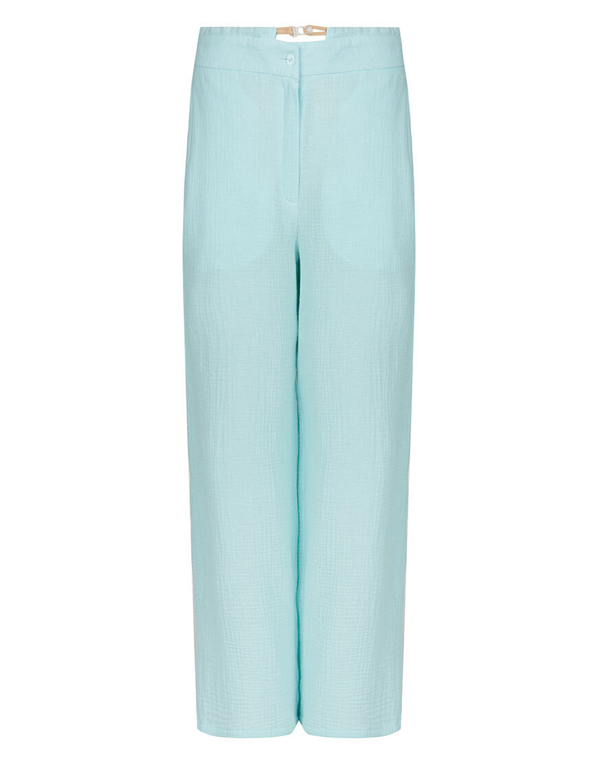 Доставка впродовж 2-5 робочих днівШтани з прямим кроєм виготовлені з легкої літньої тканини. Мають високу посадку, застібку на блискавці та додатковий шнурок-резинку. Також є кишені.