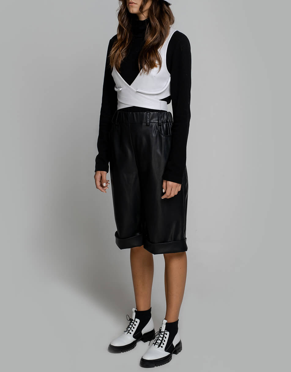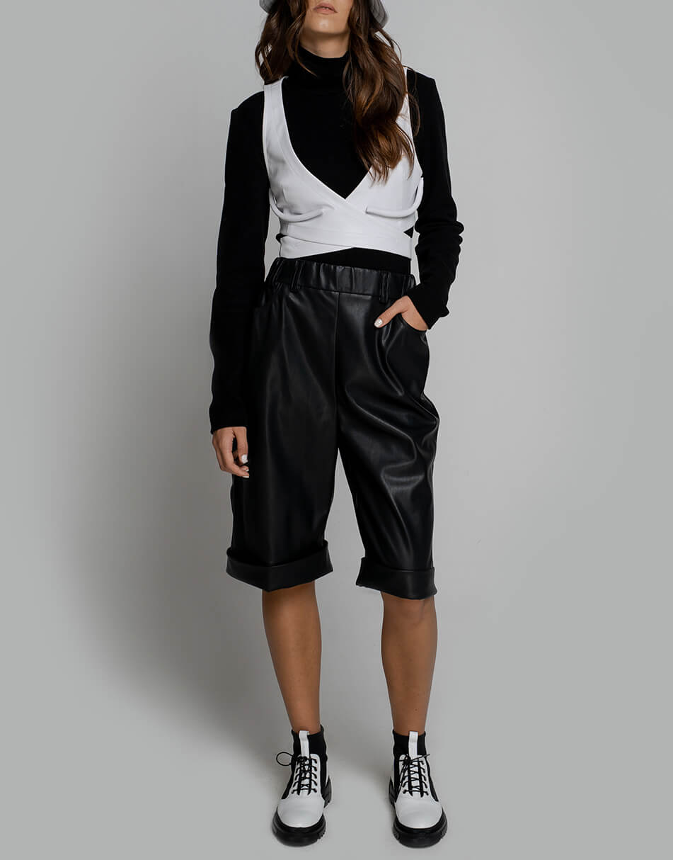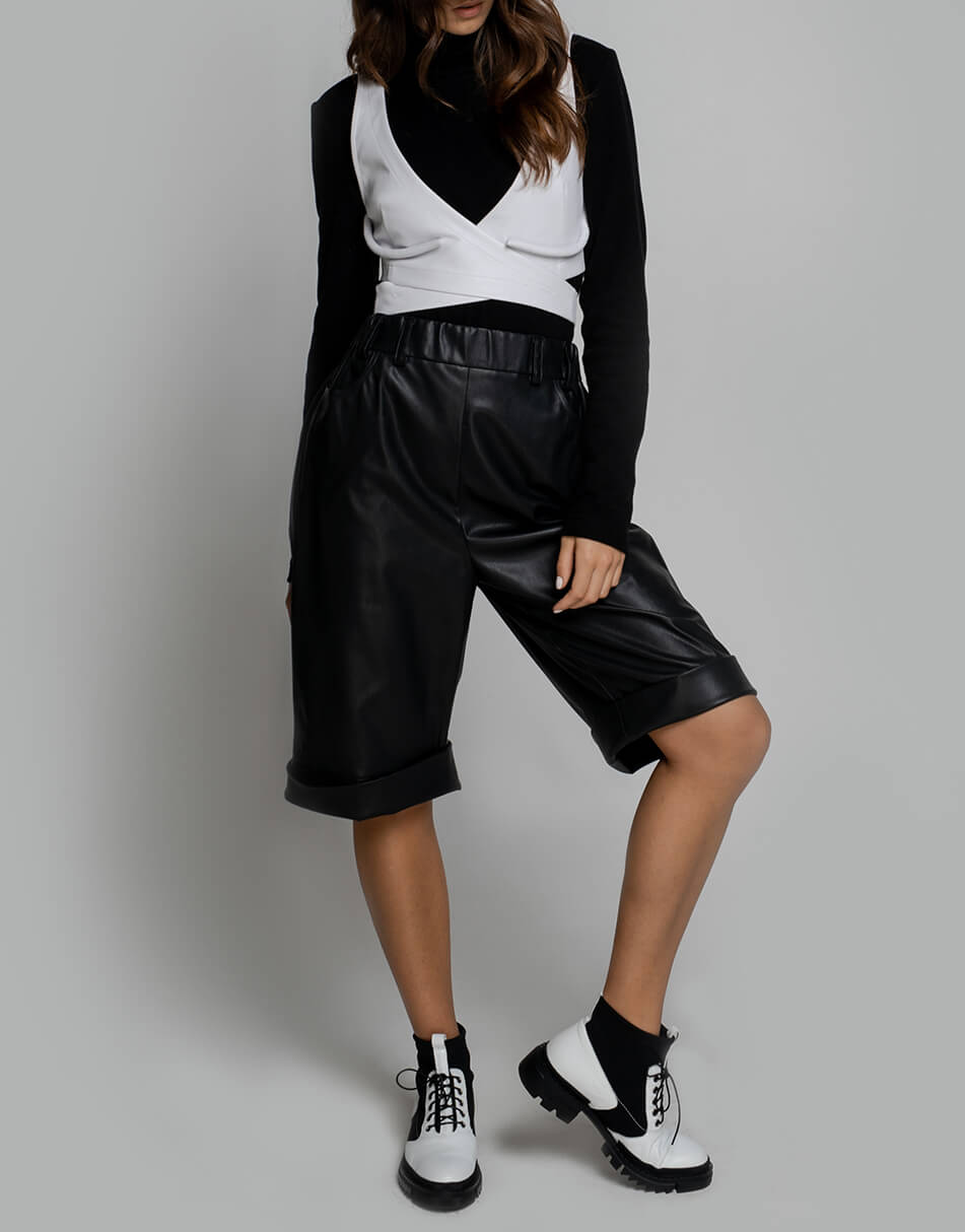 Доставка впродовж 2-5 робочих днівШорти з еко-шкіри чорного кольору. По боках кармани. Застібка на замку.