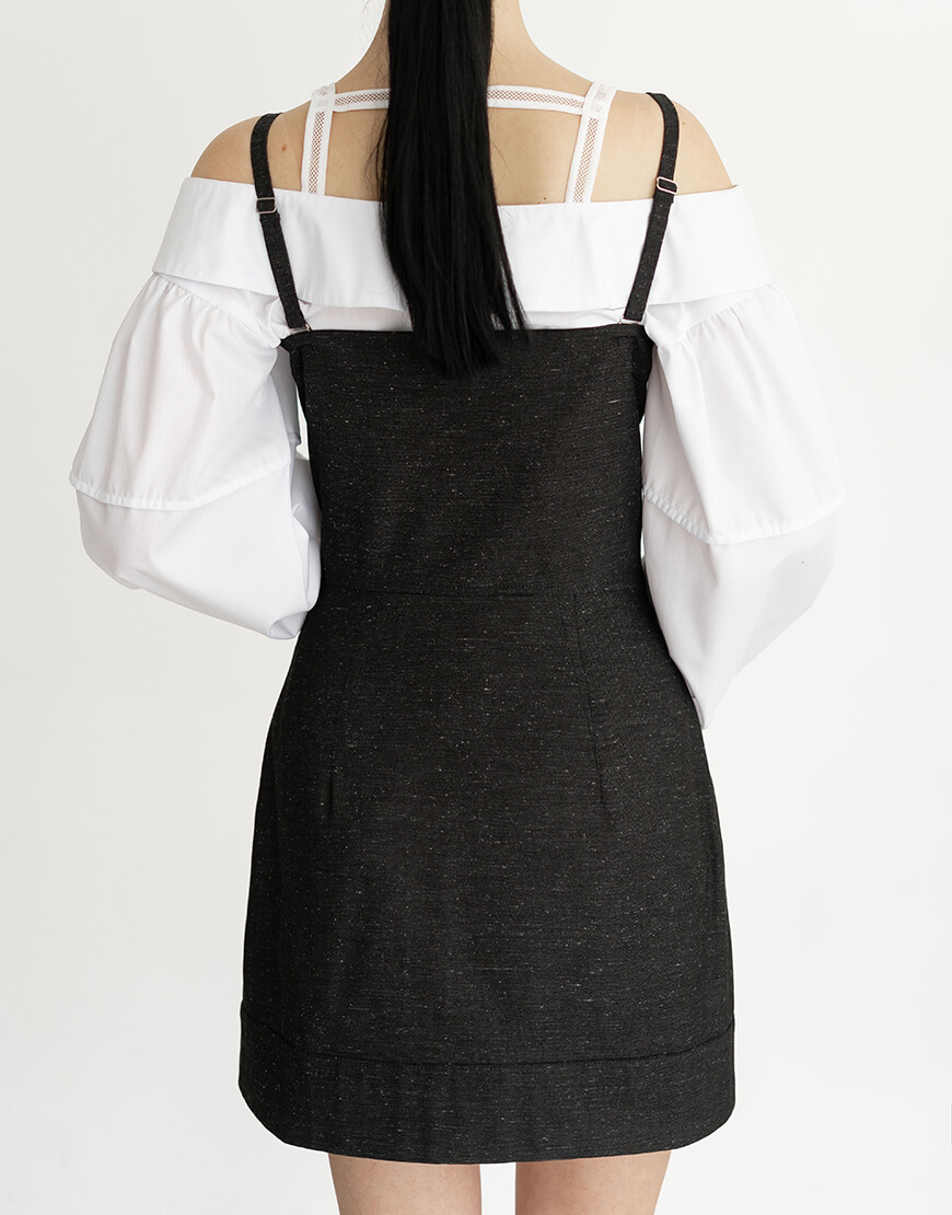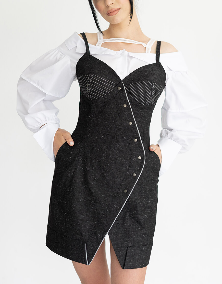 Доставка в течение 2-5 рабочих днейСукня-сарафан приталеного силуету, виготовлена з бавовняної тканини. Асиметрична застібка запах на кнопки. Бретели регулюються за довжиною. З відрізними чашками, що нагадують корсет-бюст. Дві кишені.
