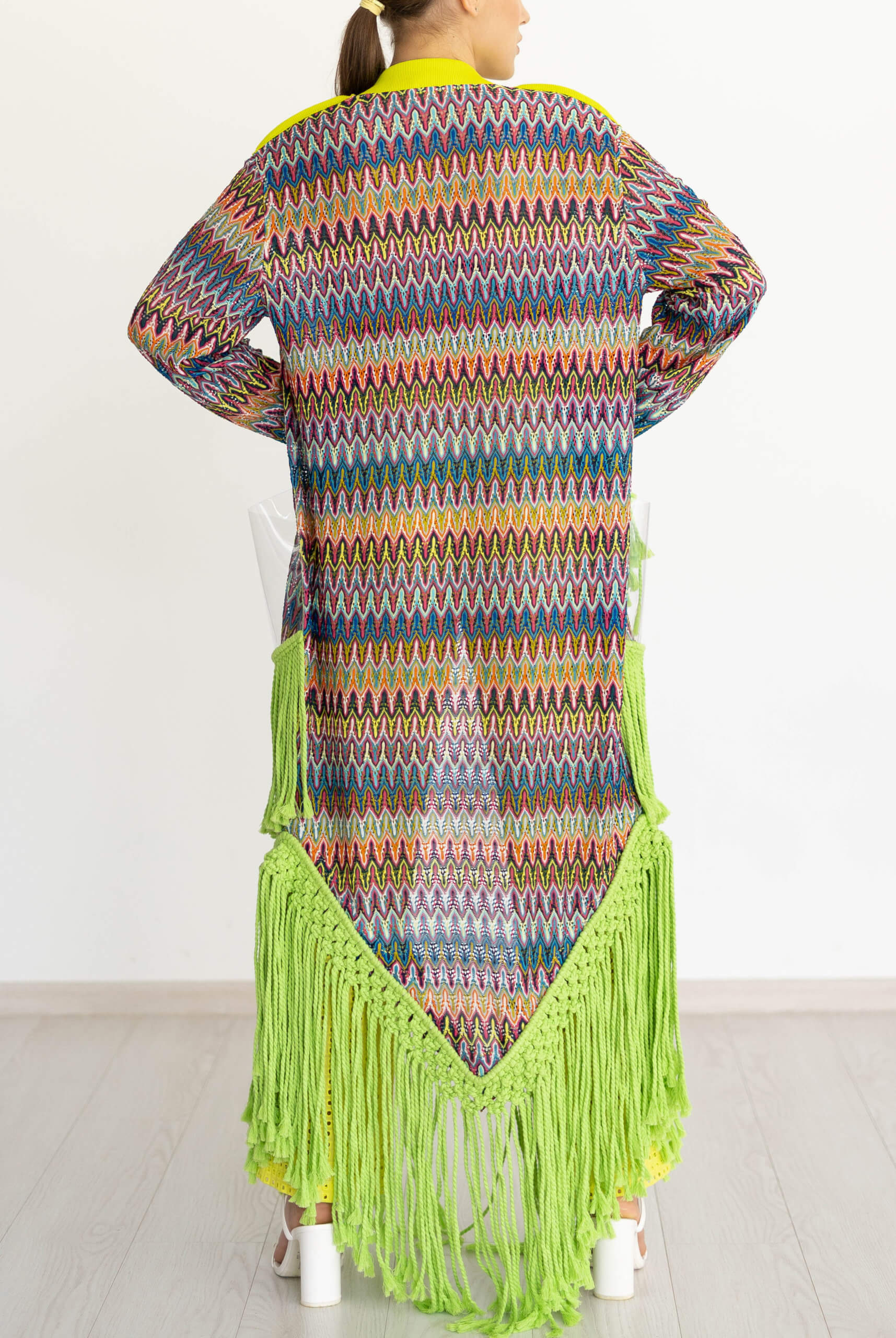 Мантія з бахромою зроблена з трикотажного полотна. Комір стійка. Має прозорі кармани з ПВХ. Декорована бахромою на рукавах, карманах і по низу.