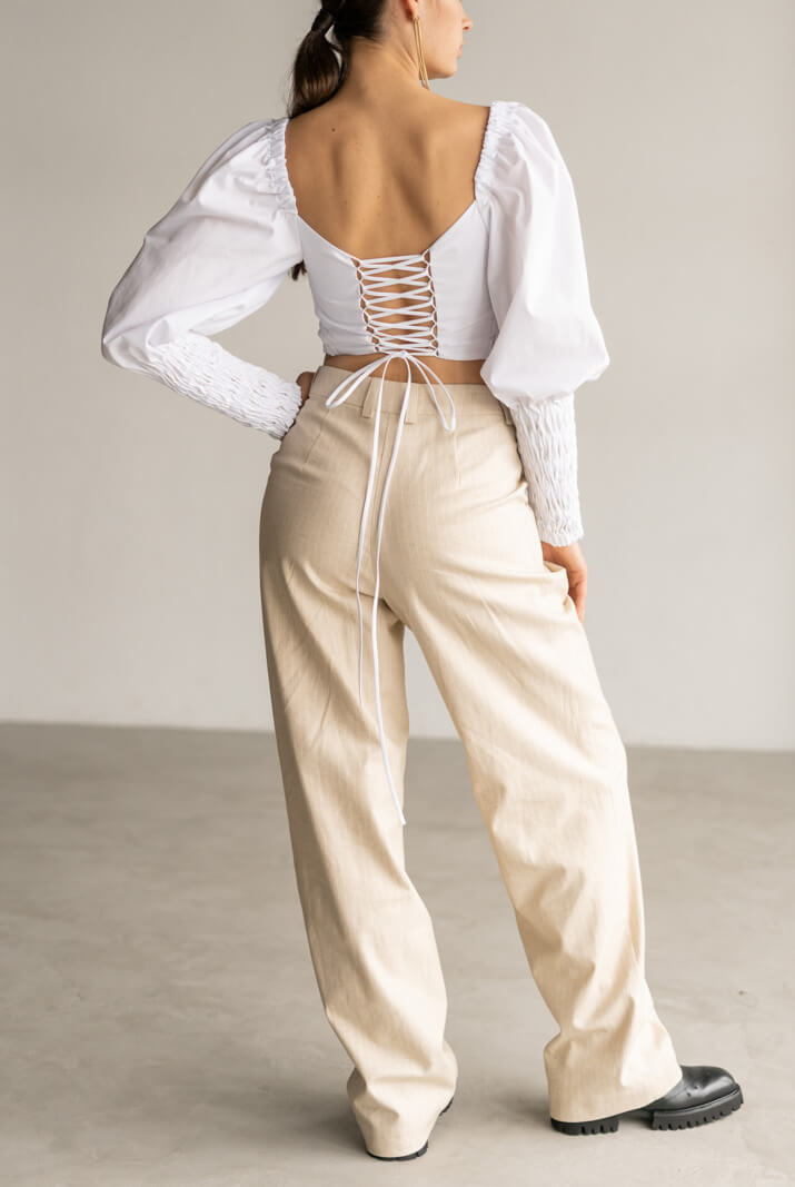 Штани рівні виконані з літньої костюмної тканини. Висока посадка, бічні кишені, є шльовки під ремінь.