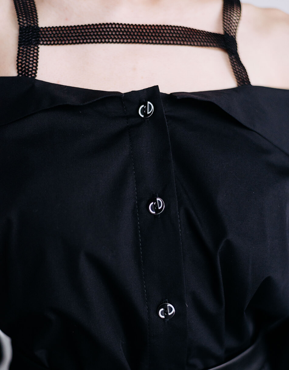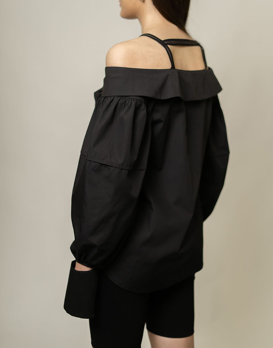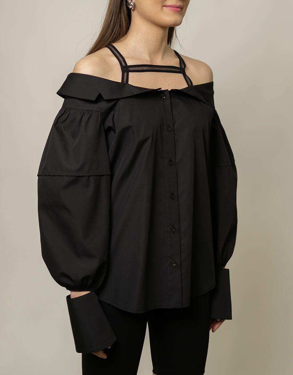 Блуза рівного силуету з відкритими плечима. Застібка на ґудзики. По лінії декольте відкладний комір. Також декоративні бретелі, які не дадуть блузці спадати, зроблені для зручності з декоративної гумки. Широкий фантазійний рукав з манжетою, закріпленою на шві рукава.