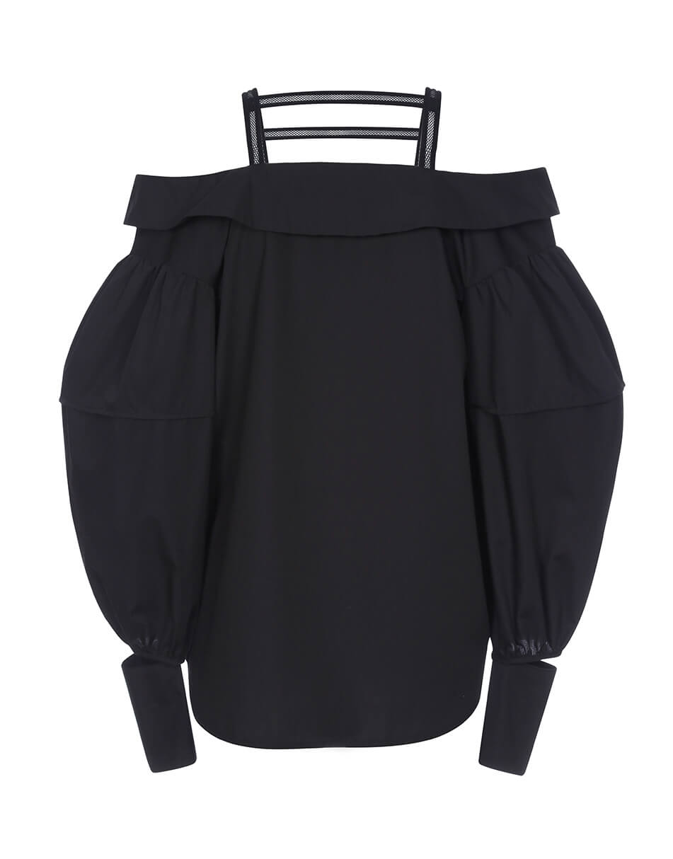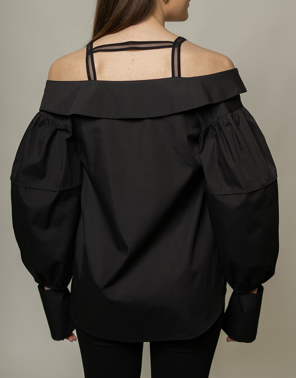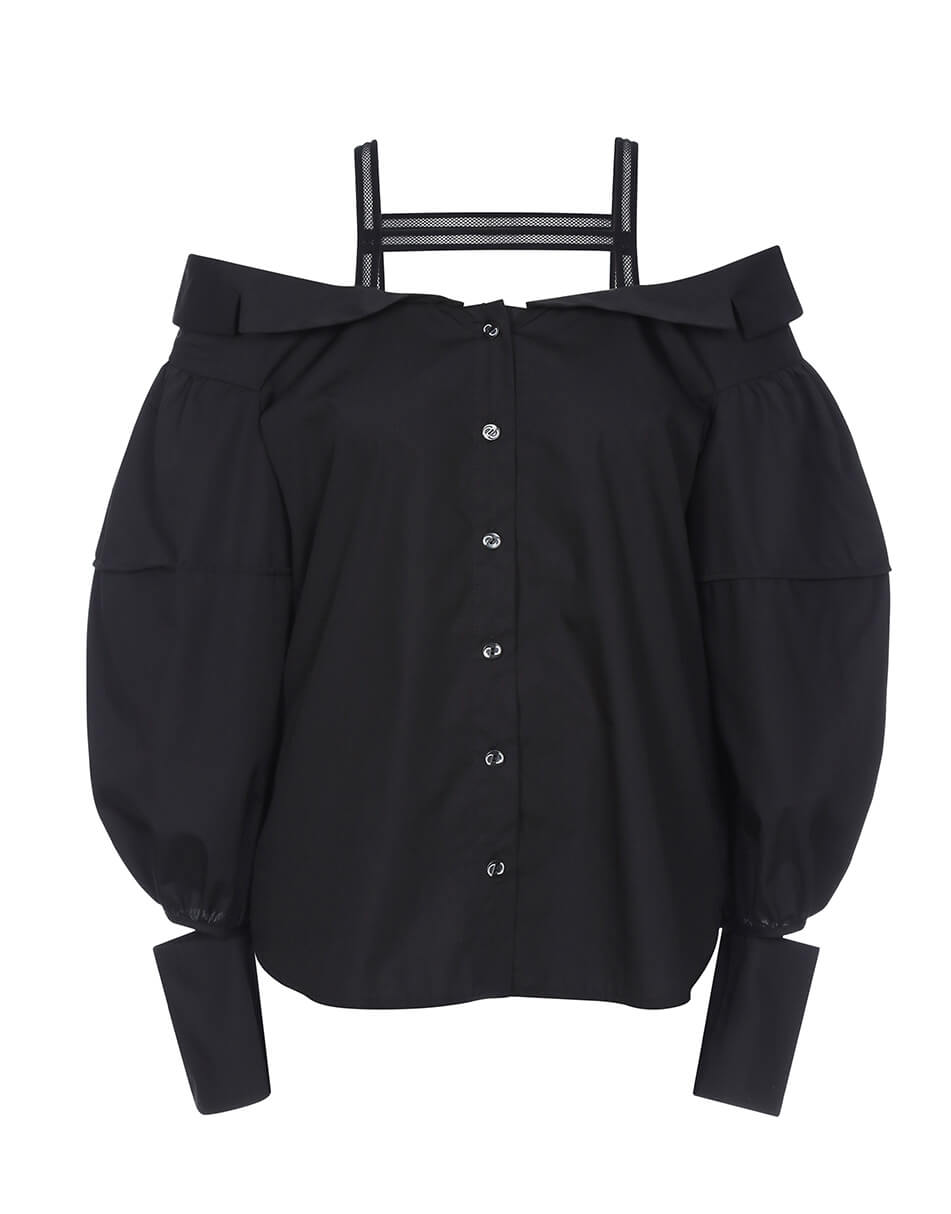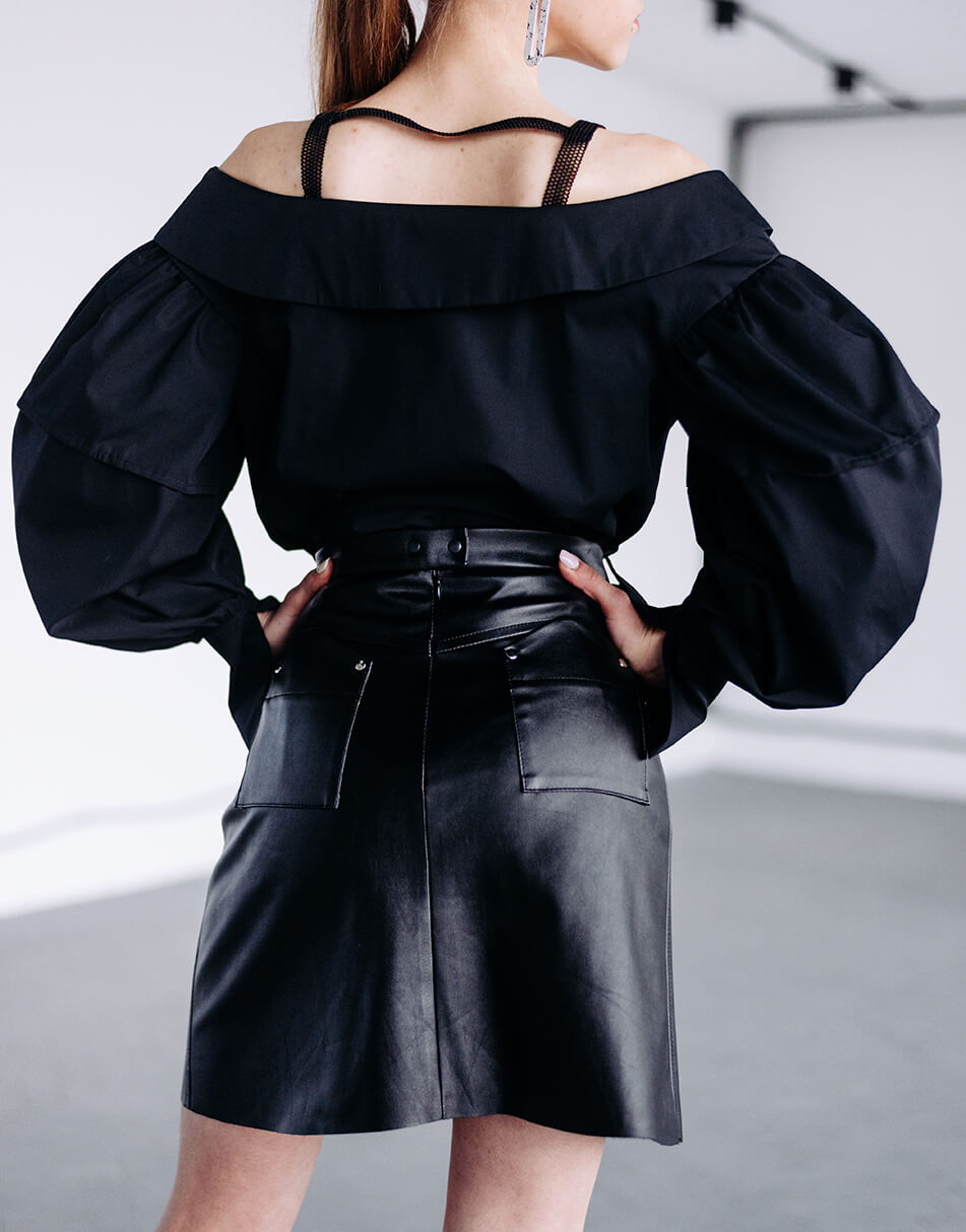 Блуза рівного силуету з відкритими плечима. Застібка на ґудзики. По лінії декольте відкладний комір. Також декоративні бретелі, які не дадуть блузці спадати, зроблені для зручності з декоративної гумки. Широкий фантазійний рукав з манжетою, закріпленою на шві рукава.