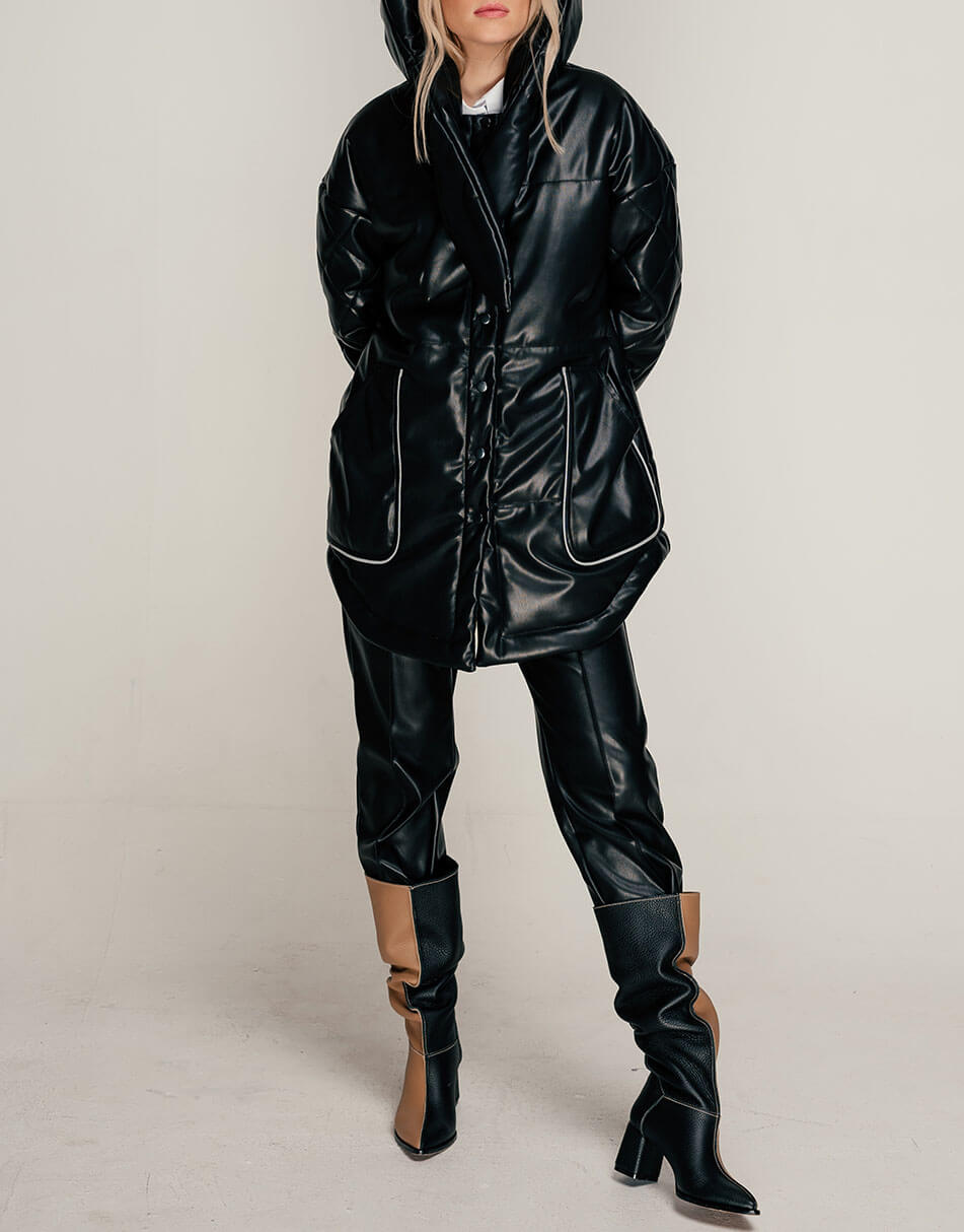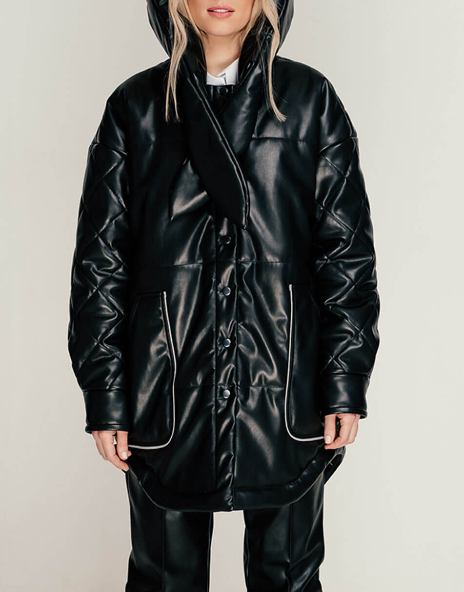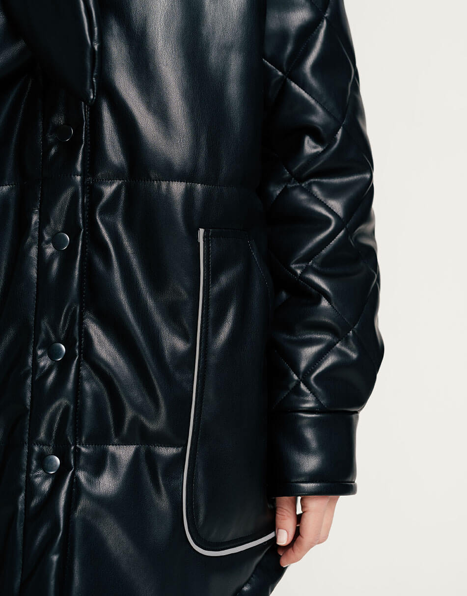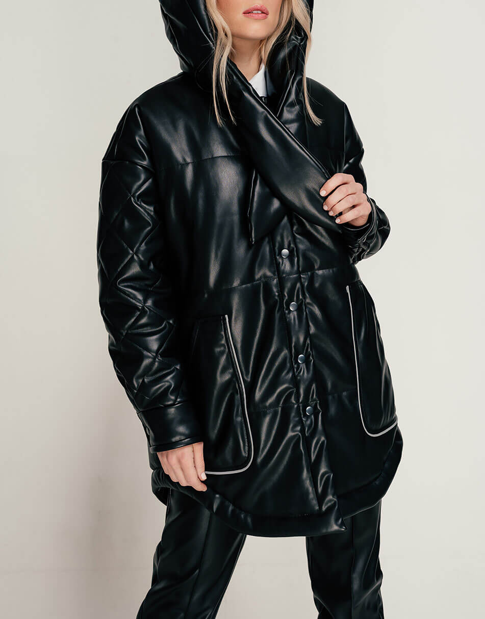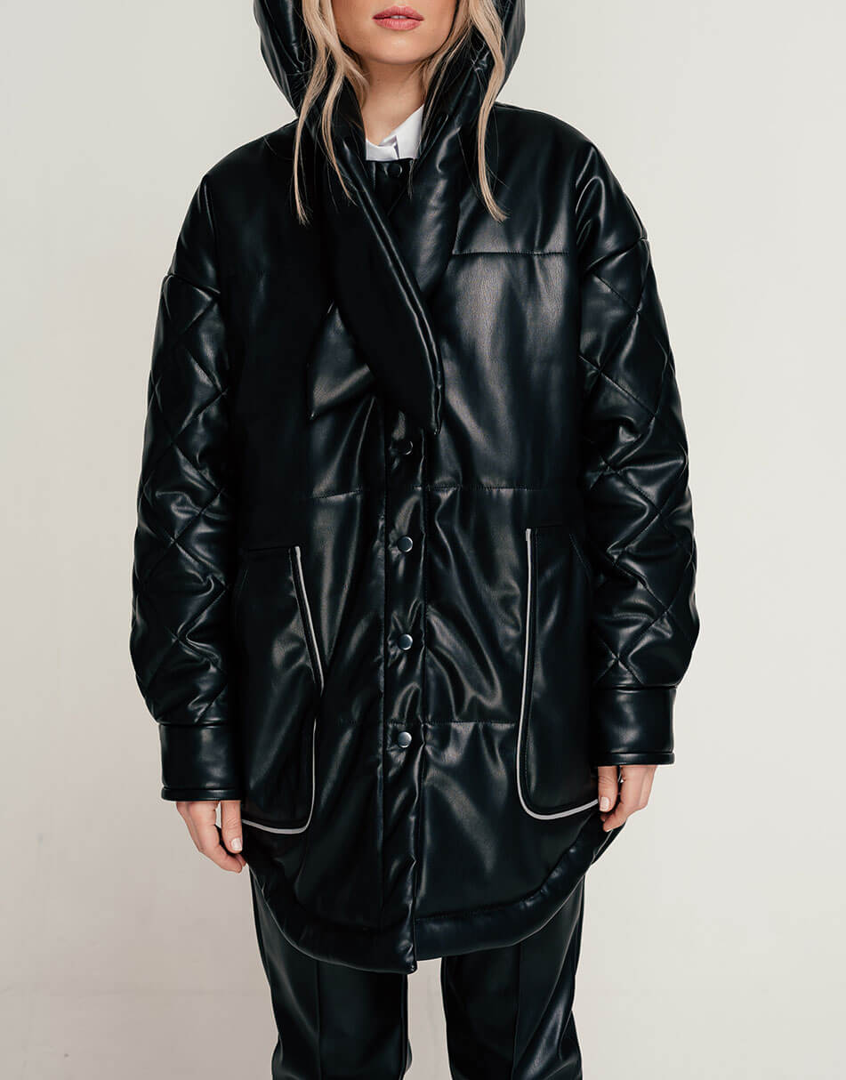 Доставка впродовж 2-5 робочих днівКуртка рівного силуету, виконана з веганської шкіри, на підкладці з утеплювачем. Капюшон на зав’язці, застібка на кнопках. Два накладних кармана з світловідбиваючою вставкою. Спущене плече, рукава з манжетами на кнопках. Скруглений низ, по спинці довший.