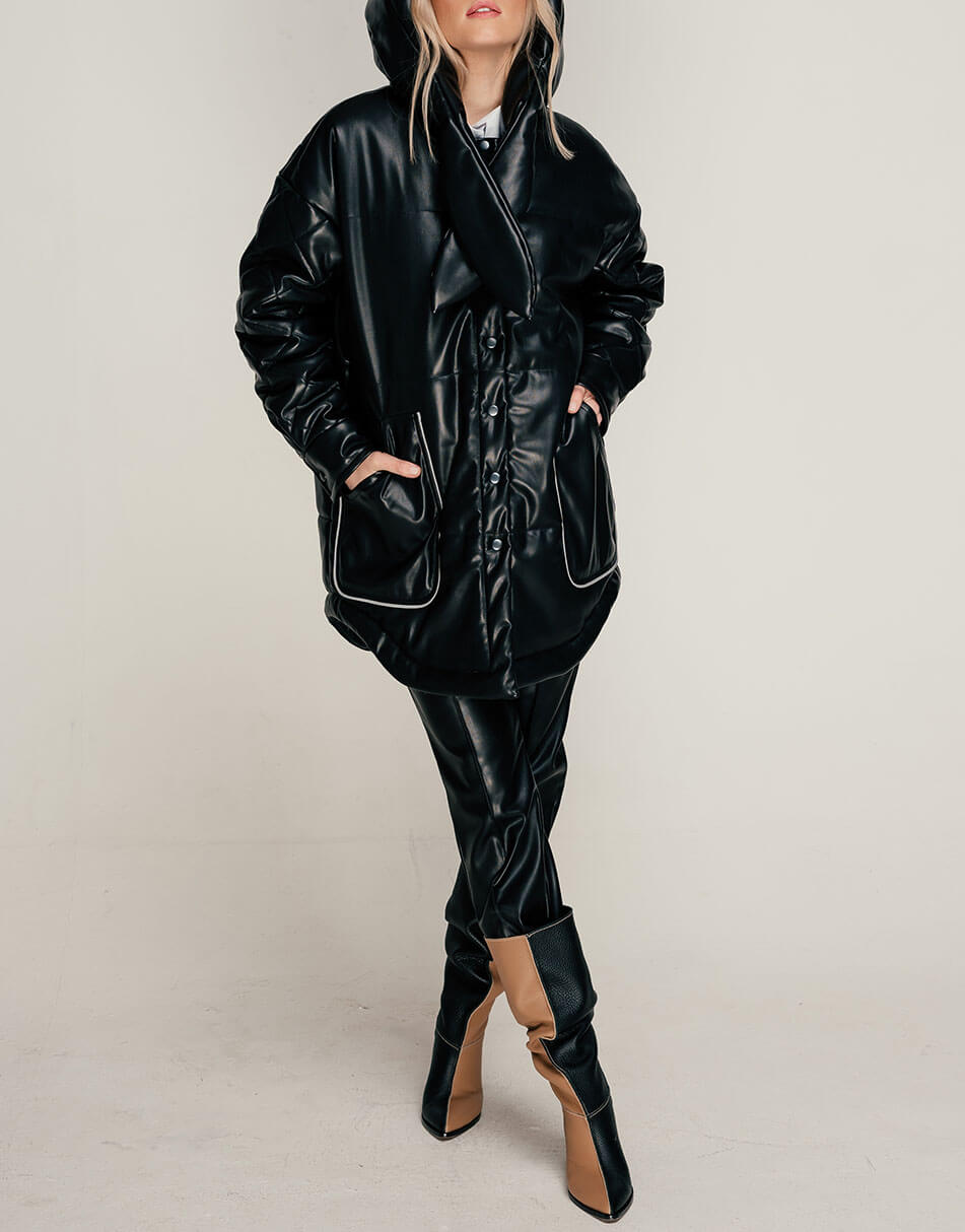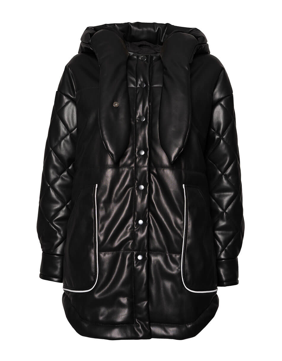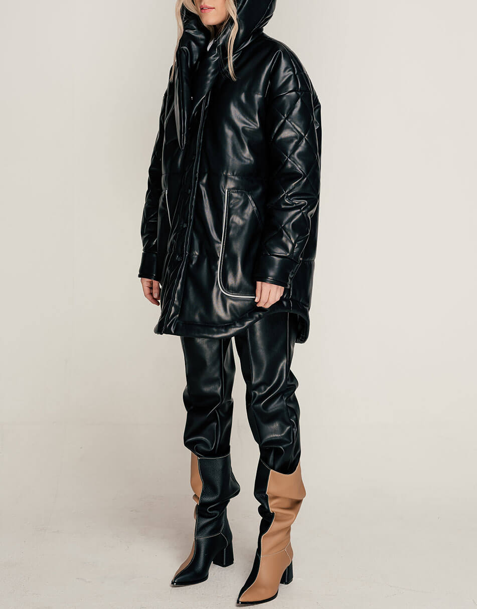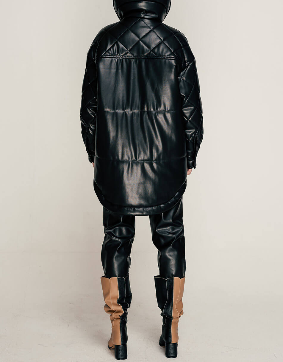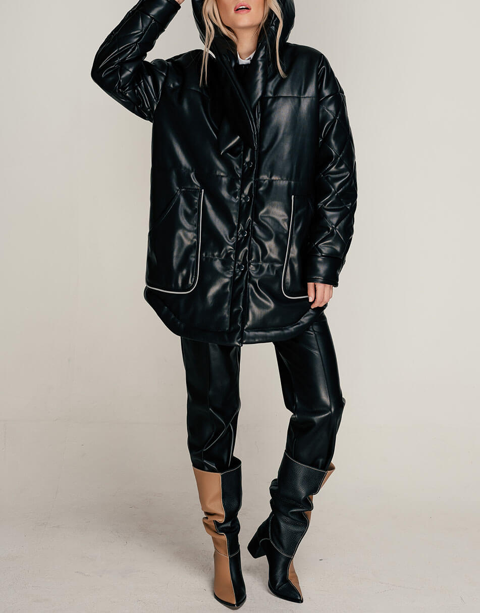 Доставка впродовж 2-5 робочих днівКуртка рівного силуету, виконана з веганської шкіри, на підкладці з утеплювачем. Капюшон на зав’язці, застібка на кнопках. Два накладних кармана з світловідбиваючою вставкою. Спущене плече, рукава з манжетами на кнопках. Скруглений низ, по спинці довший.