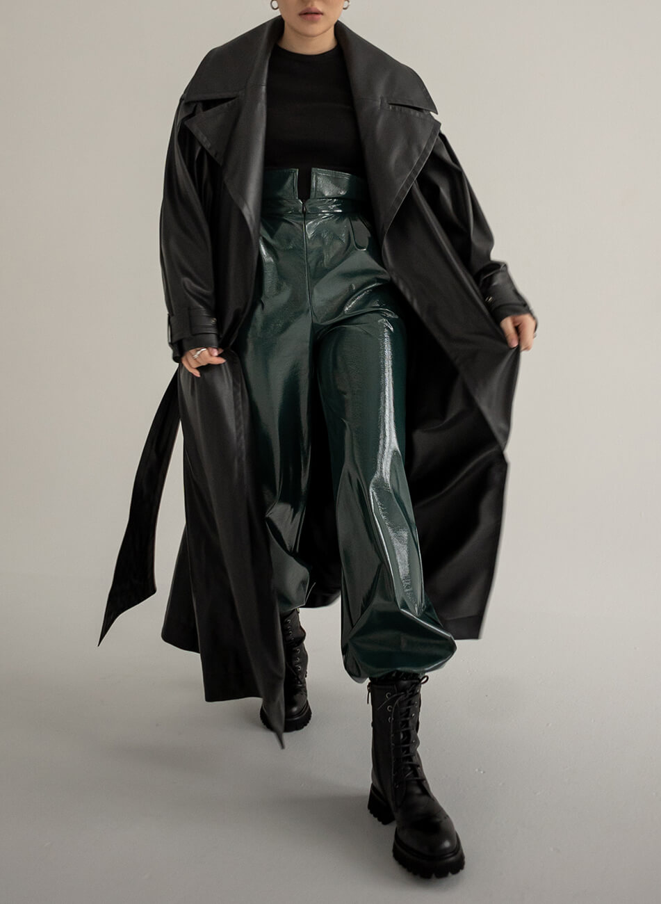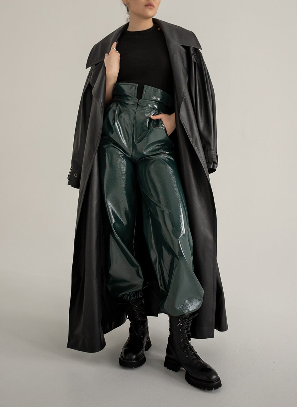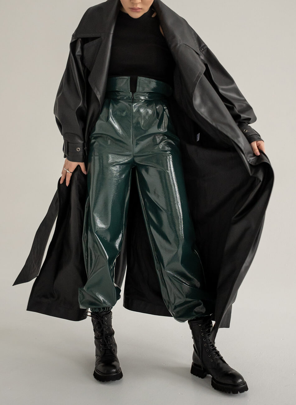Доставка впродовж 2-5 робочих днівРівні брюки з високою талією з лакованої тканини темно-зеленого кольору. Внизу на резинці. З карманами. Застібаються спереду на потайний замок.