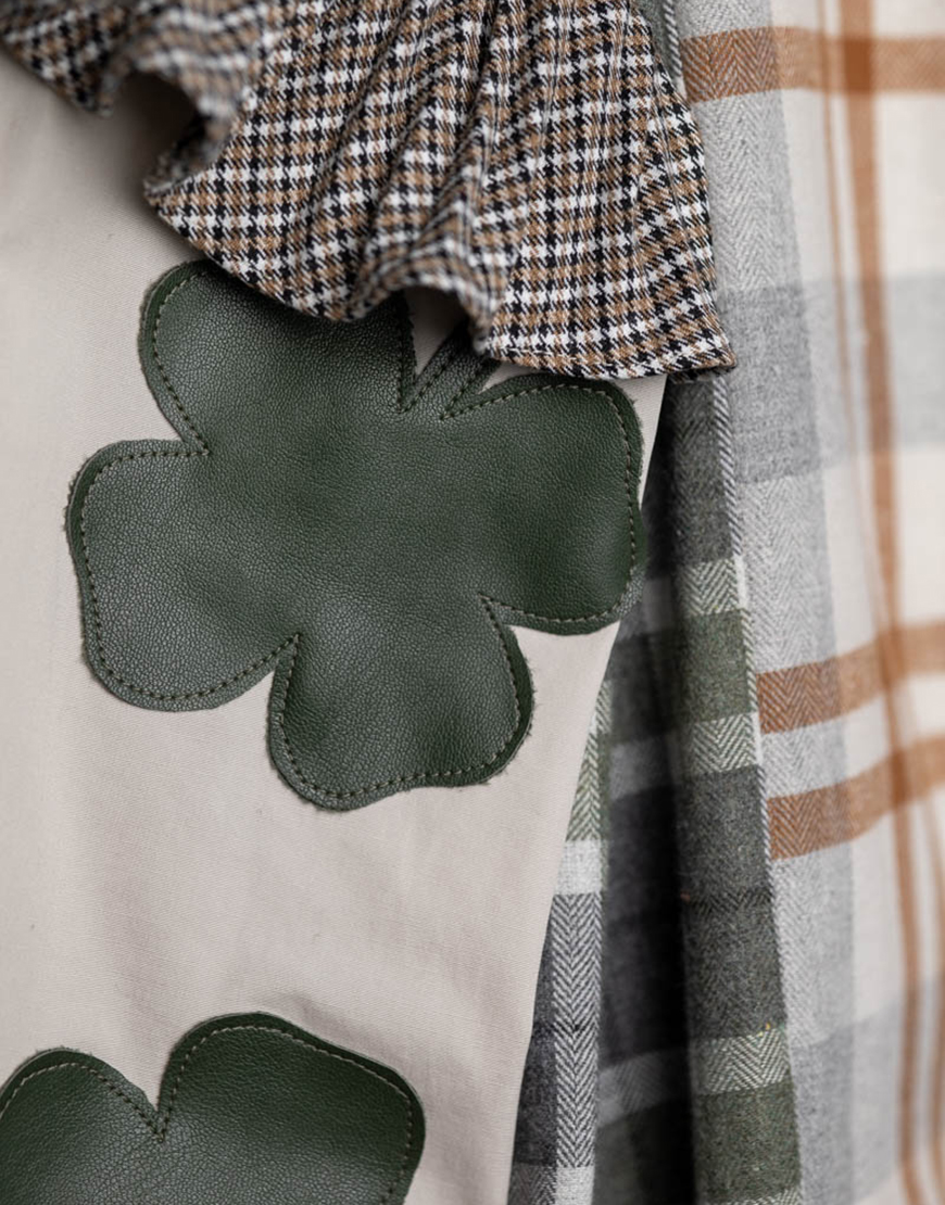 Особливістю цієї сукні є декор на рукавах у вигляді конюшини з екошкіри, що додає образу нотку екстравагантності та вишуканості. Асиметричний крій та вільний оверсайз дозволяють створити комфортний, але стильний образ.