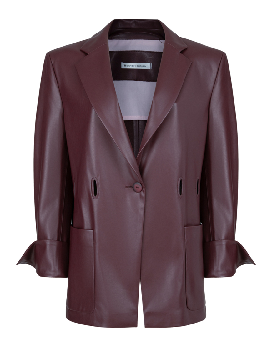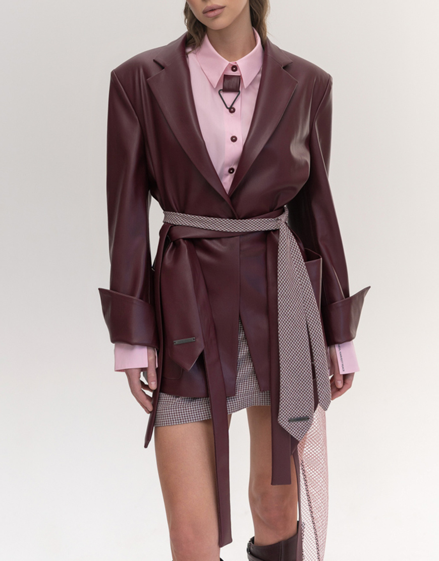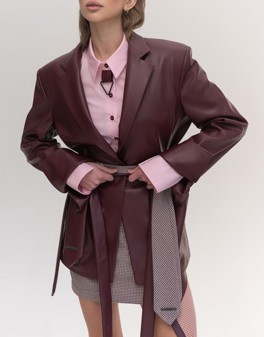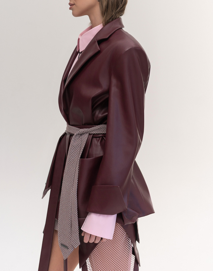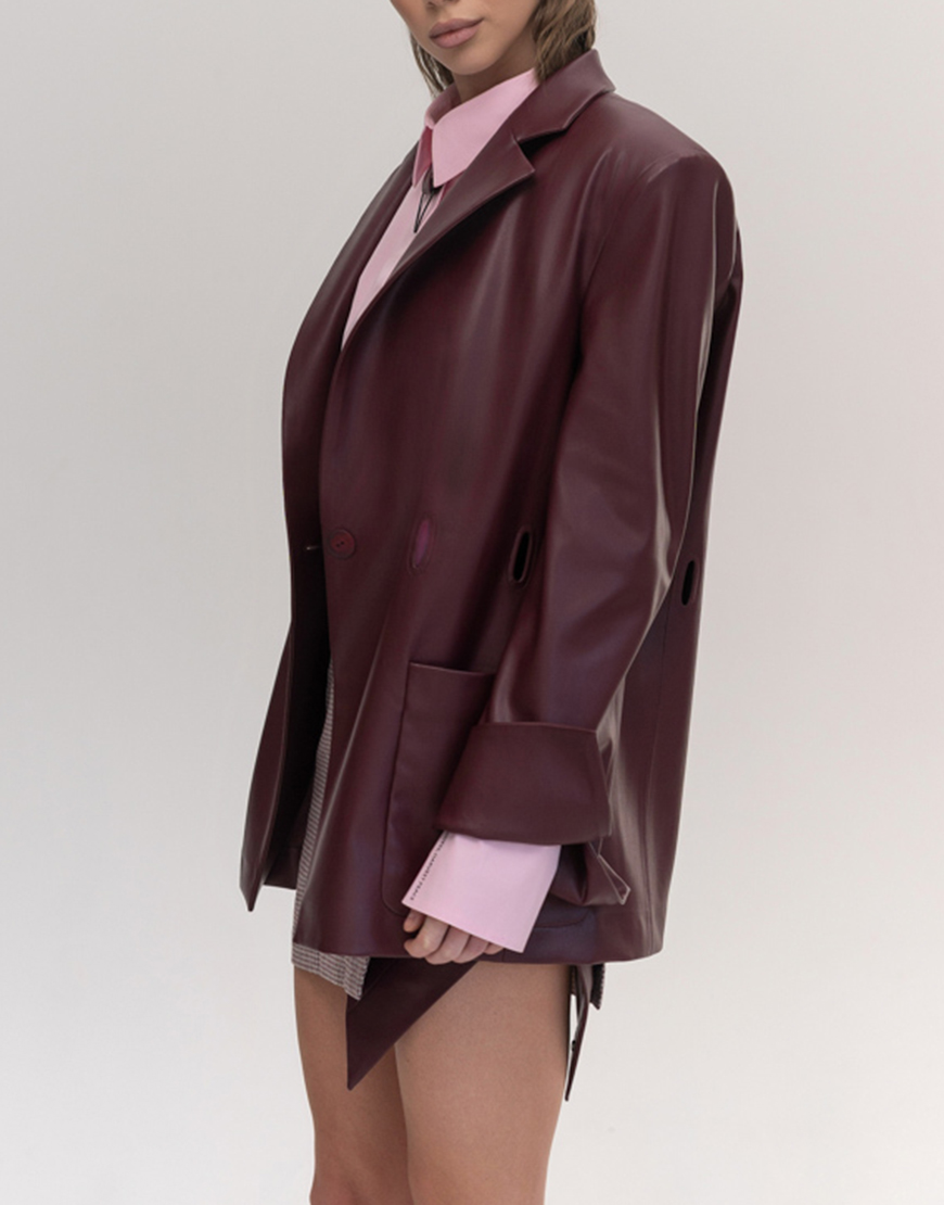Доставка впродовж 2-5 робочих днівПіджак прямого силуету чоловічого крою, виготовлений з екошкіри насиченого бордового кольору. Модель без підкладки, з підплечниками, завдяки чому виріб є легким та комфортним для щоденного носіння. Відкладний піджачний комір надає класичного вигляду. Застібка на ґудзик, дві накладні кишені з боків. Особливою деталлю піджака є цікаві прорізи по лінії талії, в які можна протягнути пасок, створюючи індивідуальний стиль та підкреслюючи фігуру.