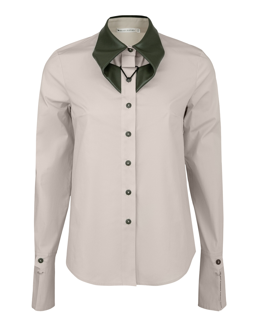 Доставка впродовж 2-5 робочих днівПриталена сорочка, виготовлена з сорочкової тканини з еластаном бежевого кольору. Основною особливістю моделі є декоративний комір контрастного кольору з екошкіри, що надає сорочці стильного вигляду та підвищує її практичність. Сорочка має акцентні манжети з принтом, оформлені пірсінгом, що підкреслює модні тенденції і додає образу оригінальності.