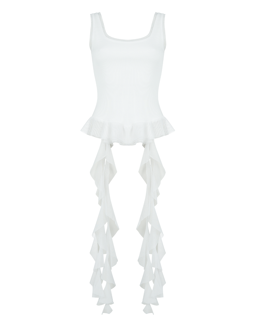 Доставка впродовж 2-5 робочих днівСтильна майка, виготовлена з еластичної трикотажної тканини білого кольору. Приталений силует красиво підкреслює талію, додаючи образу витонченості. Головною особливістю моделі є повітряні волани з напівпрозорої сітки, які додають легкості та динаміки. Волани розташовані по нижньому краю виробу, створюючи грайливий та жіночний ефект.