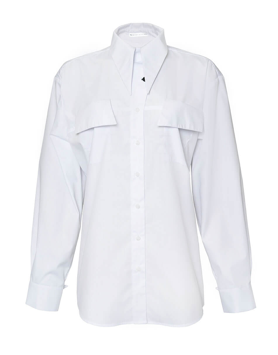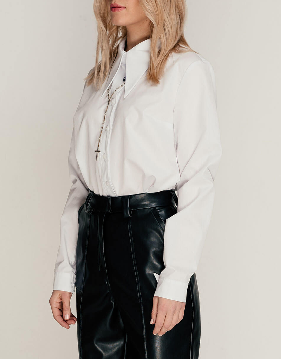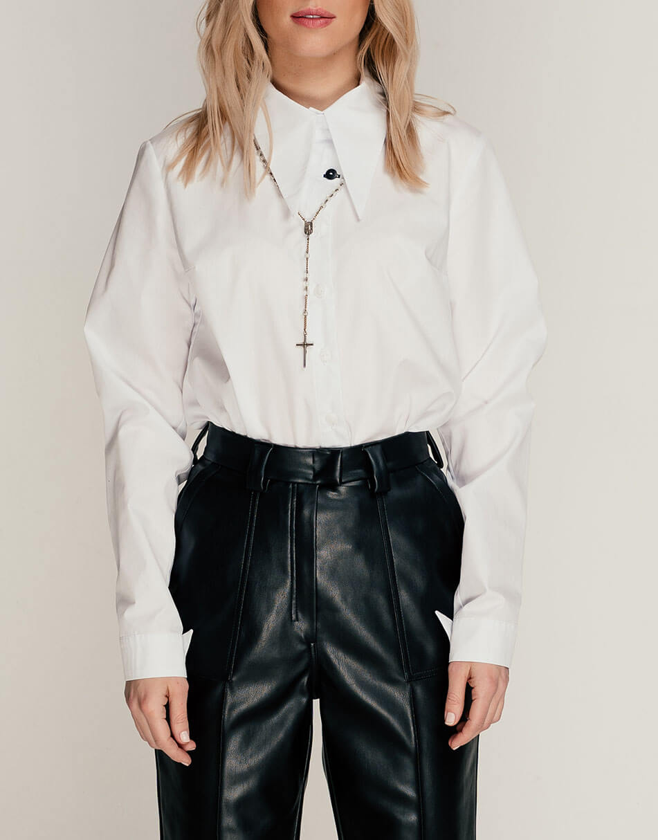 Сорочка приталеного силуету, виконана з сорочкової тканини. Сорочковий, подовжений комір. Зміщена планка, застібка на ґудзики. Довгий рукав на манжеті. Сезон: Весна/Літо/Осінь/