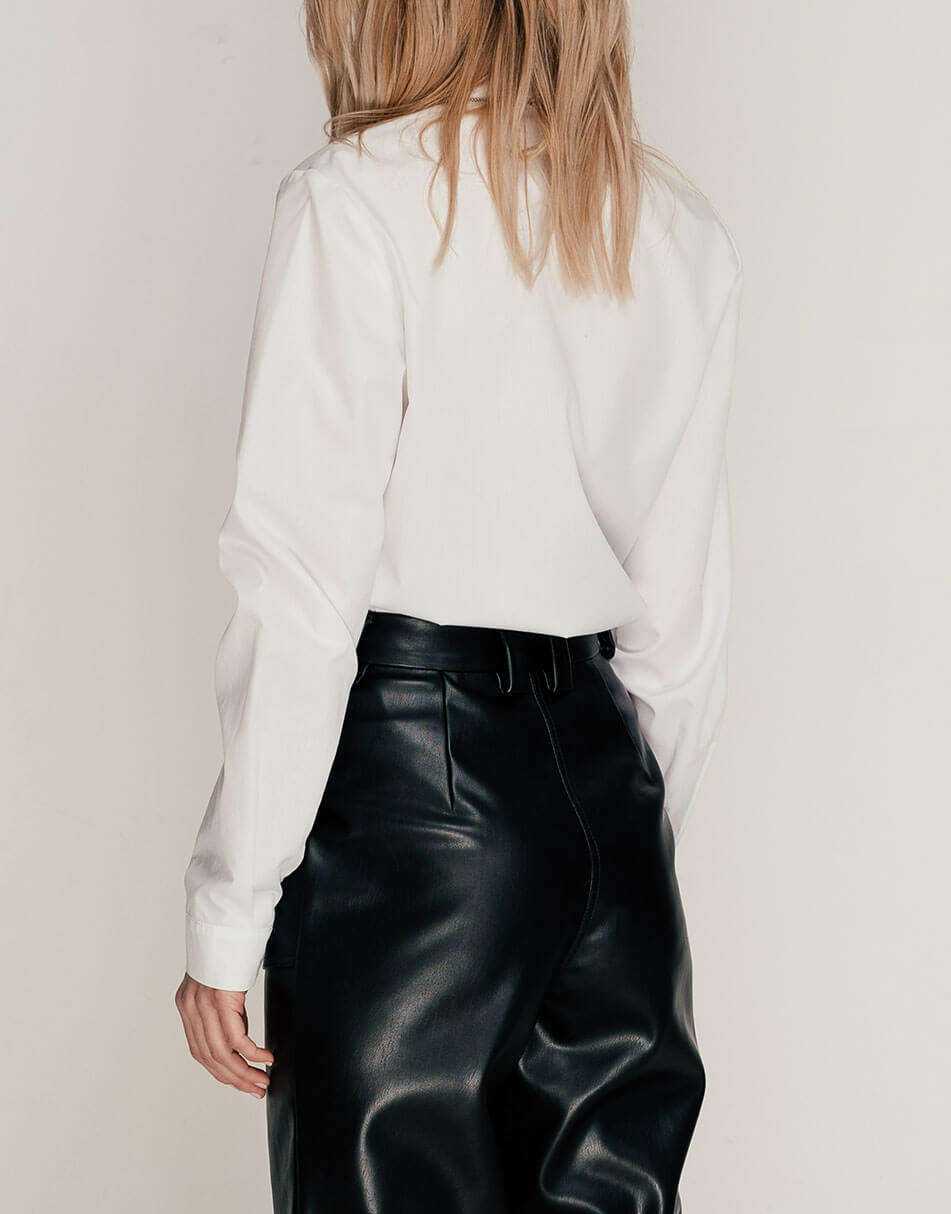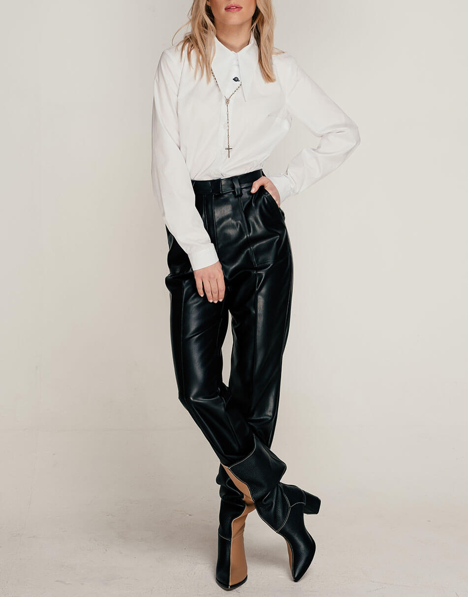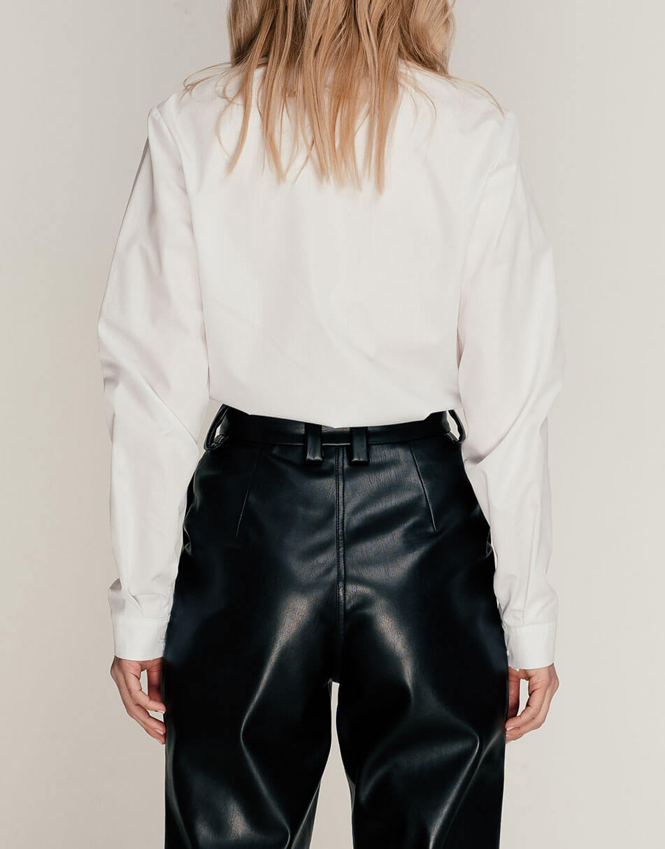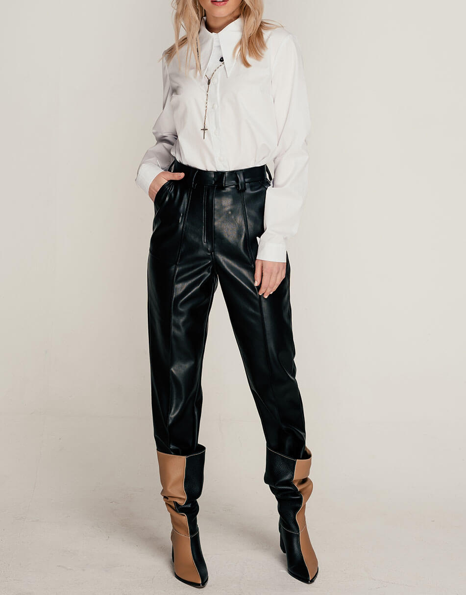 Сорочка приталеного силуету, виконана з сорочкової тканини. Сорочковий, подовжений комір. Зміщена планка, застібка на ґудзики. Довгий рукав на манжеті. Сезон: Весна/Літо/Осінь/