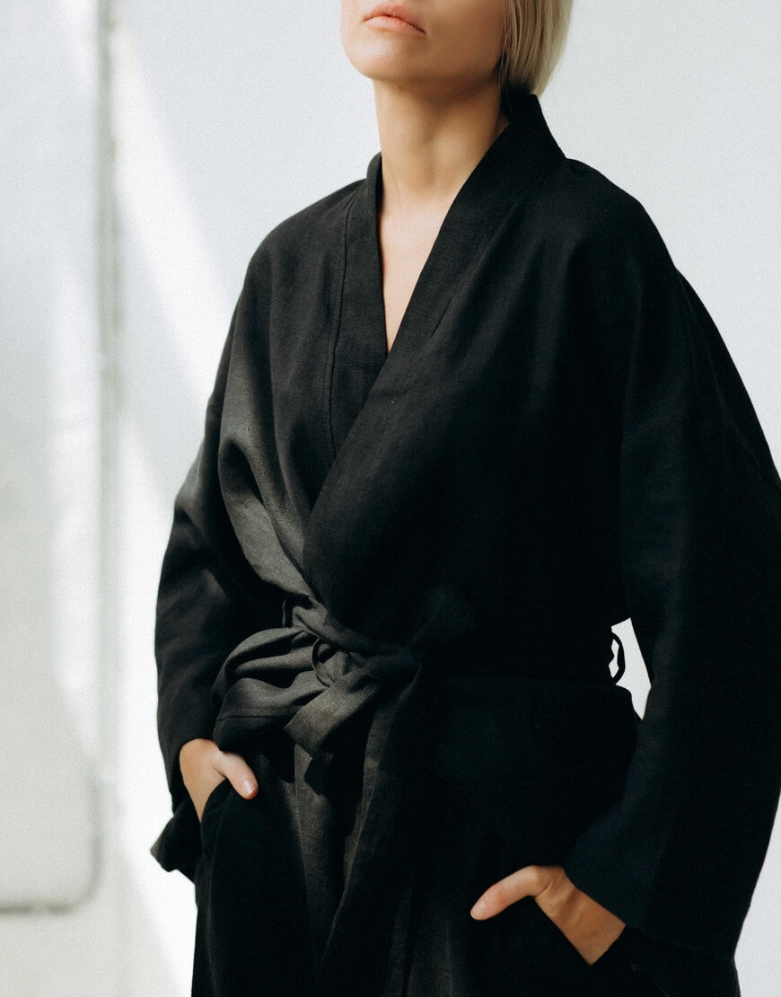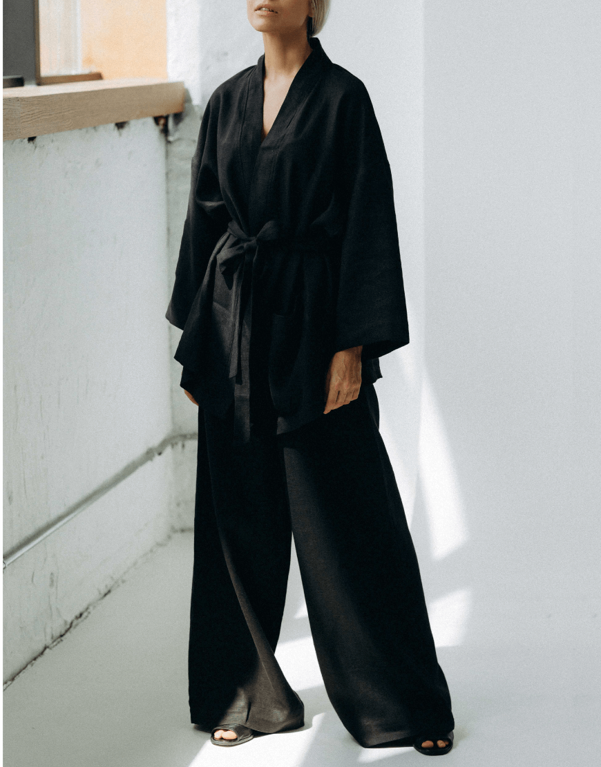 Костюм з натурального пом’якшеного льону. Палаццо мають вільний крій з високою посадкою на резинці. Кімоно має вільний крій зі спущеним рукавом довжиною 3/4 та кишеню. В комплекті йде пасок.