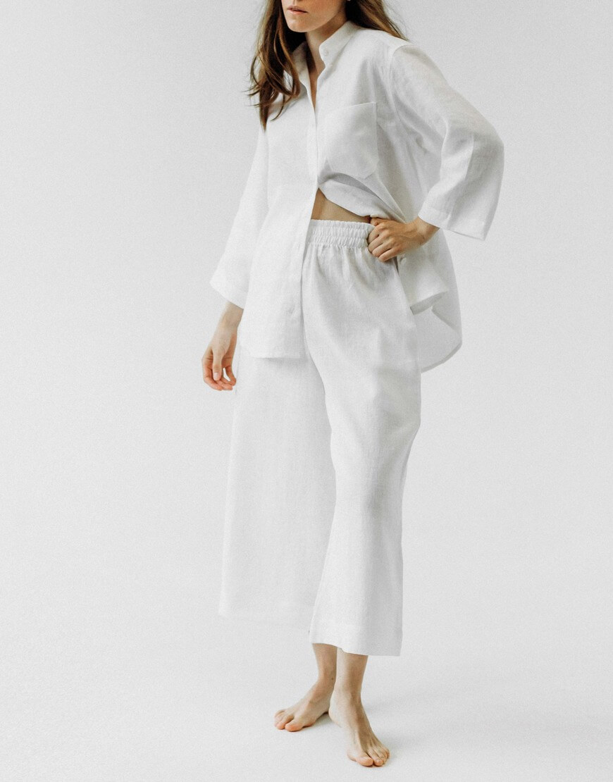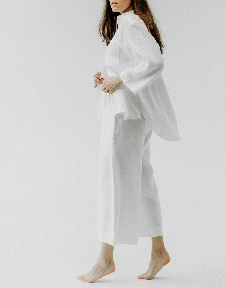 Костюм з натурального пом’якшеного льону. Кюлоти мають вільний крій з високою посадкою на резинці. Сорочка має вільний крій зі спущеним рукавом довжиною 3/4. У комплекті йде пасок до сорочки. Ґудзики з натуральної мушлі.