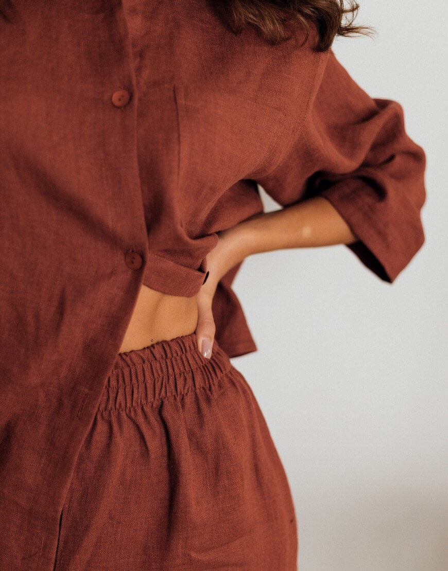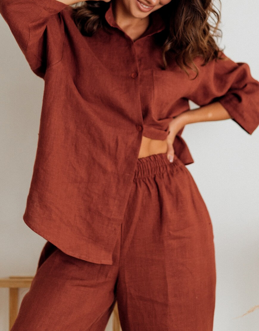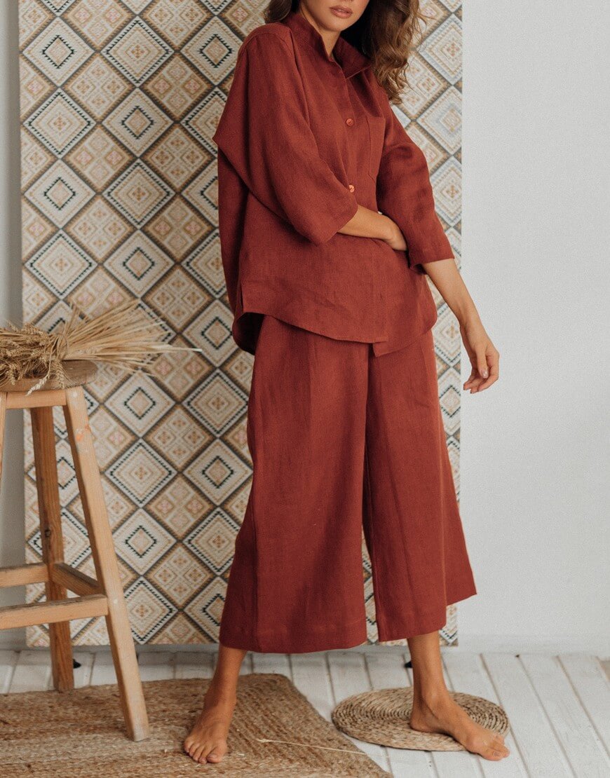 Костюм з натурального пом’якшеного льону. Кюлоти мають вільний крій з високою посадкою на резинці. Сорочка має вільний крій зі спущеним рукавом довжиною 3/4. У комплекті йде пасок до сорочки. Ґудзики з натуральної мушлі.
