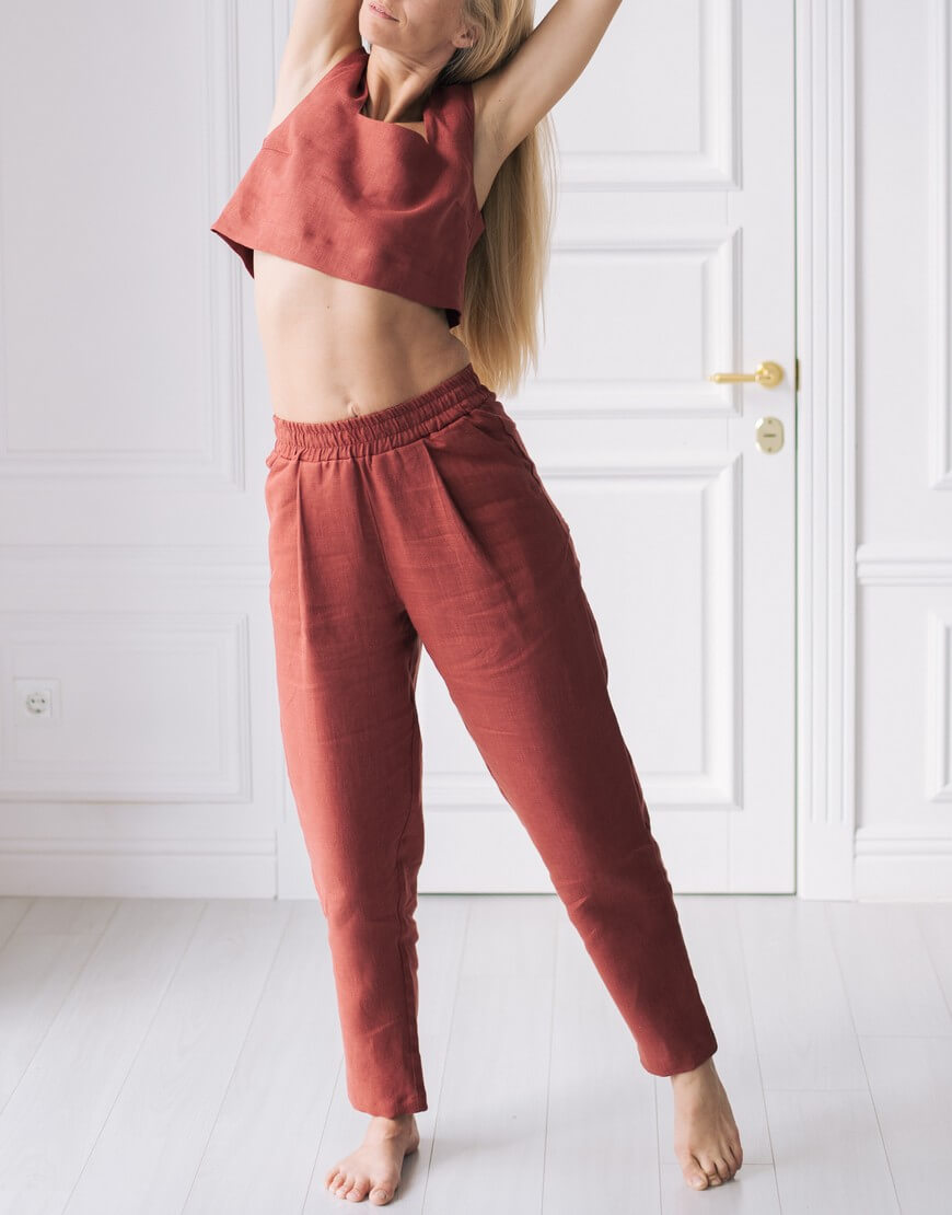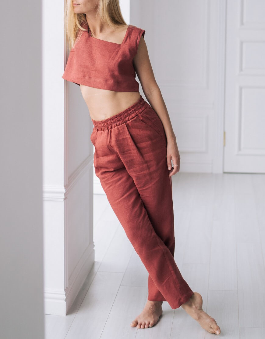 Костюм з натурального пом’якшеного льону. Прямі штани мають вільний крій з високою посадкою на резинці. Топ має вільний крій.