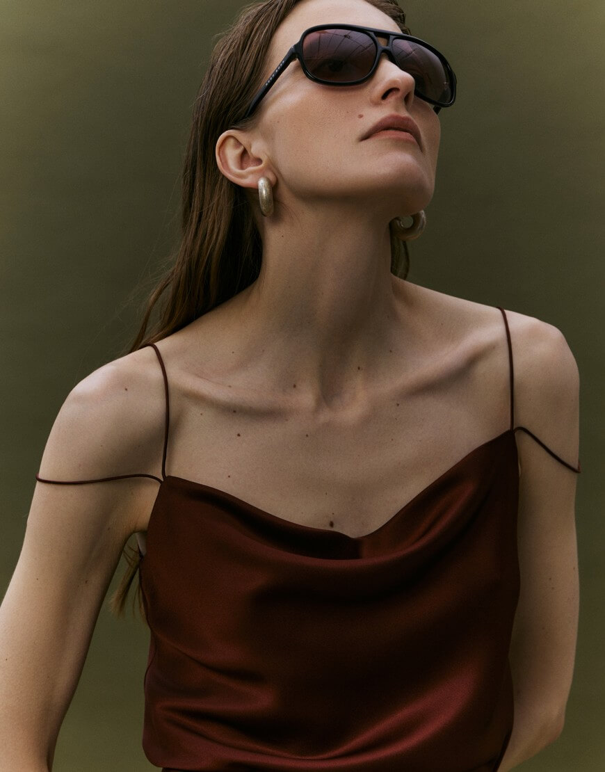 Дизайнерський топ по косій на подвійних тонких бретелях. В області грудей тканина лягає легкою хвилею. Довжина виробу 47 см.