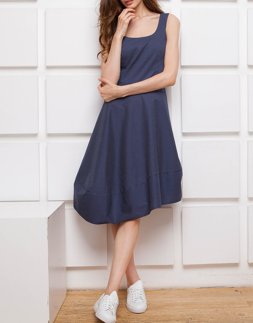 Від 3000 грн доступна оплата частинами monobank Детальніше Бавовняна сукня синього кольору в білий горошок на підкладці батіст. Виріб облягаючого силуету, фантазійної форми, відрізний по лінії талії. Спідниця розкльошена, довжина за коліно, асиметрична. Внизу спідниці йде декоративна смуга. Збоку застібається на блискавку. Трохи маломіряє. При замовленні орієнтуйтесь на параметри грудей та талії.