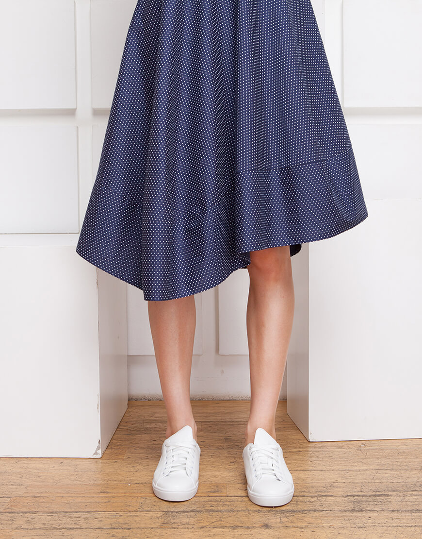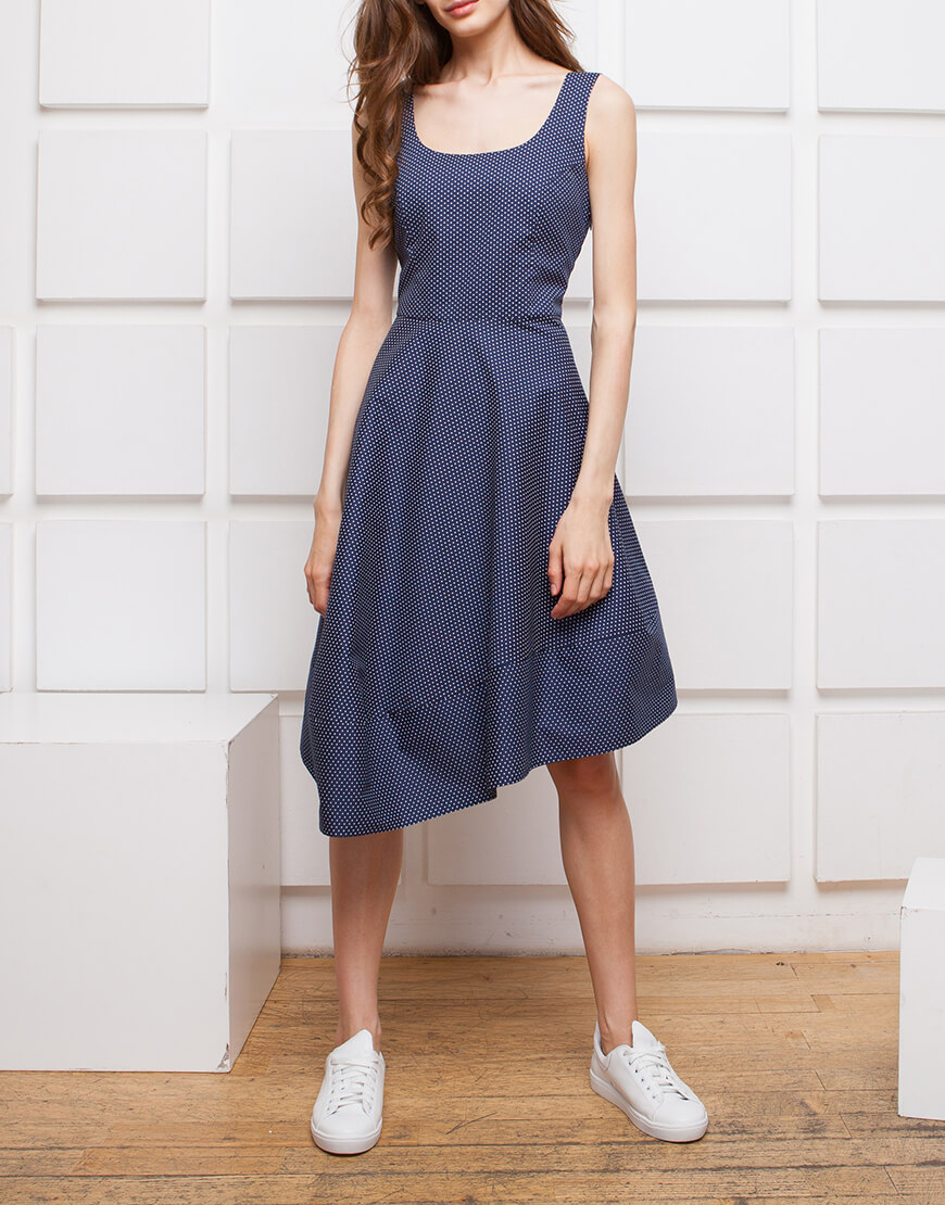 Бавовняна сукня синього кольору в білий горошок на підкладці батіст. Виріб облягаючого силуету, фантазійної форми, відрізний по лінії талії. Спідниця розкльошена, довжина за коліно, асиметрична. Внизу спідниці йде декоративна смуга. Збоку застібається на блискавку. Трохи маломіряє. При замовленні орієнтуйтесь на параметри грудей та талії.