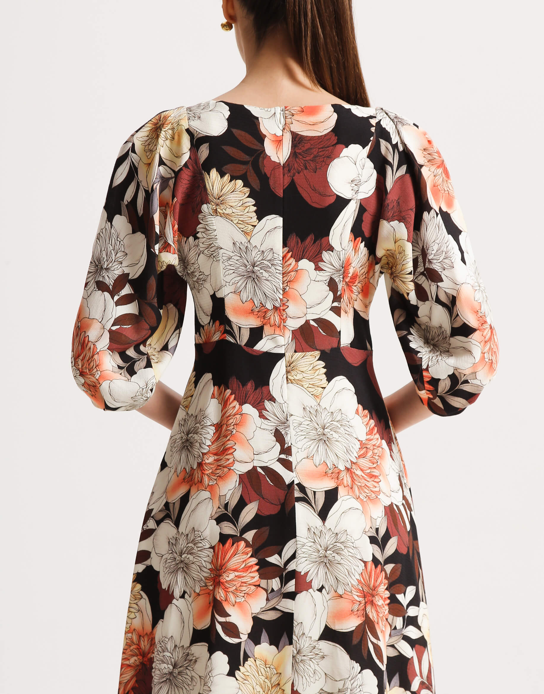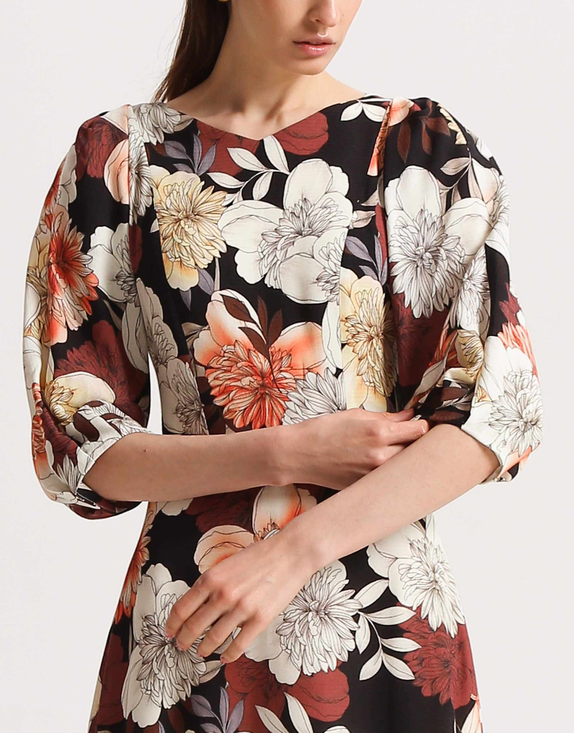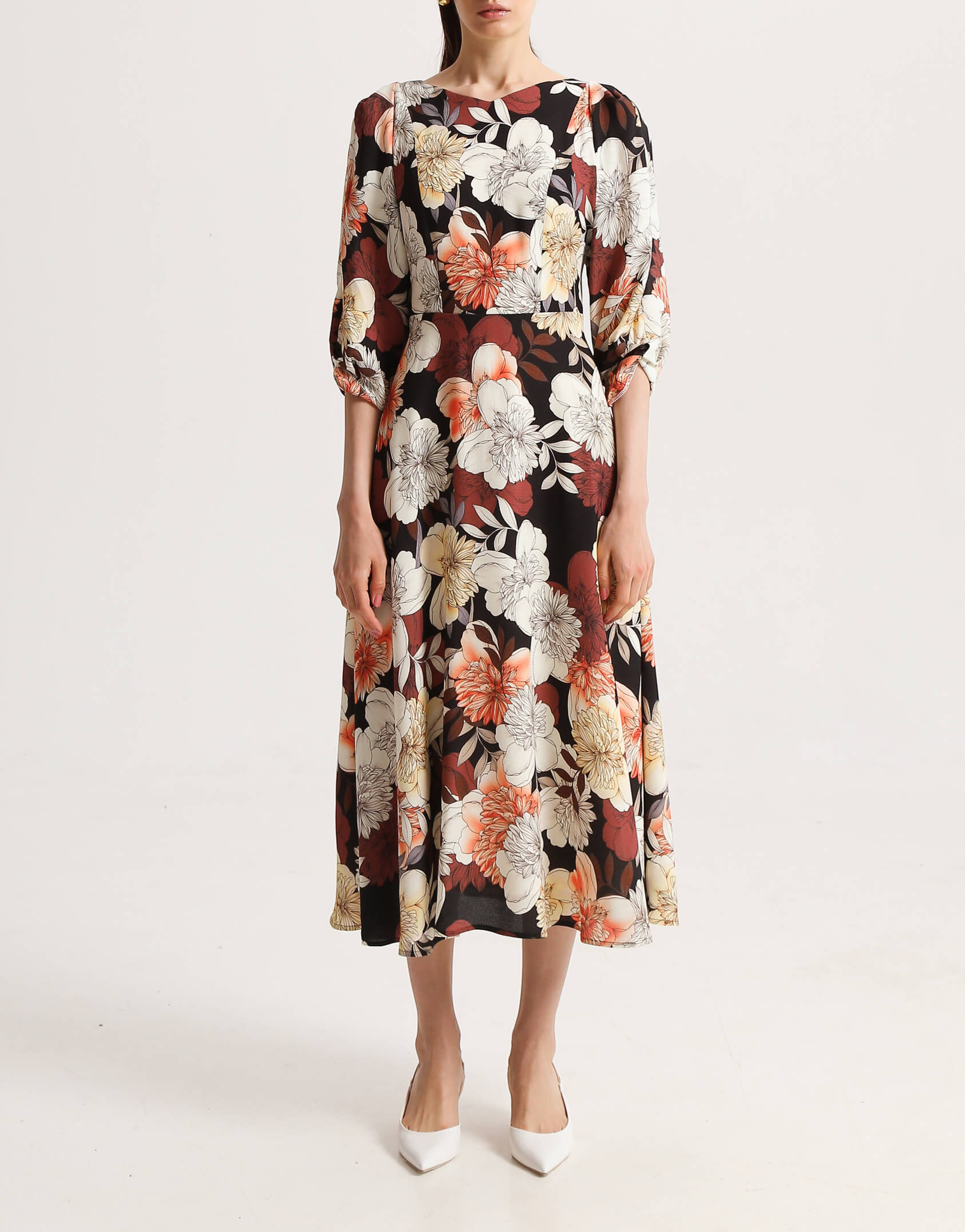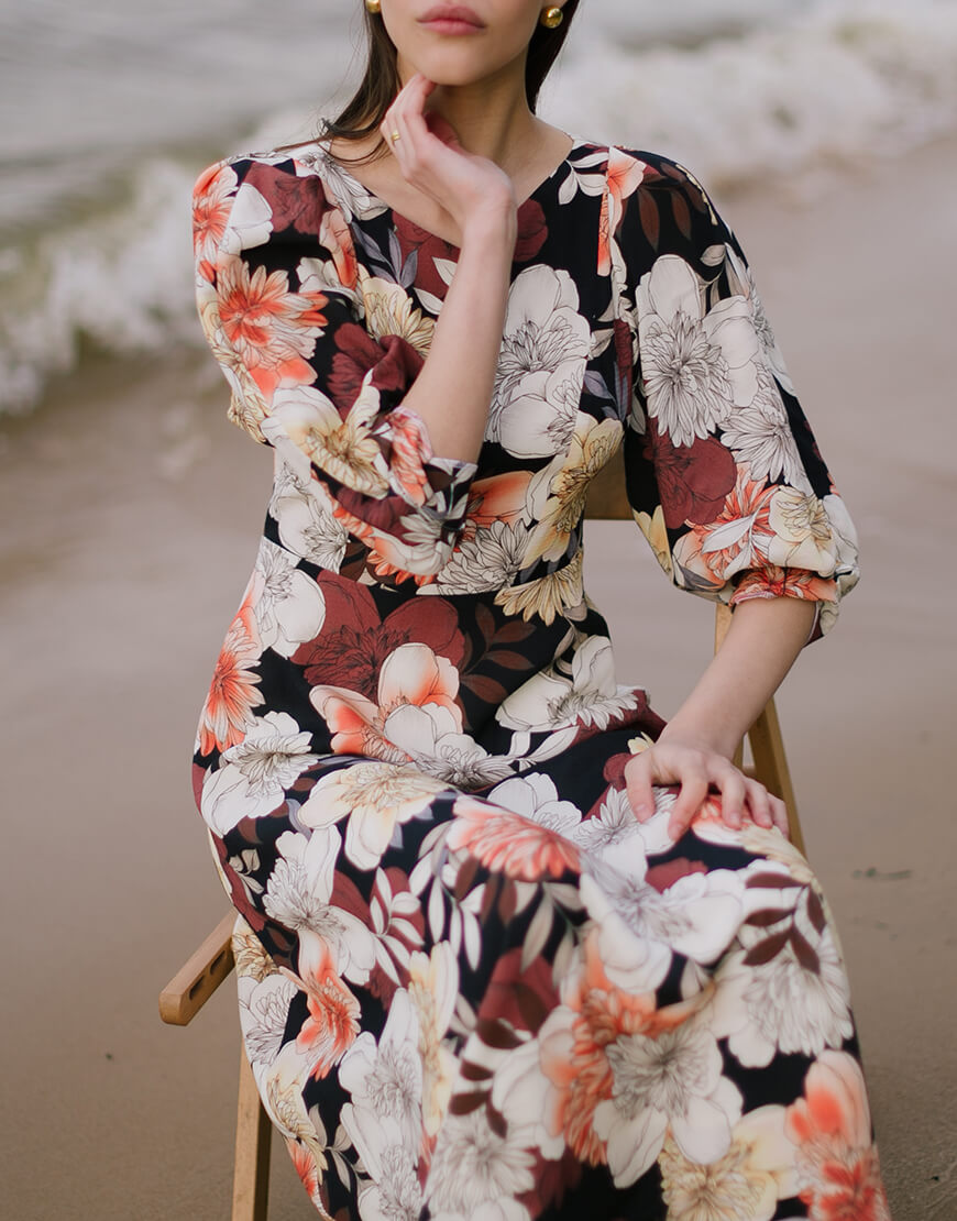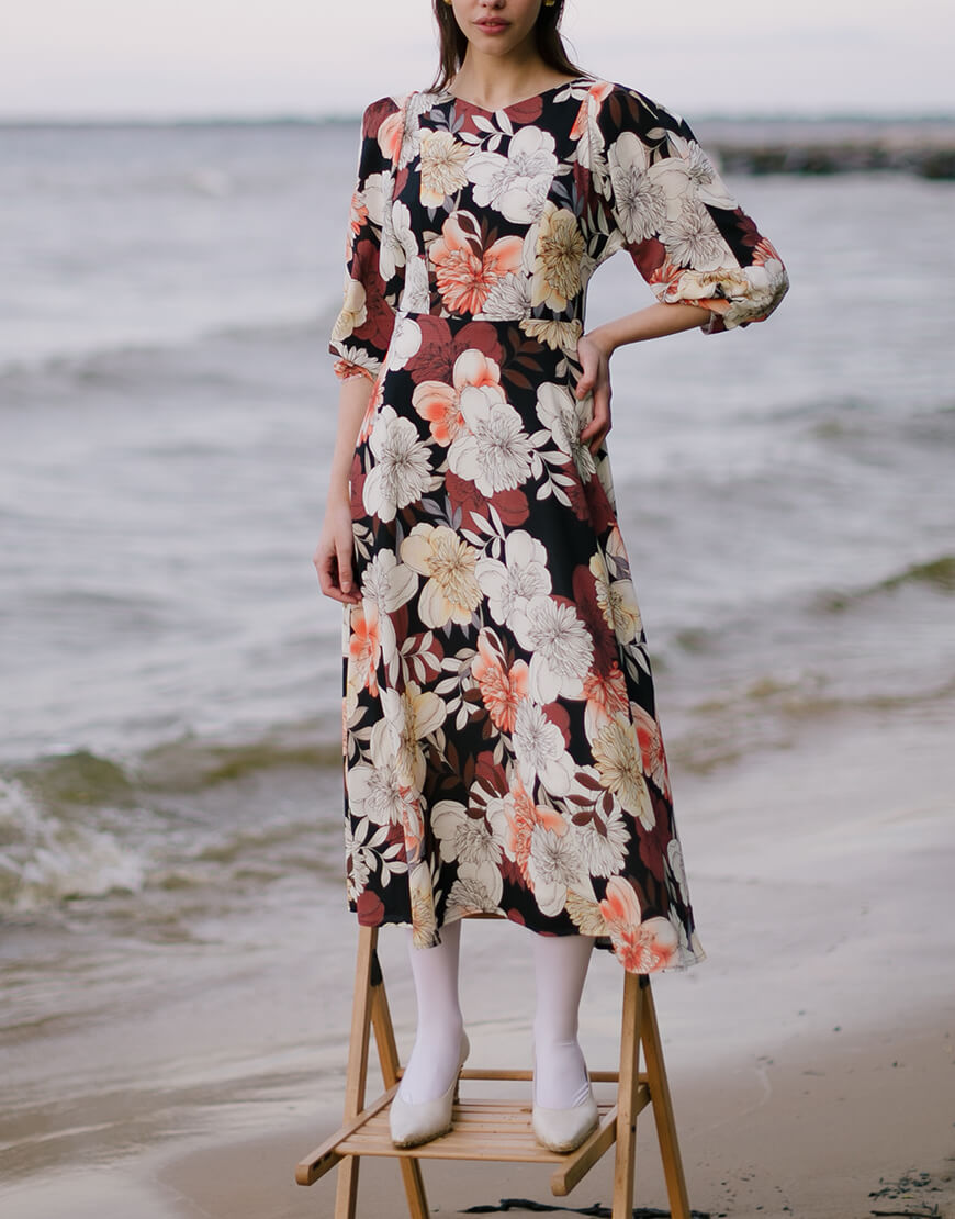 Сукня полуприлеглого силуету з неглибоким V-подібним вирізом на підкладці. Рельєфи на ліфі візуально роблять талію більш тонкою. Яскравий акцент — рукави “летюча миша” з складами. Сукня відрізне по лінії талії. Розкльошена спідниця ідеально сідає та виглядає на жінках з різним об’ємом стегон. Ззаду застібається на молнію.