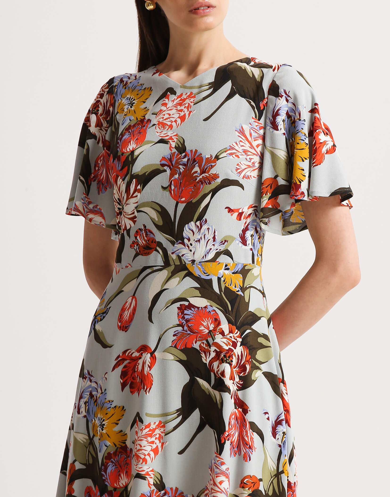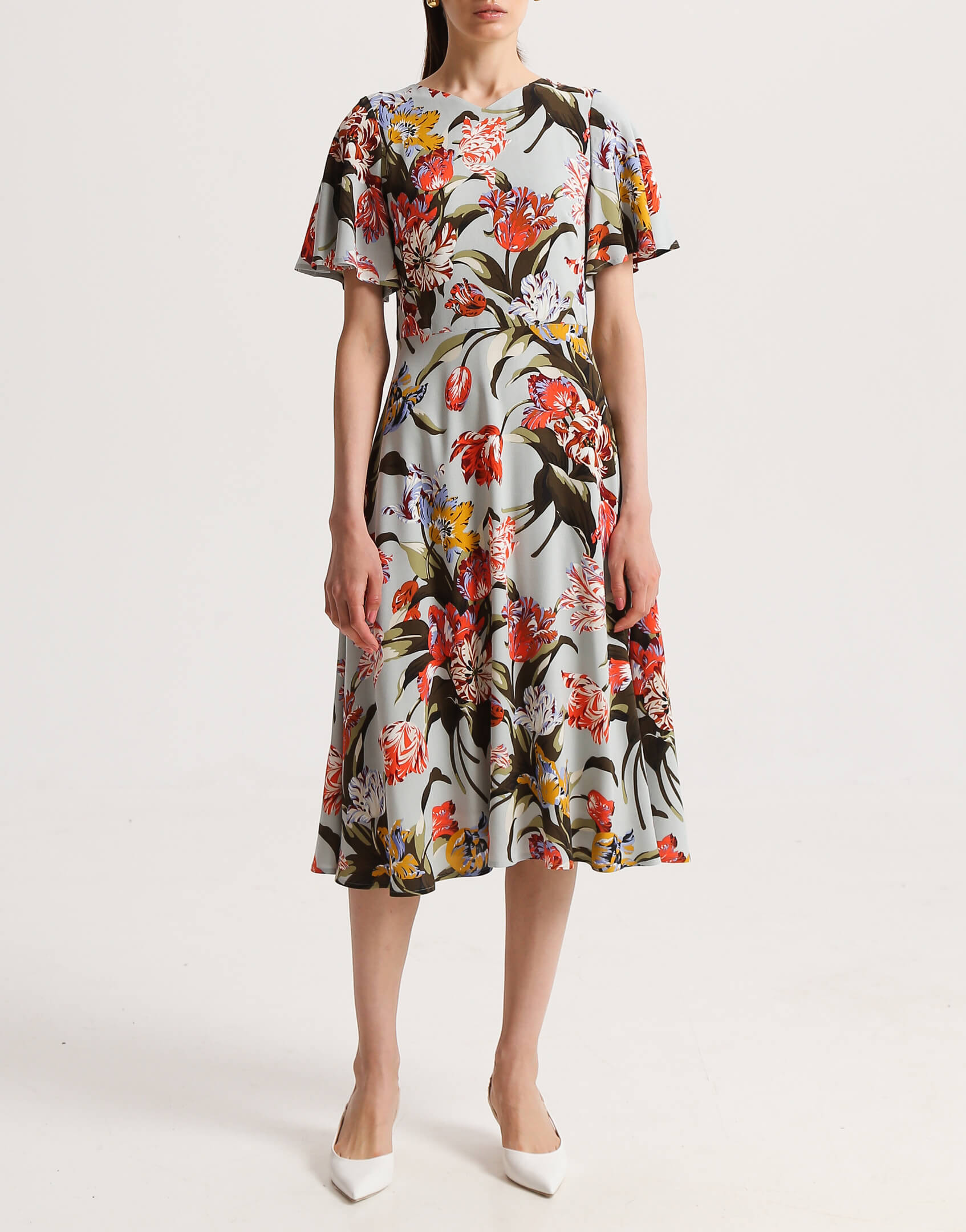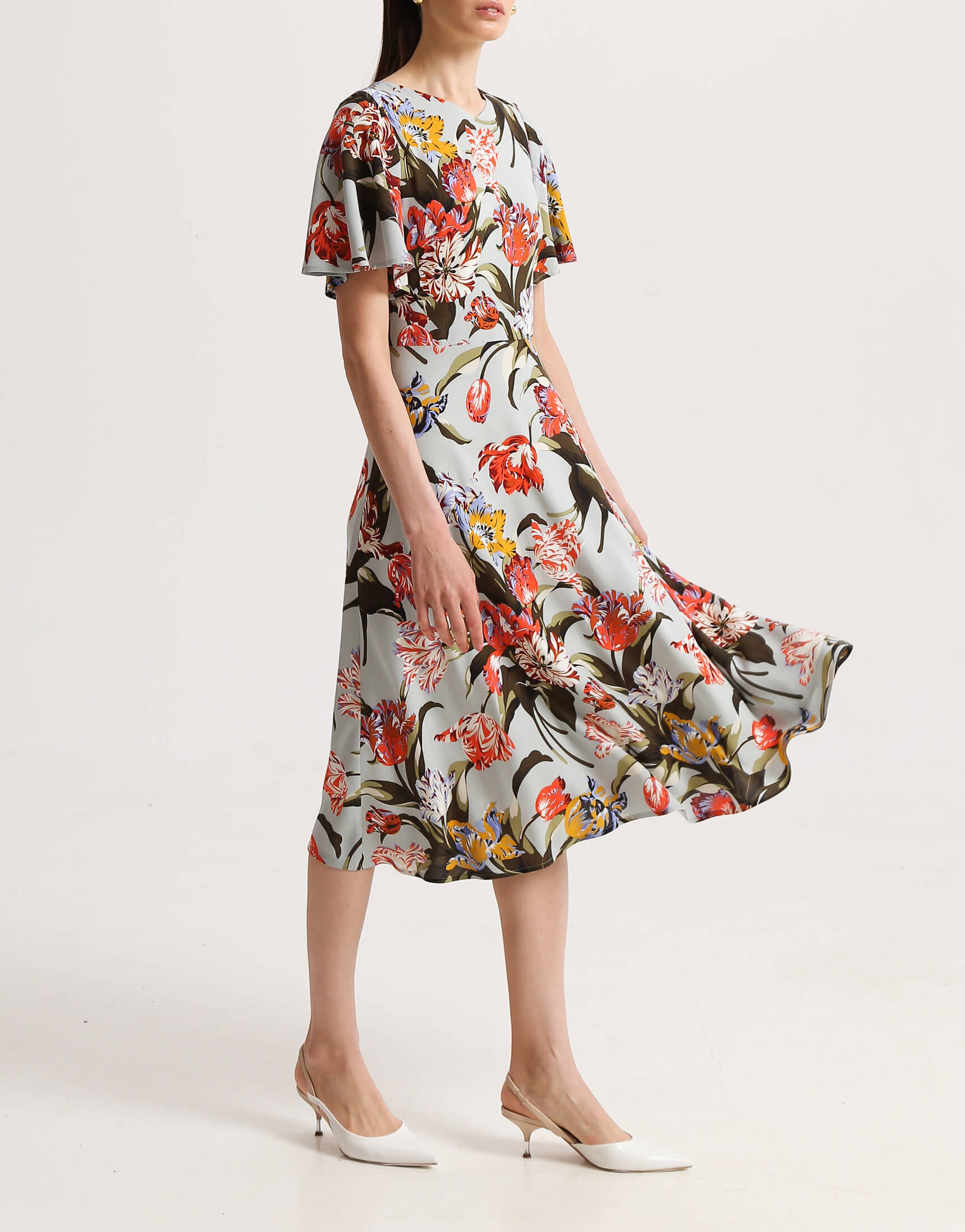Сукня напівприлеглого силуету з V-подібним вирізом на підкладці. Рукав крило прикриває верхню частину руки. Рельєфи на ліфі візуально роблять талію тоншою. Сукня відрізна по лінії талії зі спідницею напівкльош. Позаду застібається на блискавку.