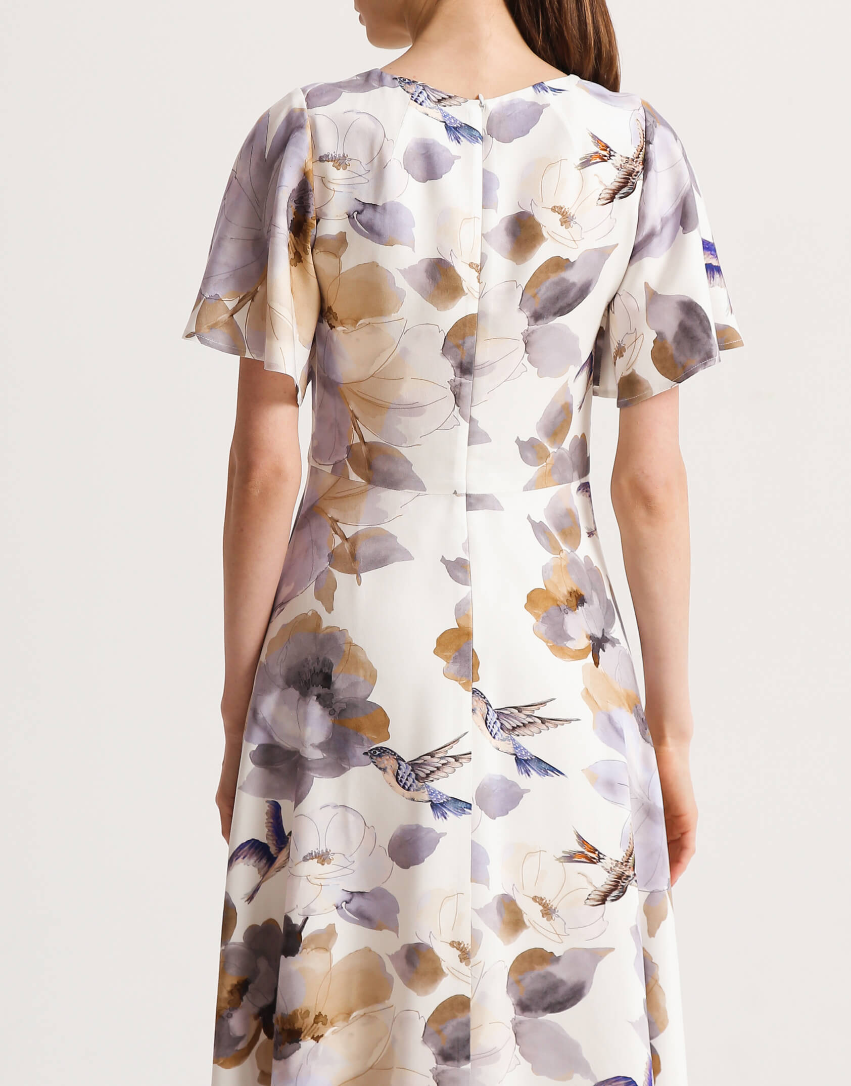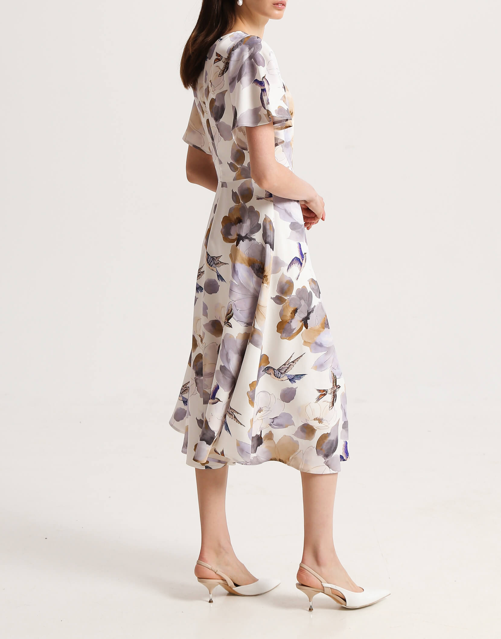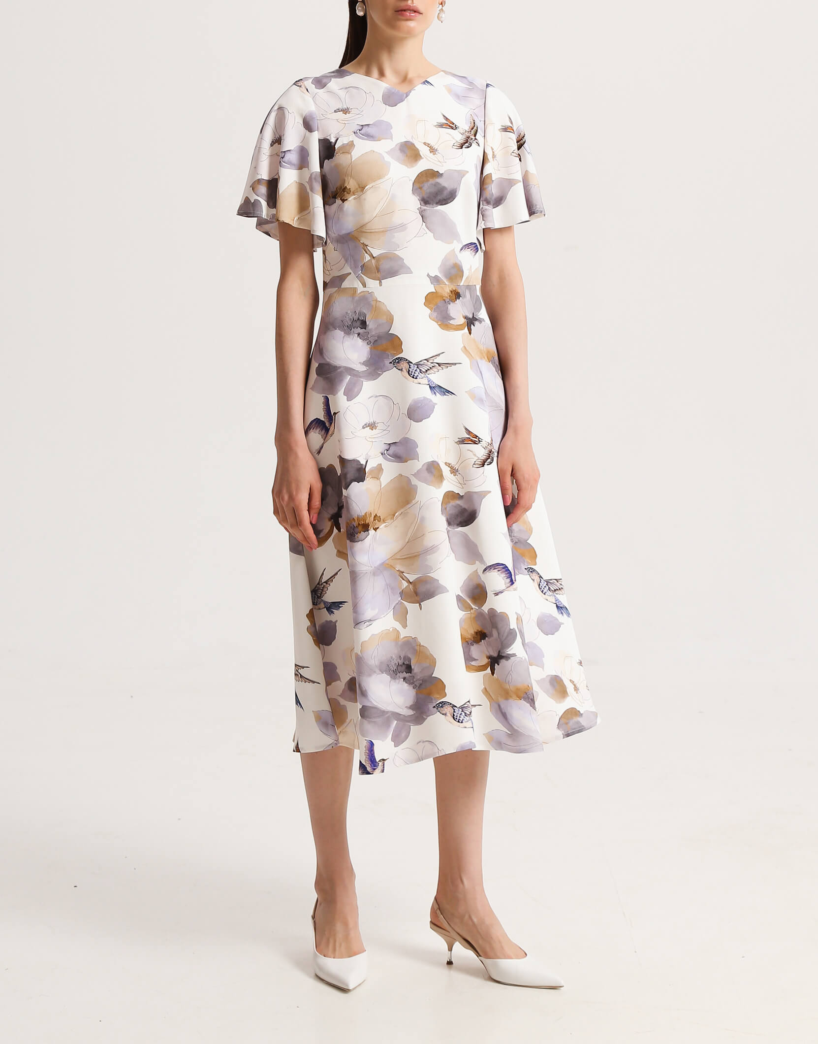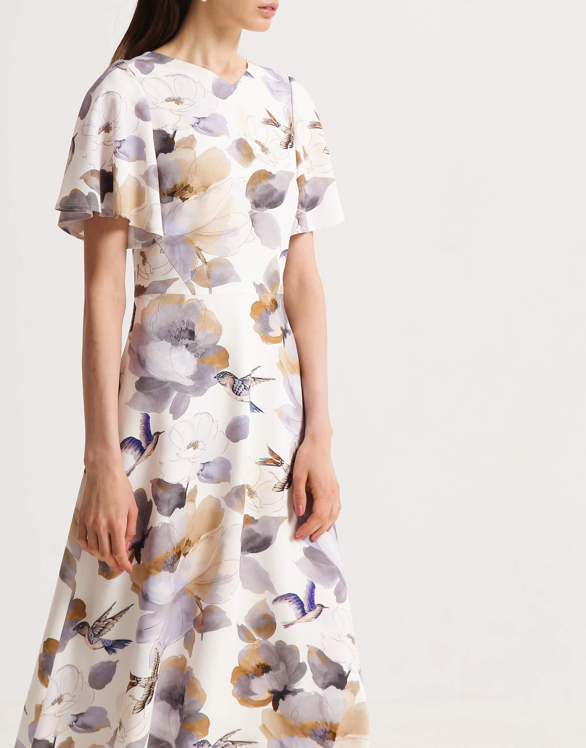 Сукня напівприлеглого силуету з V-подібним вирізом на підкладці. Рукав крило прикриває верхню частину руки. Рельєфи на ліфі візуально роблять талію тоншою. Сукня відрізна по лінії талії зі спідницею напівкльош. Позаду застібається на блискавку.