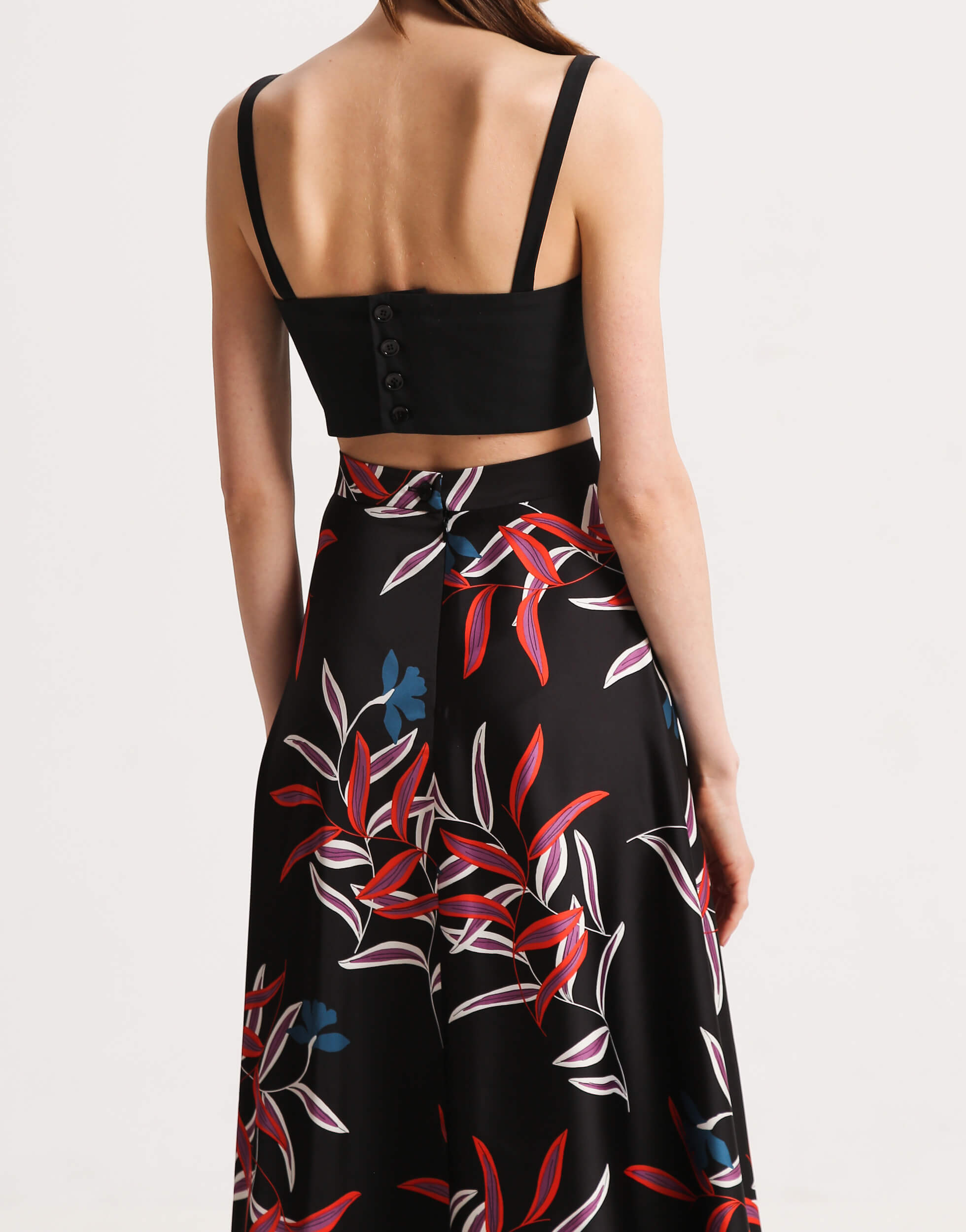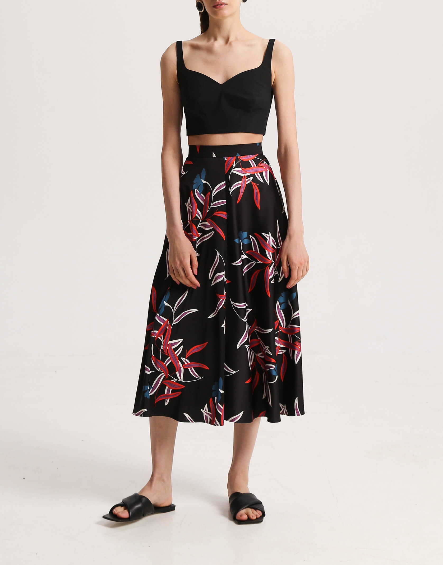 Сучасні спідниці клеш довжини міді. Виконана з легкої тканини, що струмує. Збоку застібається на блискавку та гудзик.