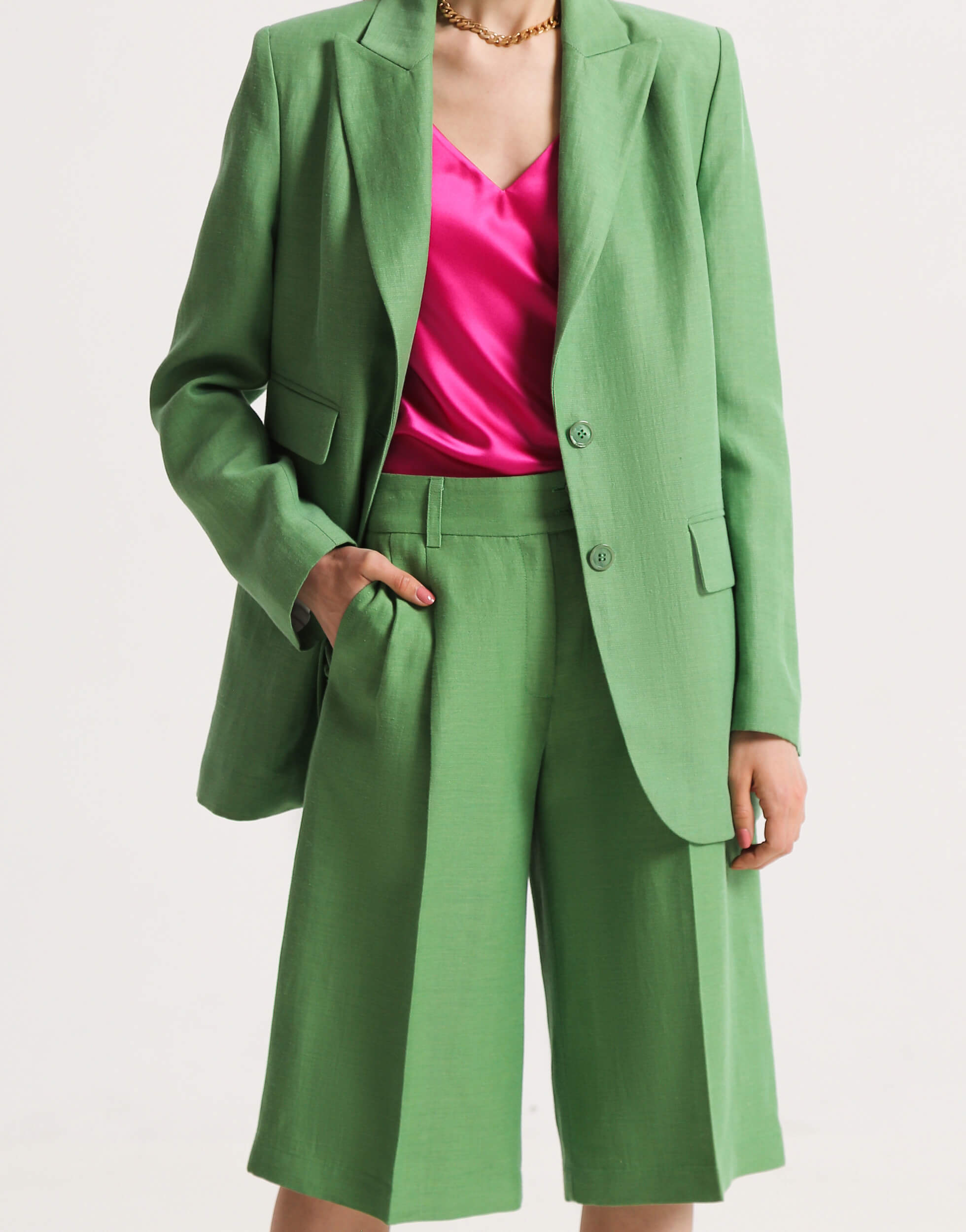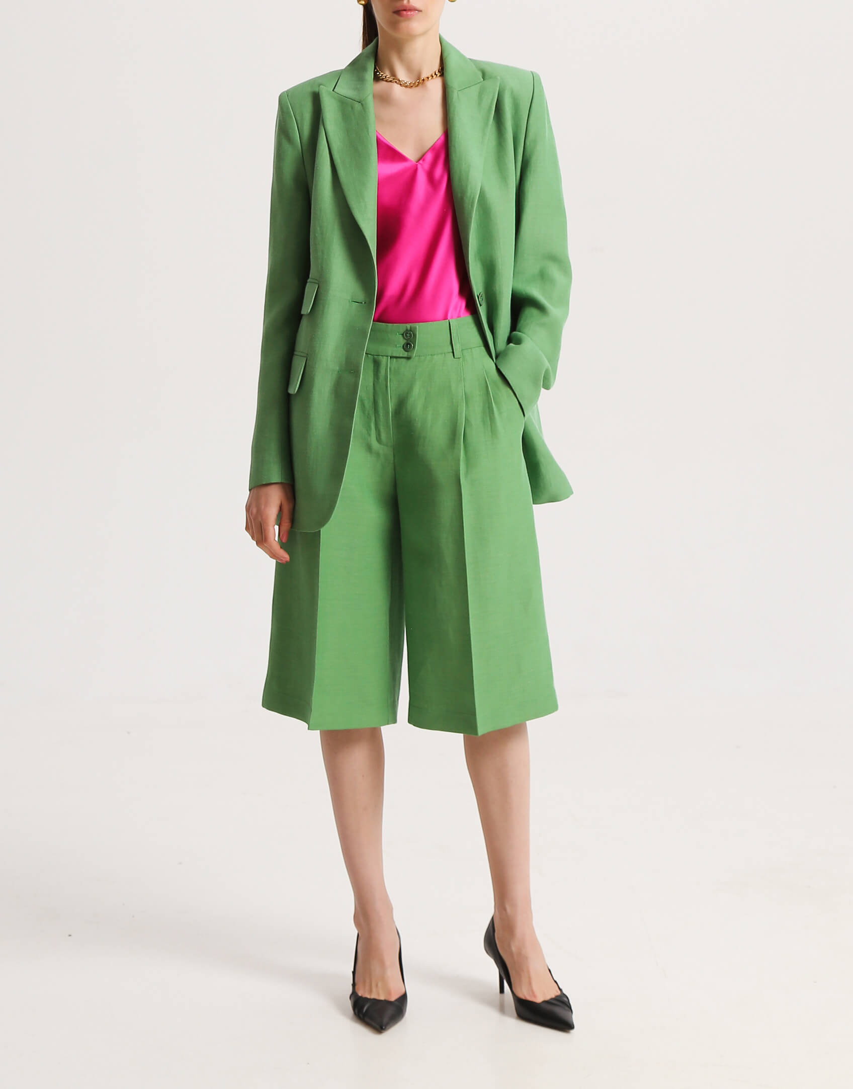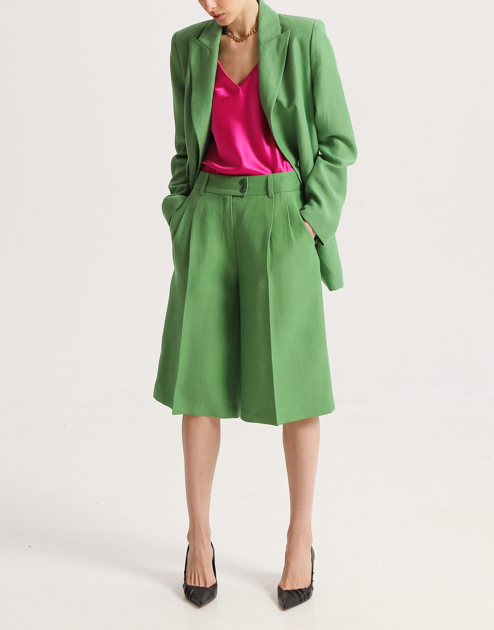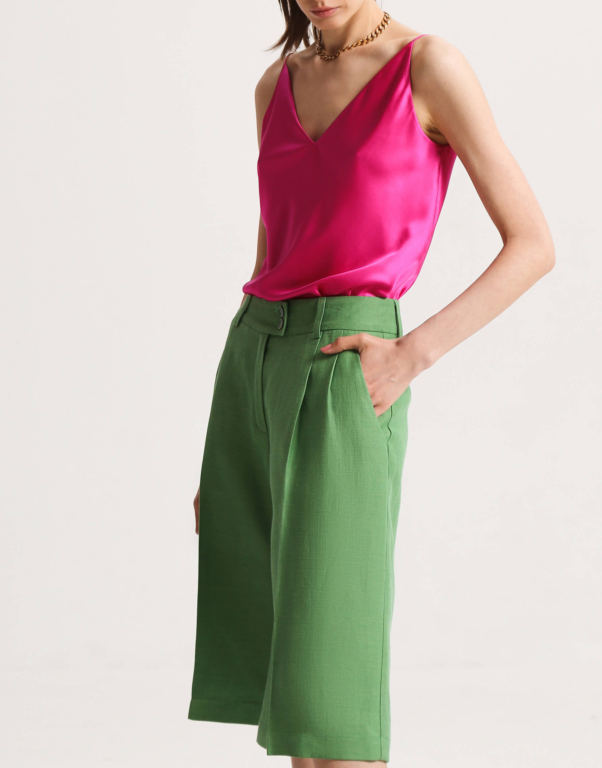 Прямі шорти-бермуди знову повернулися до моди. Ця модель подовжених шортів до колін з бічними кишенями підходить для жінок, які бажають виглядати стильно і яскраво, не оголюючи ноги. Висока посадка та широкий пояс, який застібається на 2 гудзики, підкреслюють талію. Свободу та обсяг забезпечують два защипи на поясі. Позаду 2 невеликі виточки для кращої посадки по фігурі.