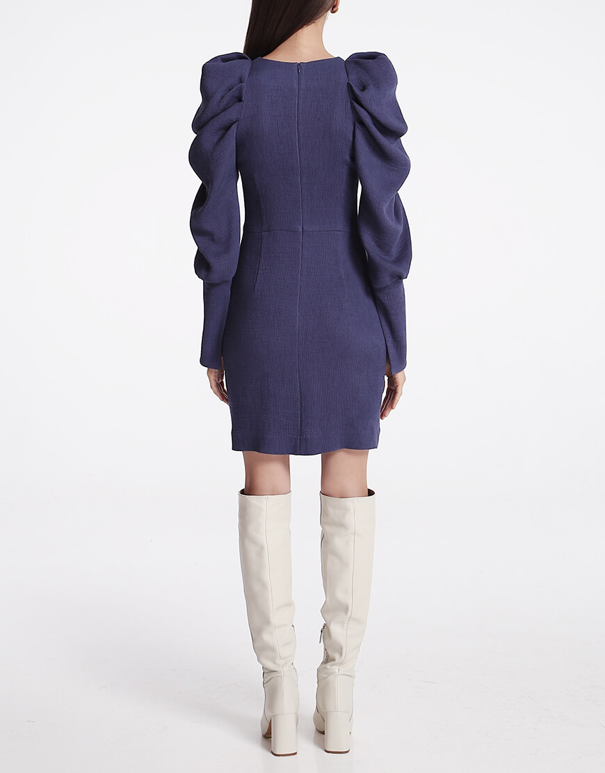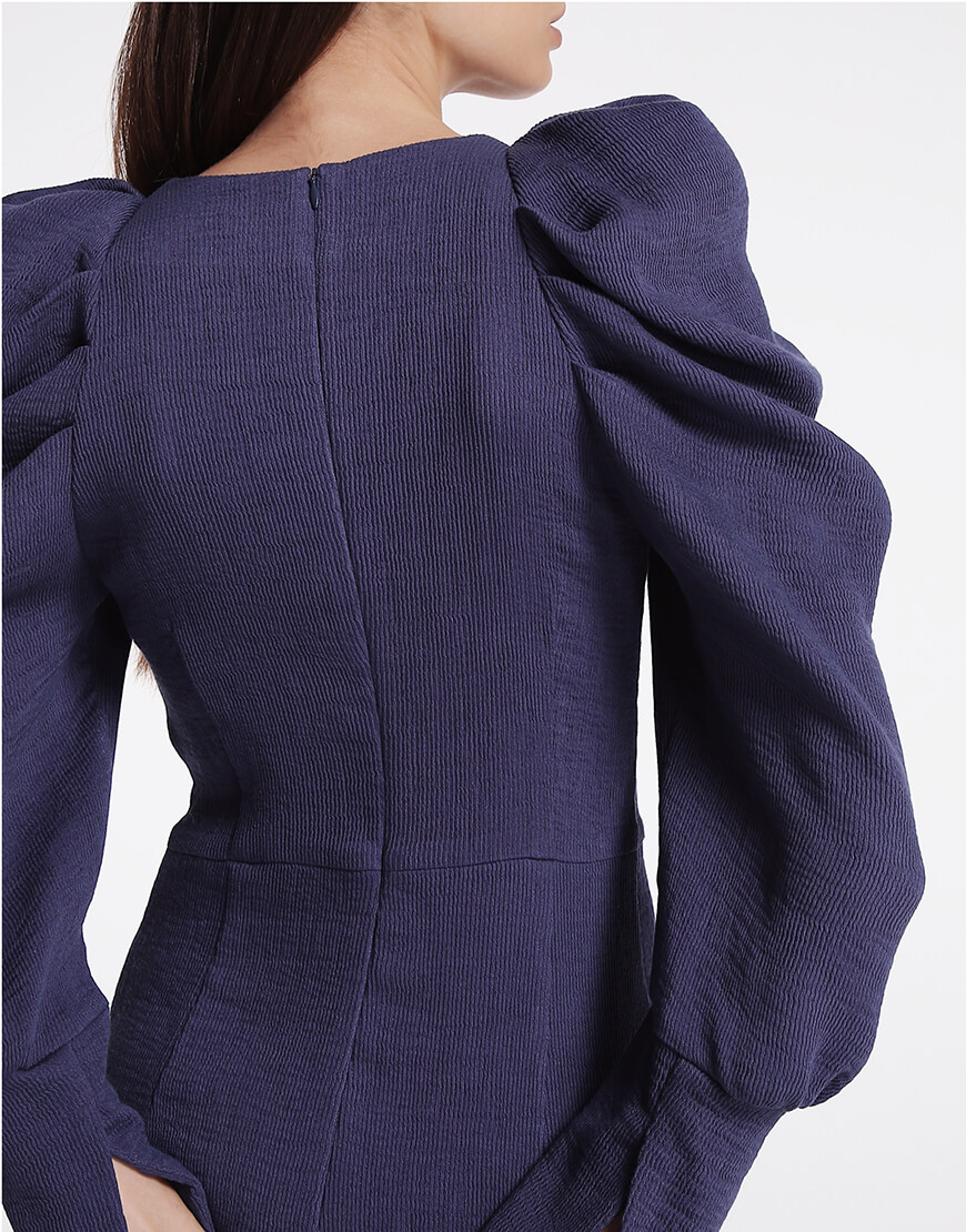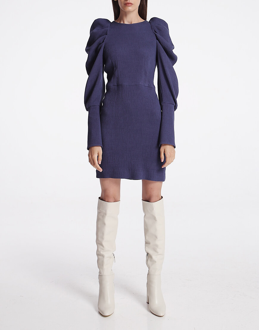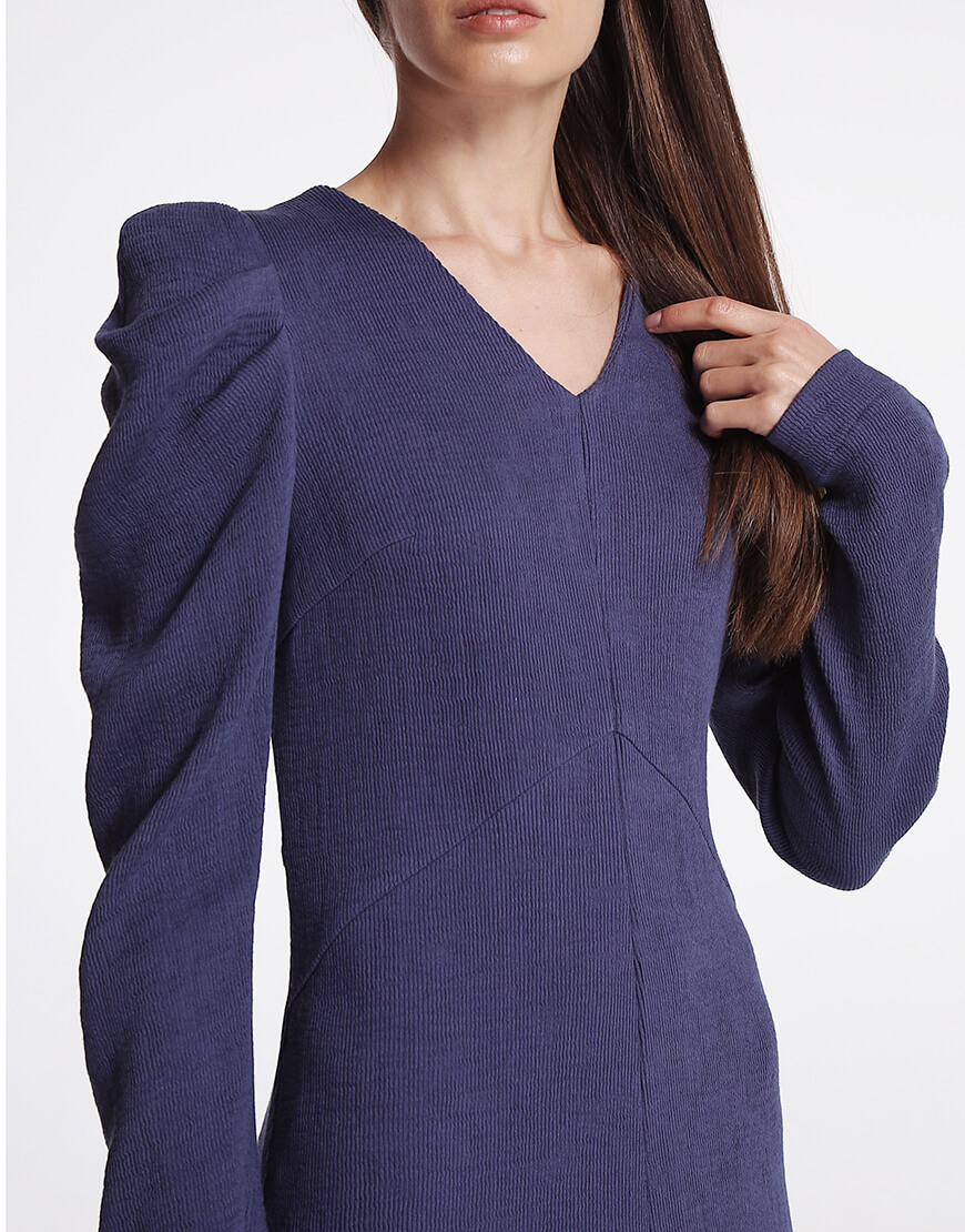 Сукня приталеного силуету, відрізна по лінії талії. Довгий, об’ємний рукав закінчується високим манжетом без застібки. Ззаду виріб застібається на блискавку. Довжина виробу 88 см.