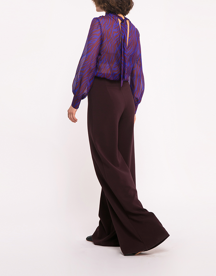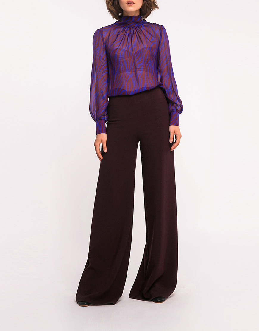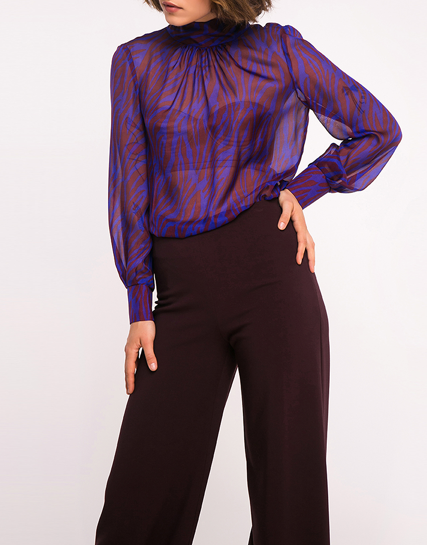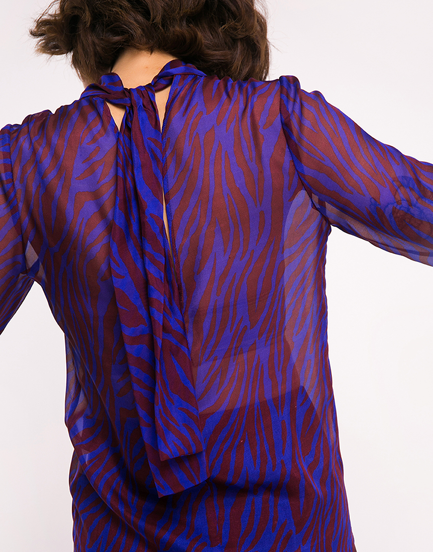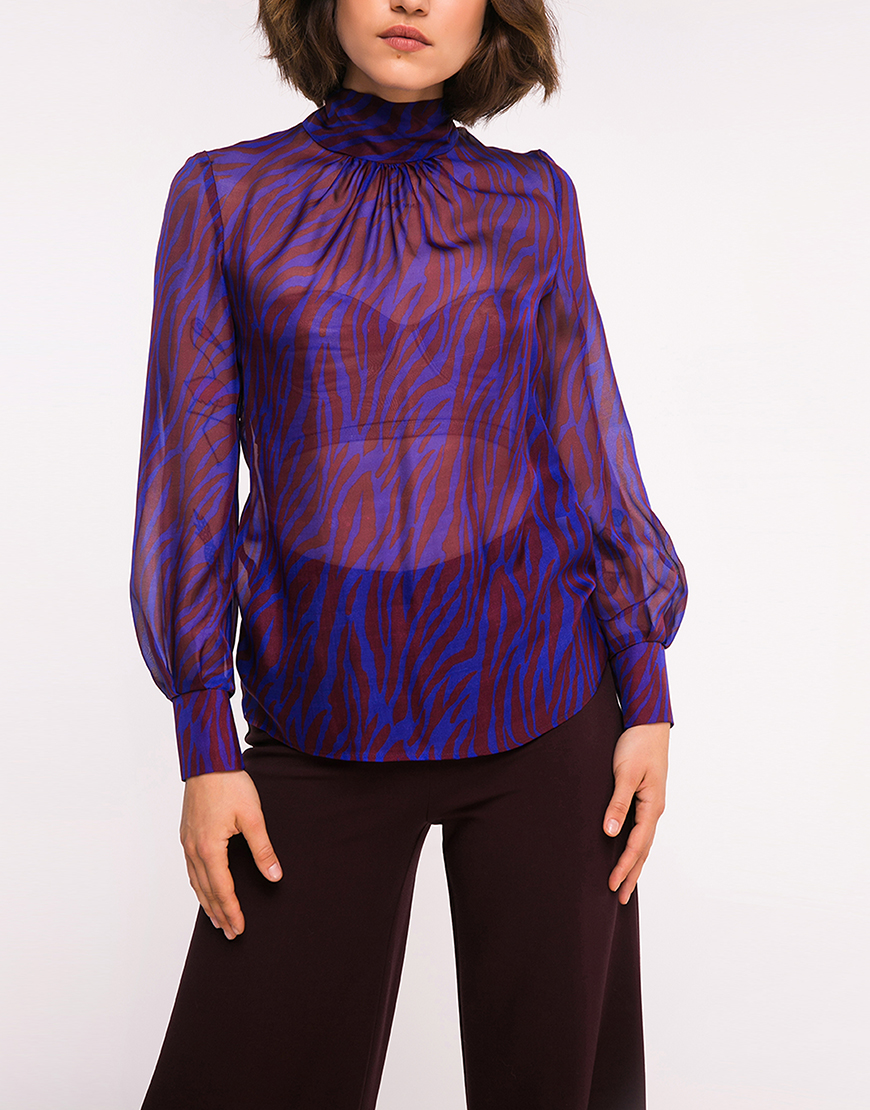 Повітряна, вільна напівпрозора шовкова блуза. Воротник-стойка, який переходить у шарф, дає можливість експериментувати з варіантами образів. Особливість моделі – V-подібний неглибокий виріз на спинці. Довгий рукав закінчується манжетом без застібки. Довжина виробу 65 см.