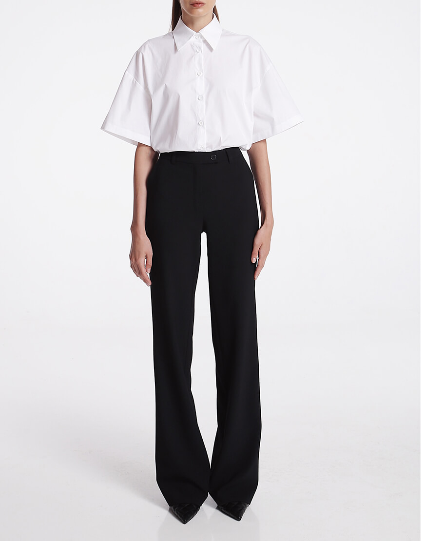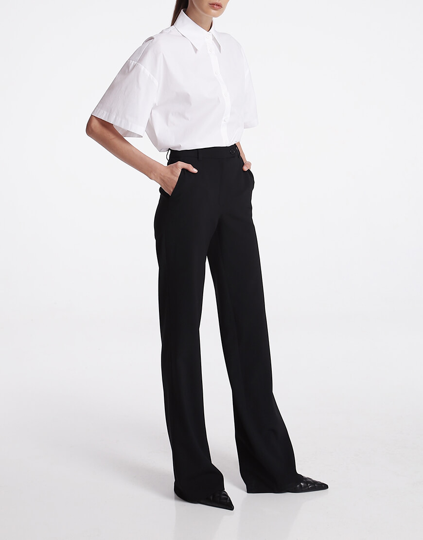 Класичні, середні за шириною прямі брюки. Брюки зі середньою посадкою з двома виточками ззаду. Ця модель із бічними кишенями чудово підходить для вихідного дня та відрізняється неймовірною зручністю і практичністю. Низ виробу оброблений оверлоком для індивідуального підгоняння під зріст жінки. Вкоротити брюки безкоштовно можна в шоурумі виробника.