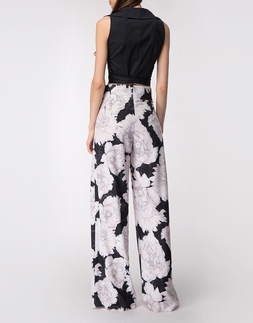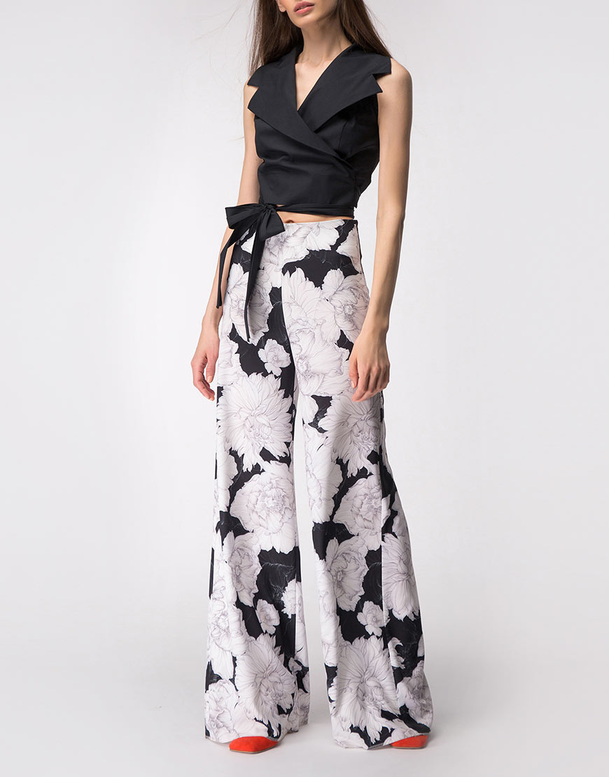Стильні розкльошені штани без кишень. Висока посадка візуально подовжує ноги і чудово виглядає на дівчат будь-якого зросту. Підійдуть на невелику та середню повноту стегна. Штани застібаються збоку на блискавку. Низ виробу оброблений оверлоком для індивідуального припасування виробу під зростання жінки. Укоротити штани безкоштовно можна у шоу-румі виробника. Довжина штанини з внутрішнього шва 89 см.