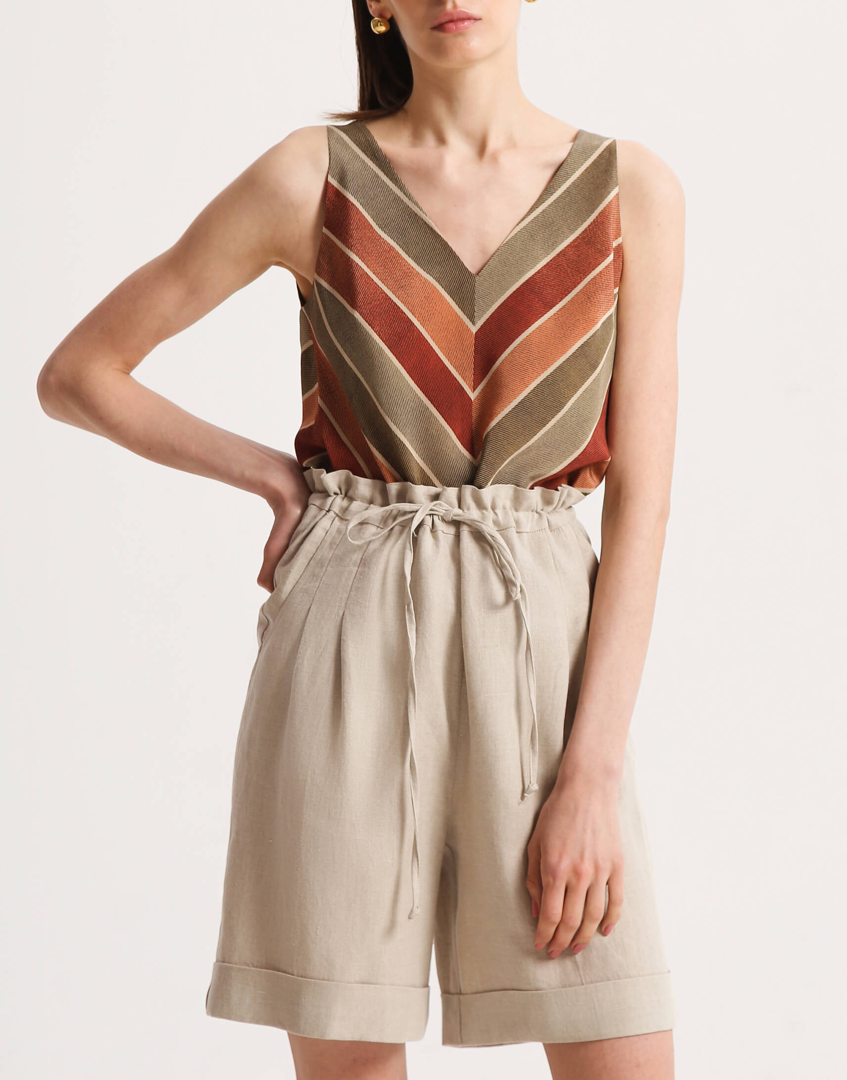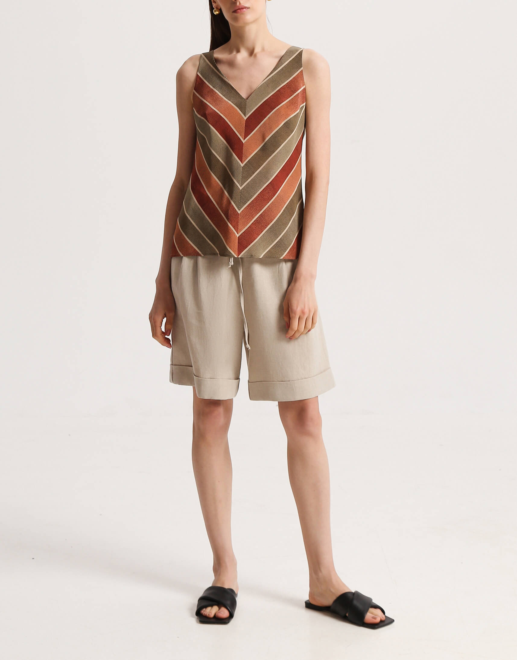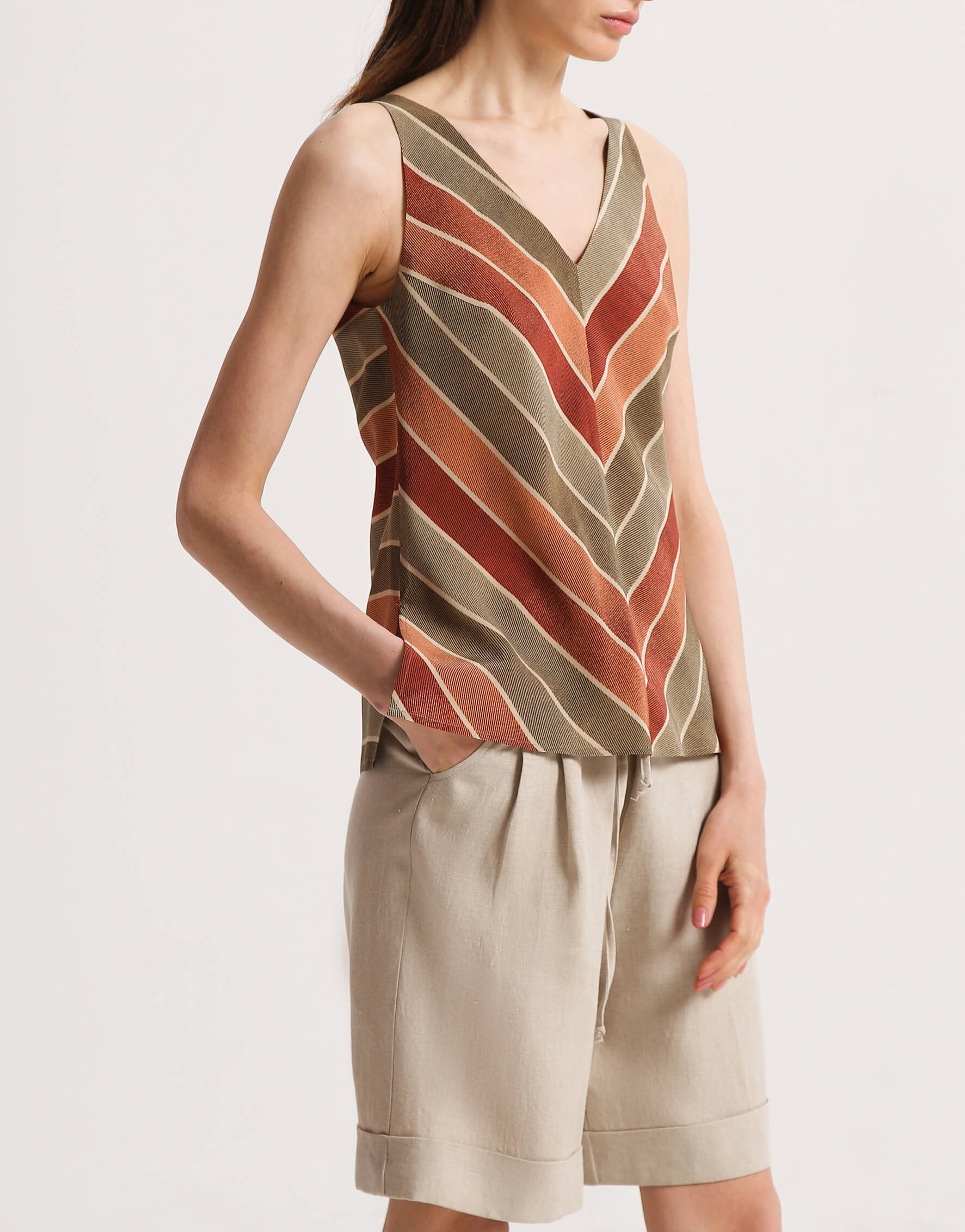 Пряма блуза з V-подібним вирізом. У верхній частині виконана з двох шарів шовку. З боків виробу – декоративні розрізи.