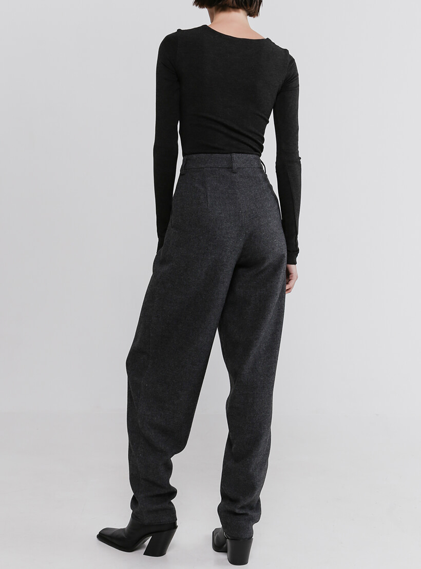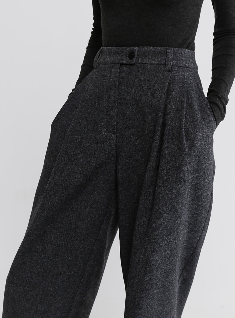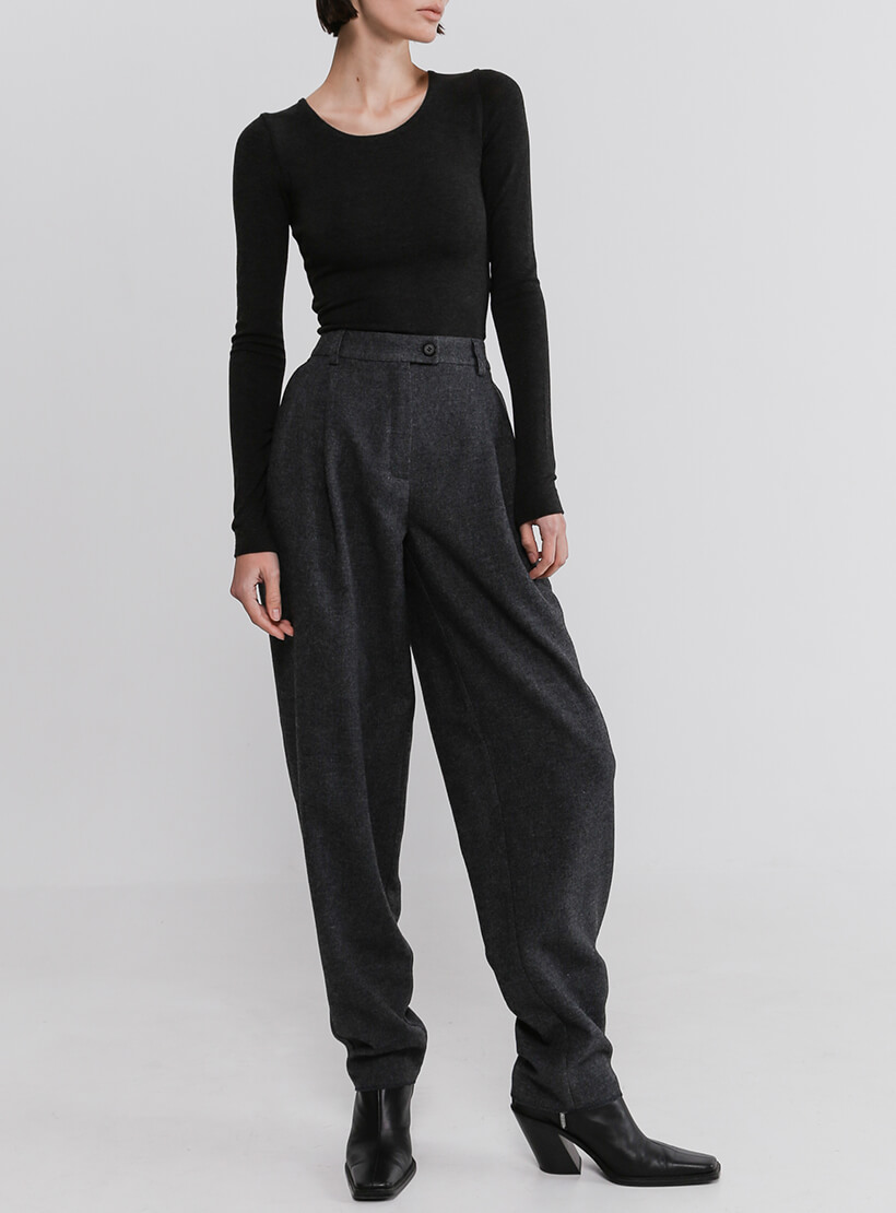 Доставка впродовж 2-5 робочих днівШерстяні брюки-банани з високою посадкою. Свободу і об’єм забезпечують два защіпи на поясі. шоу-руме виробника. Довжина виробу 108 см, довжина штанини внутрішньому шву 80 див.