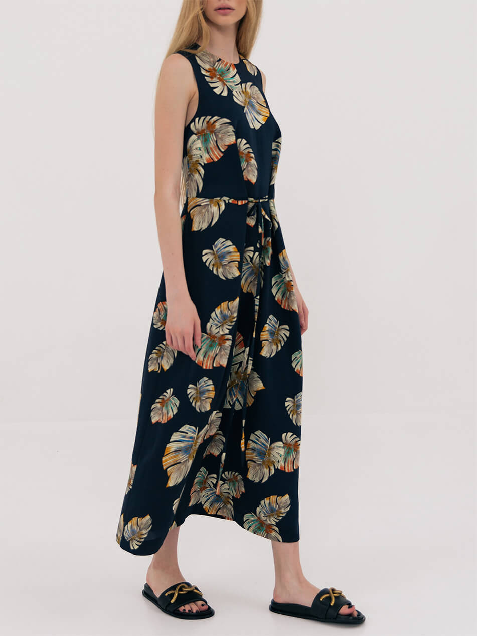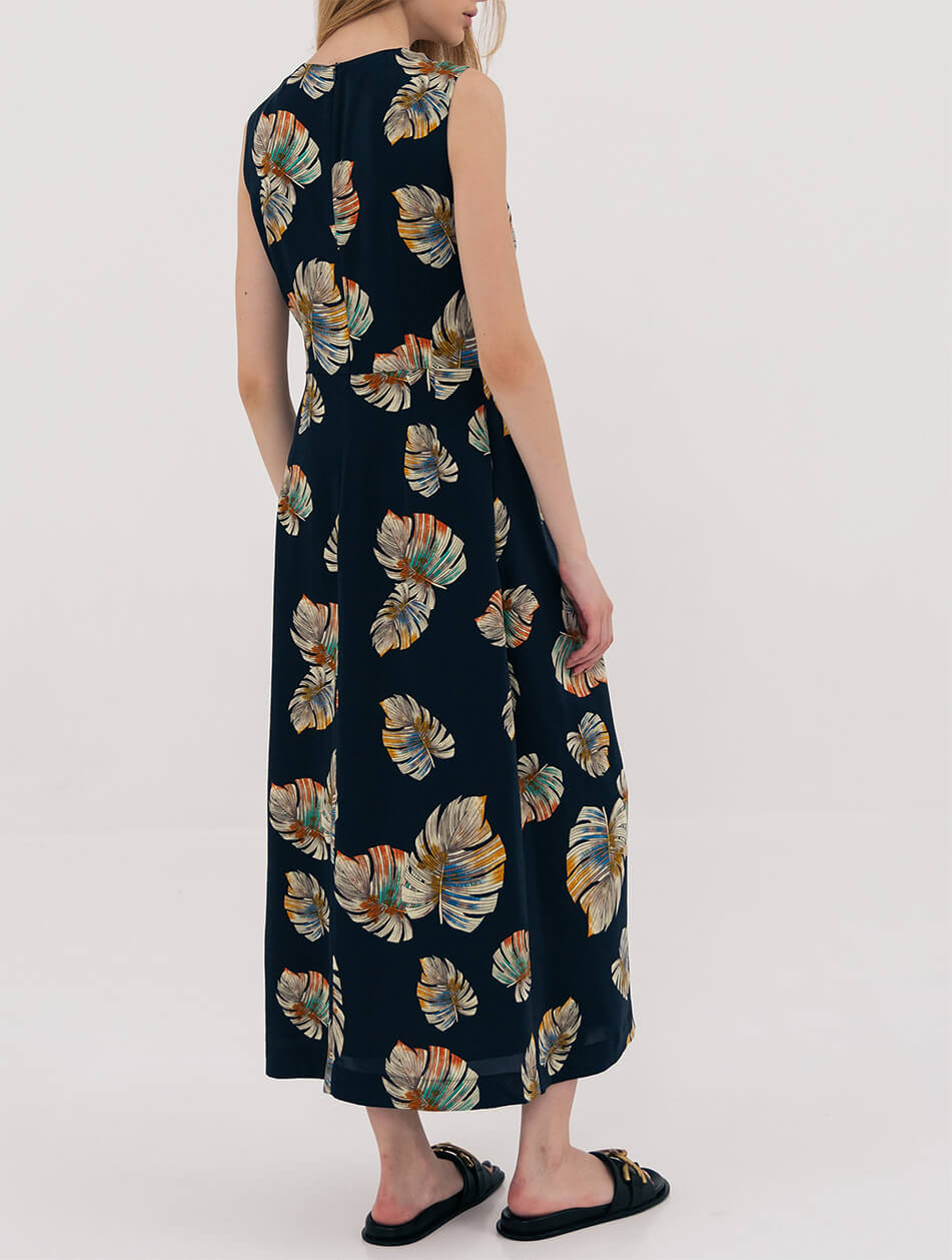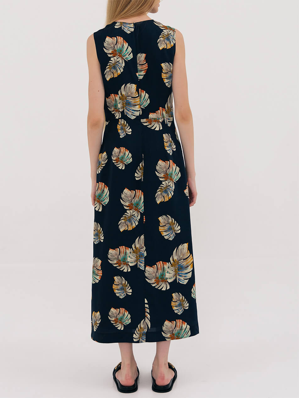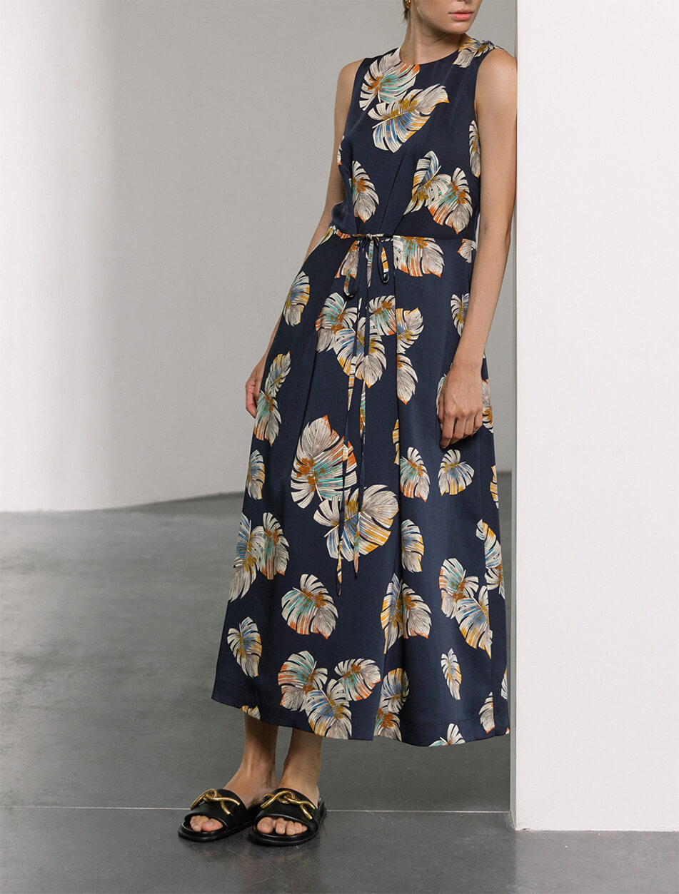 Сукня напівприлеглого силуету на підкладці. Попереду пришиті декоративні тасьми, за допомогою яких можна регулювати обсяг виробу в області талії. У бічних швах спідниці – кишені. Позаду сукня застібається на блискавку. Довжина виробу 129 см.
